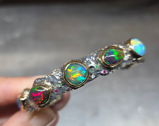 Rustic Silver & Gold Opal Gemstone Cuff Bracelet - Large #613