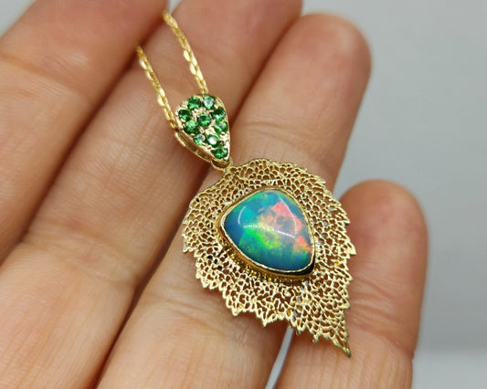 Opal Oak Leaf Pendant 14k Gold Necklace #466