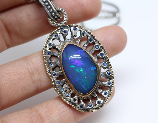 Blue Opal Rustic Sterling Silver & 14k Gold Pendant #246