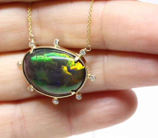 Black Opal & Diamond Pendant 14k Gold Gemstone Necklace #260