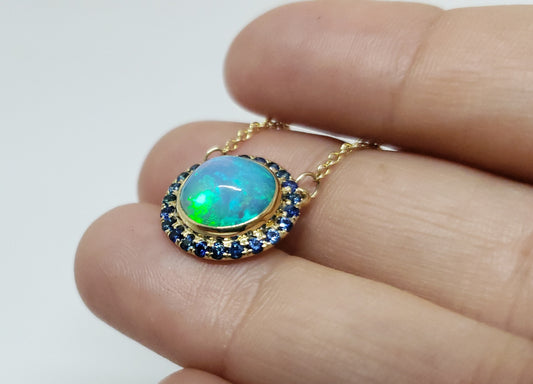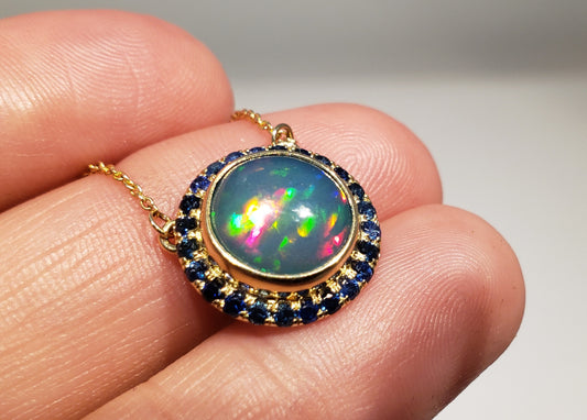 Blue Opal & Sapphire Pendant 14k Gold Necklace #162
