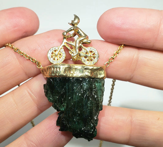 Carved Emerald & Diamond Bicycle Pendant - 14k Gold #167