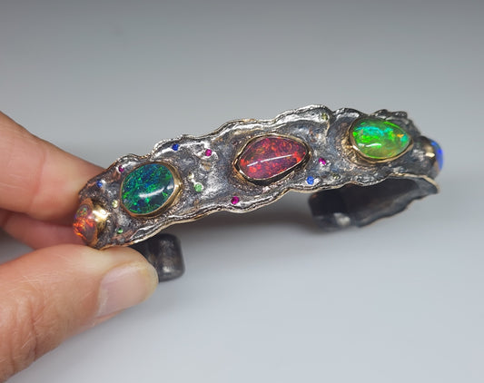 Rustic Silver & Gold Opal Gemstone Cuff Bracelet - Large #613