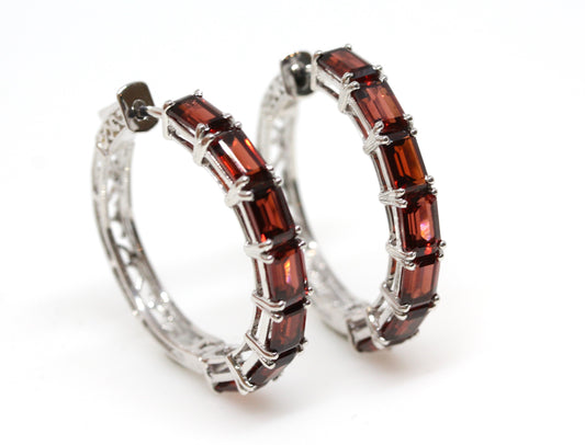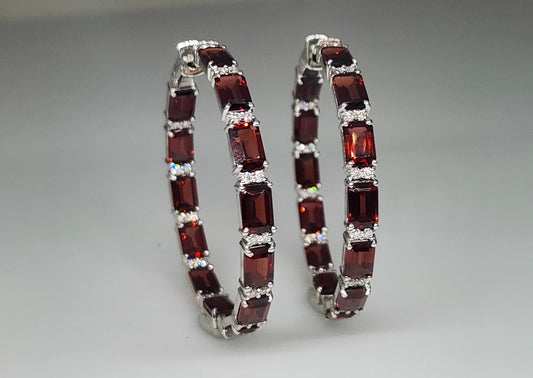 Large Red Garnet Gemstone Hoop Earrings Sterling Silver #429