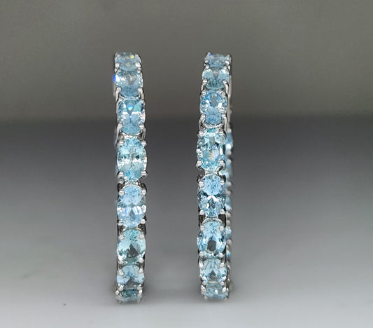 Blue Aquamarine Gemstone Hoop Earrings Sterling Silver #434