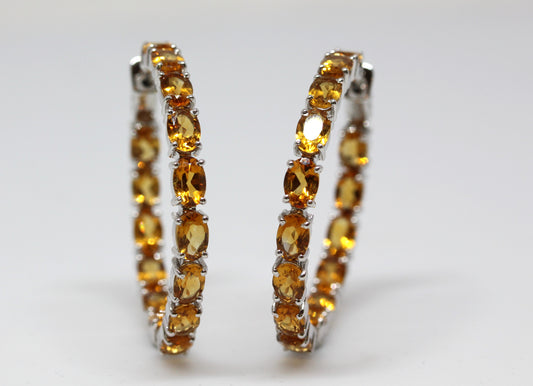 Natural Yellow Citrine Gemstone Hoop Earrings Sterling Silver #336