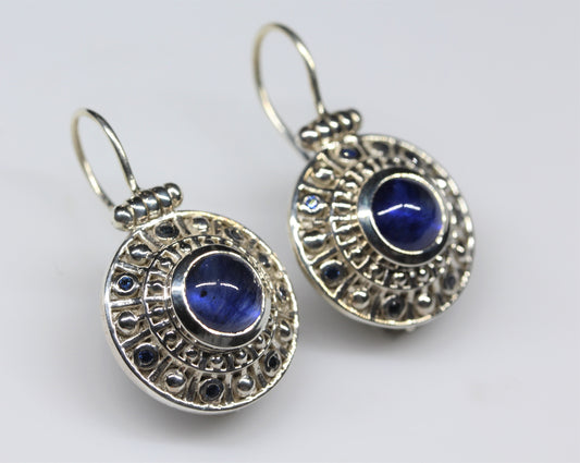 Blue Sapphire Medallion Dangle Earrings Sterling Silver #285