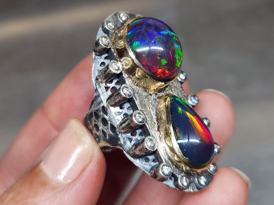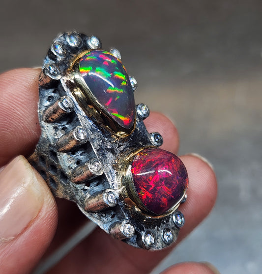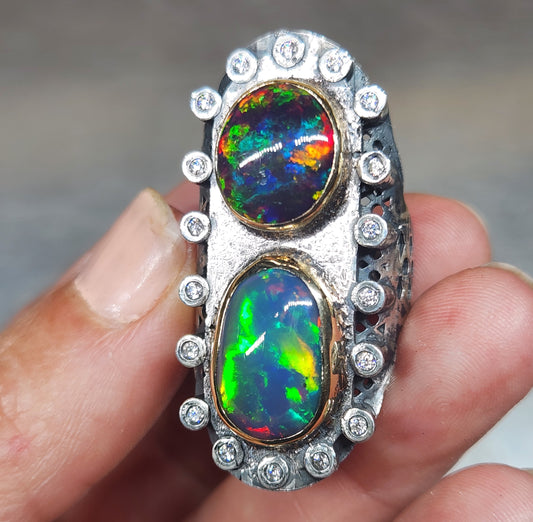 Opal & Moissanite Rustic Sterling Silver & Gold Ring #593