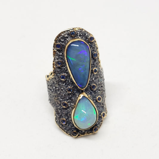 Large Blue Opal Doublet Ring 14k Yellow Gold