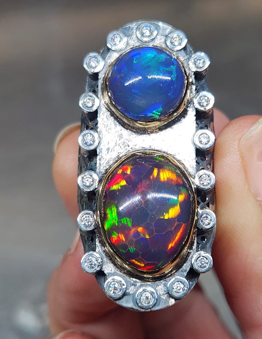 Opal & Moissanite Rustic Sterling Silver & Gold Ring #590