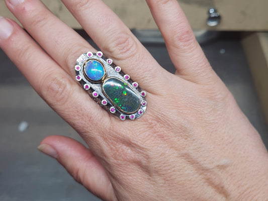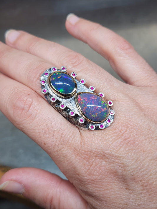 Opal & Ruby Rustic Sterling Silver & Gold Ring #587