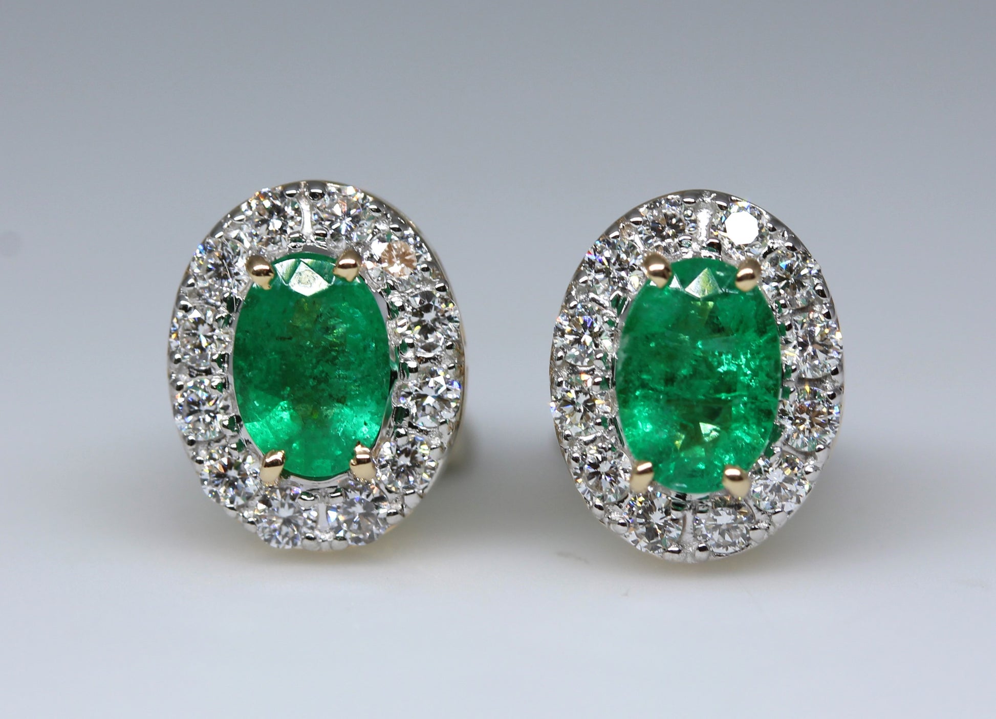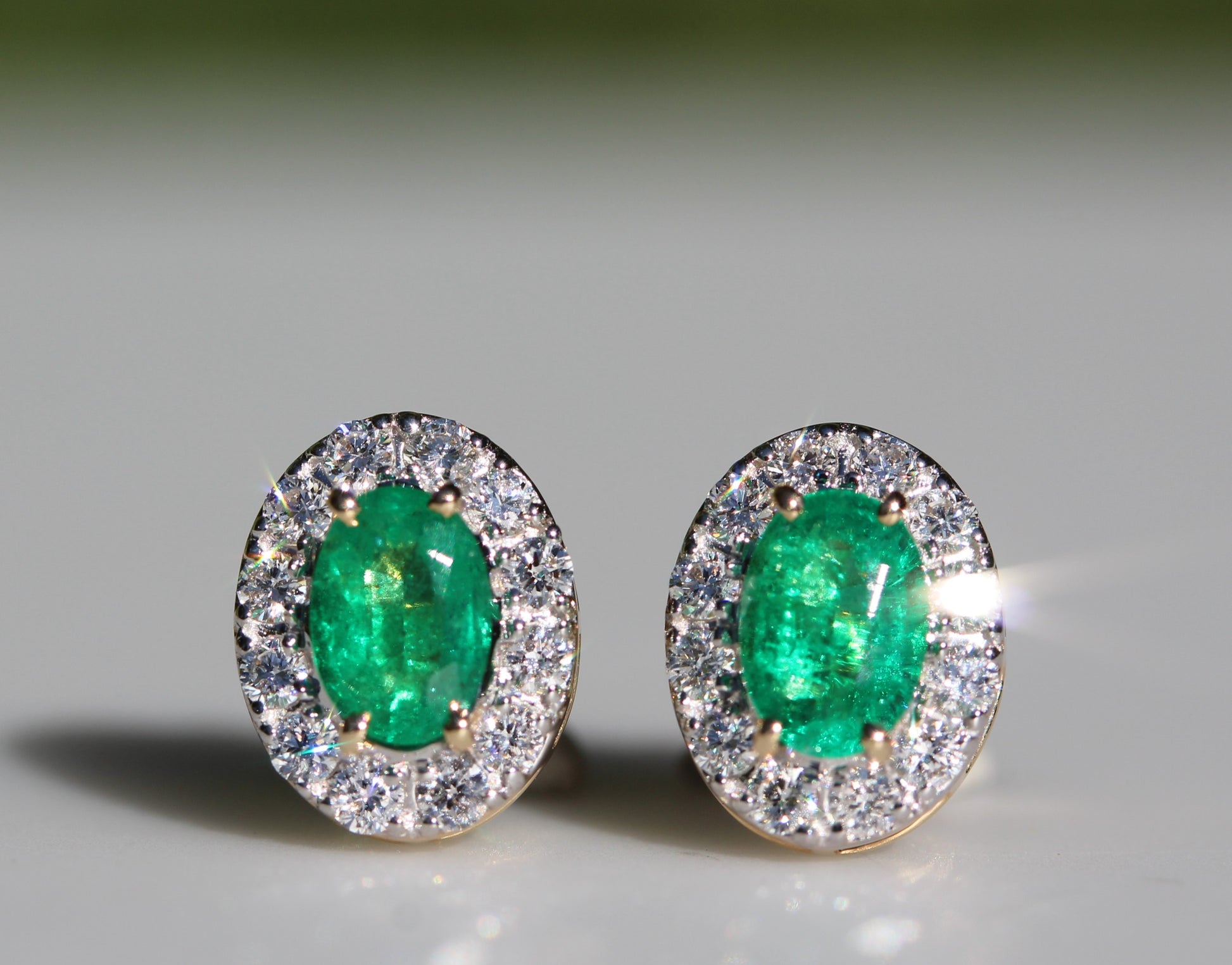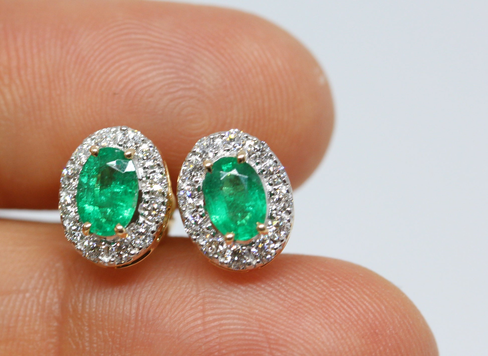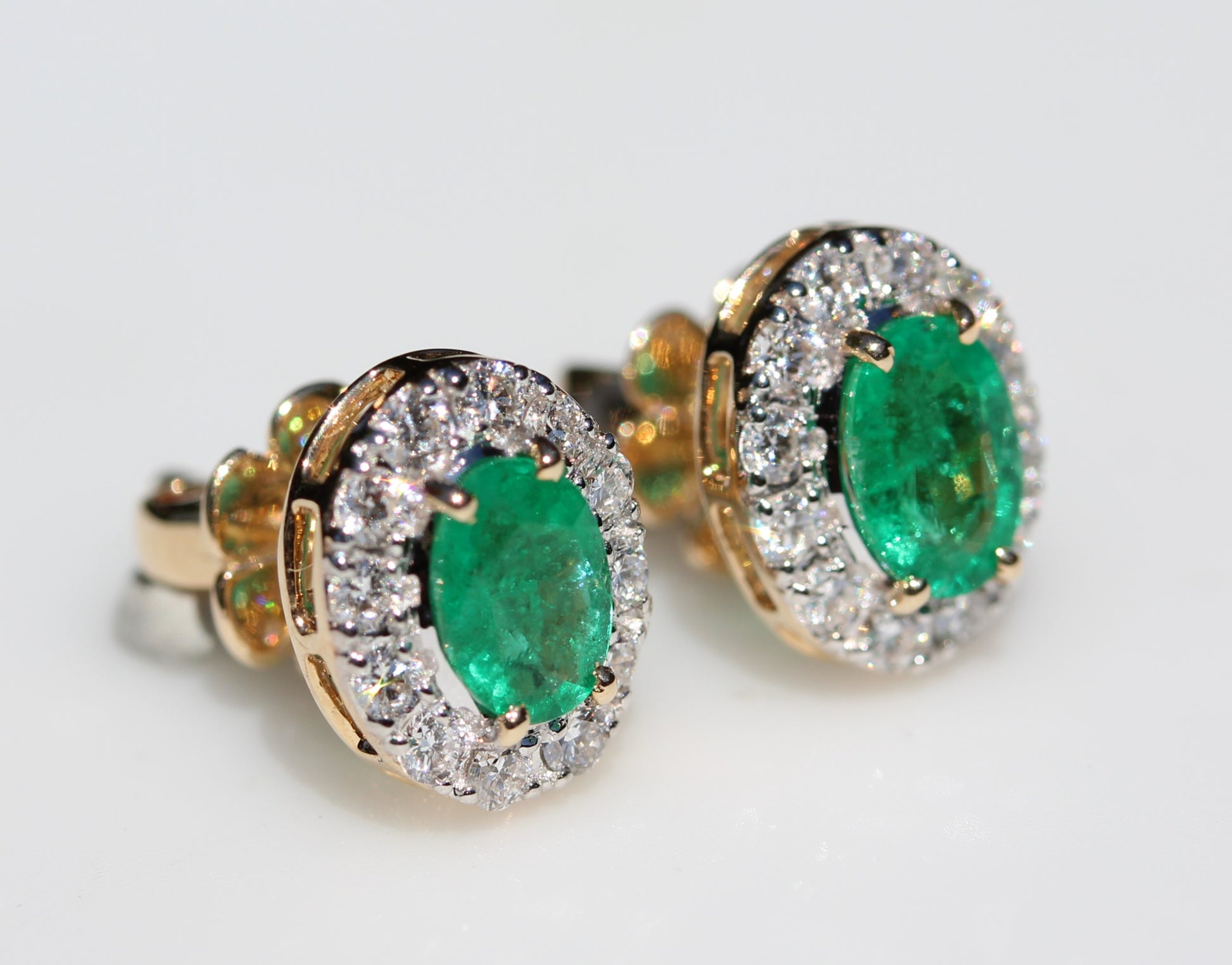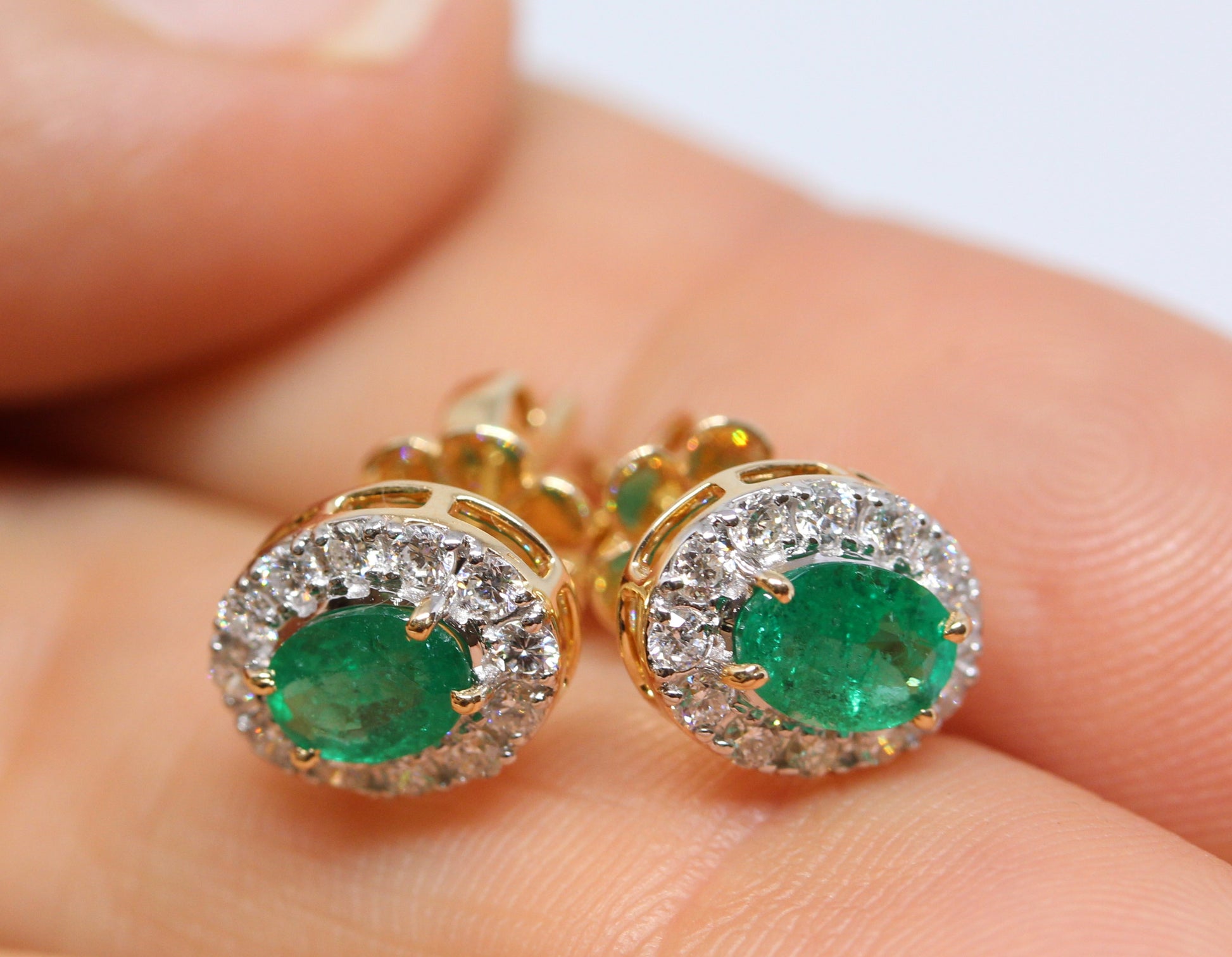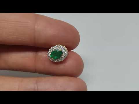 A pair of emerald and diamond stud earrings in solid 14k yellow gold.
