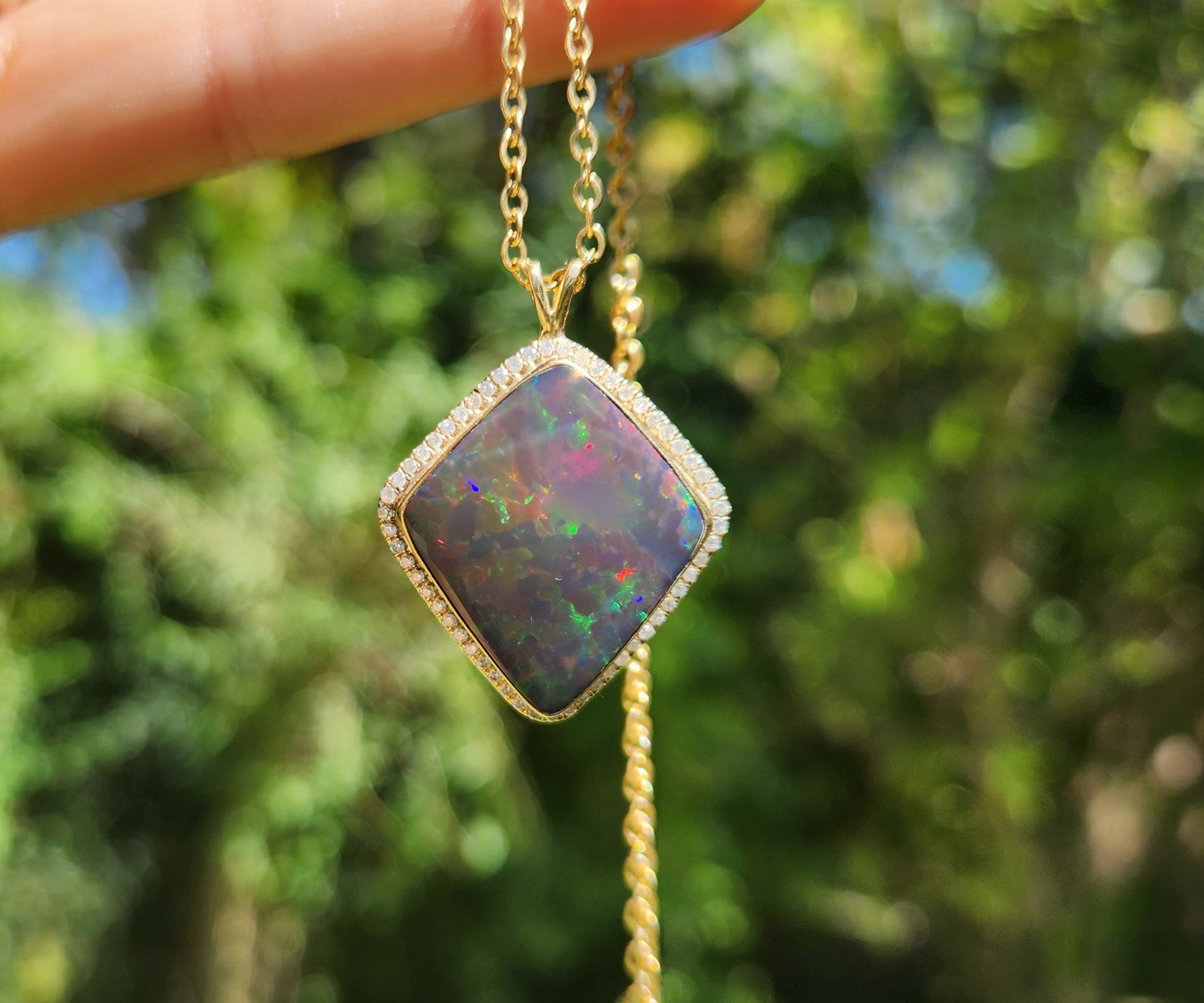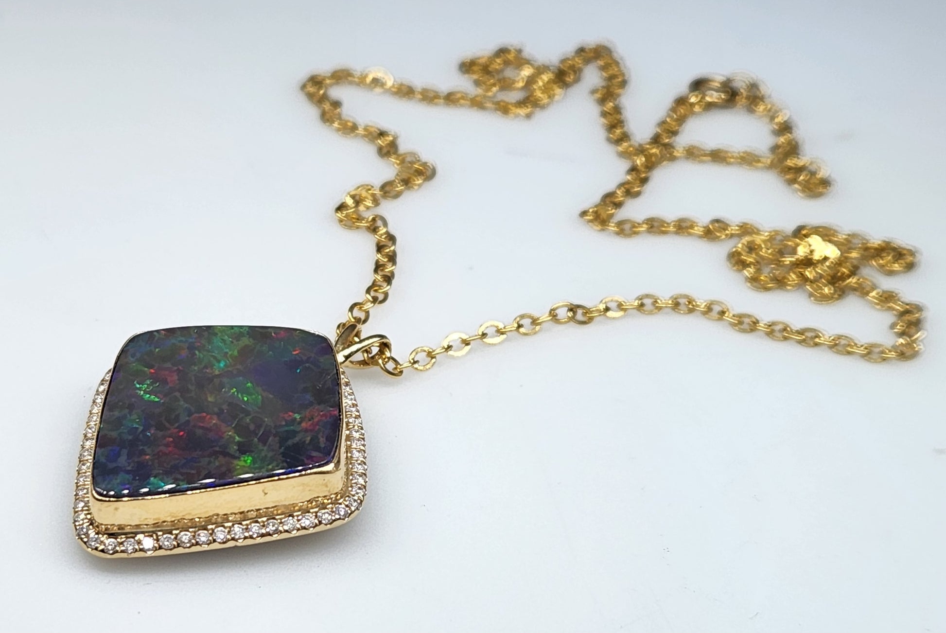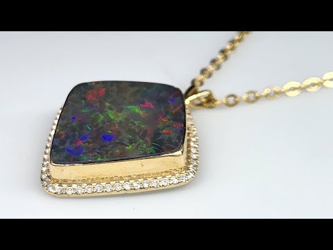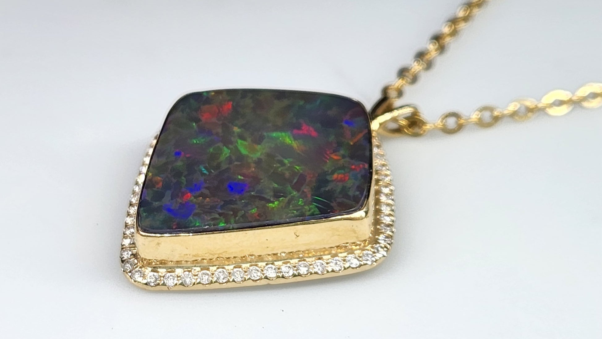 A 100% natural black opal with colorful fire patterns set in 14k yellow gold with a solid 14k gold chain, and white diamond accents surrounding the opal.