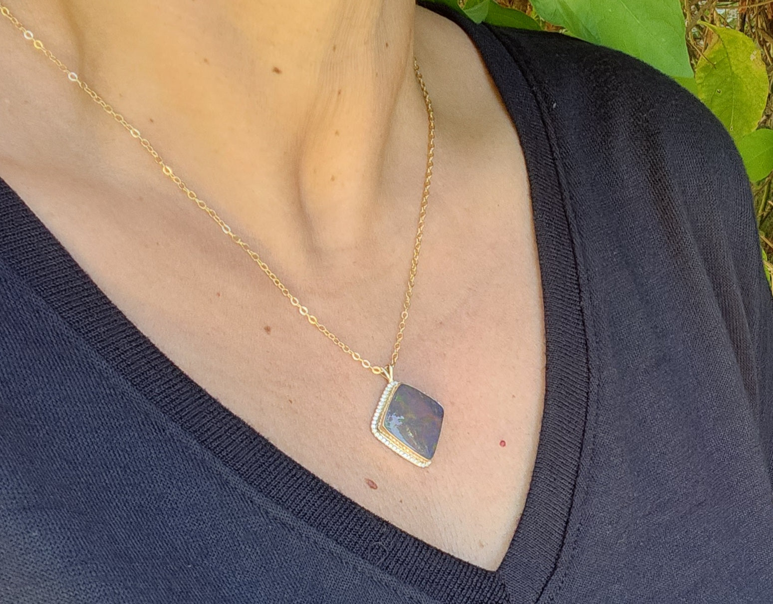 Black Opal & Diamond Pendant 14k Gold Gemstone Necklace #414