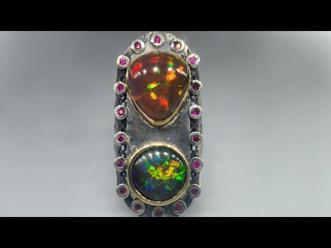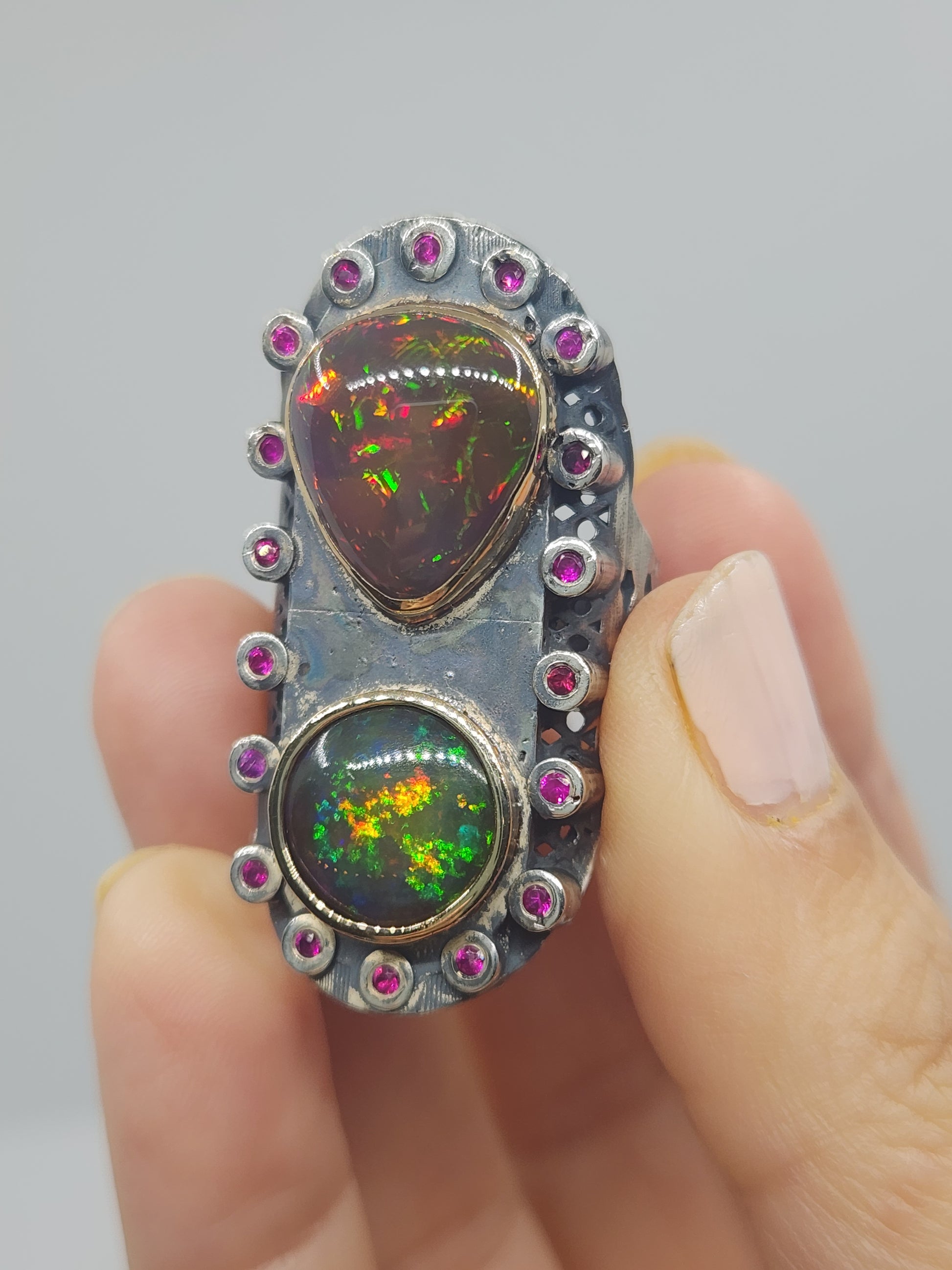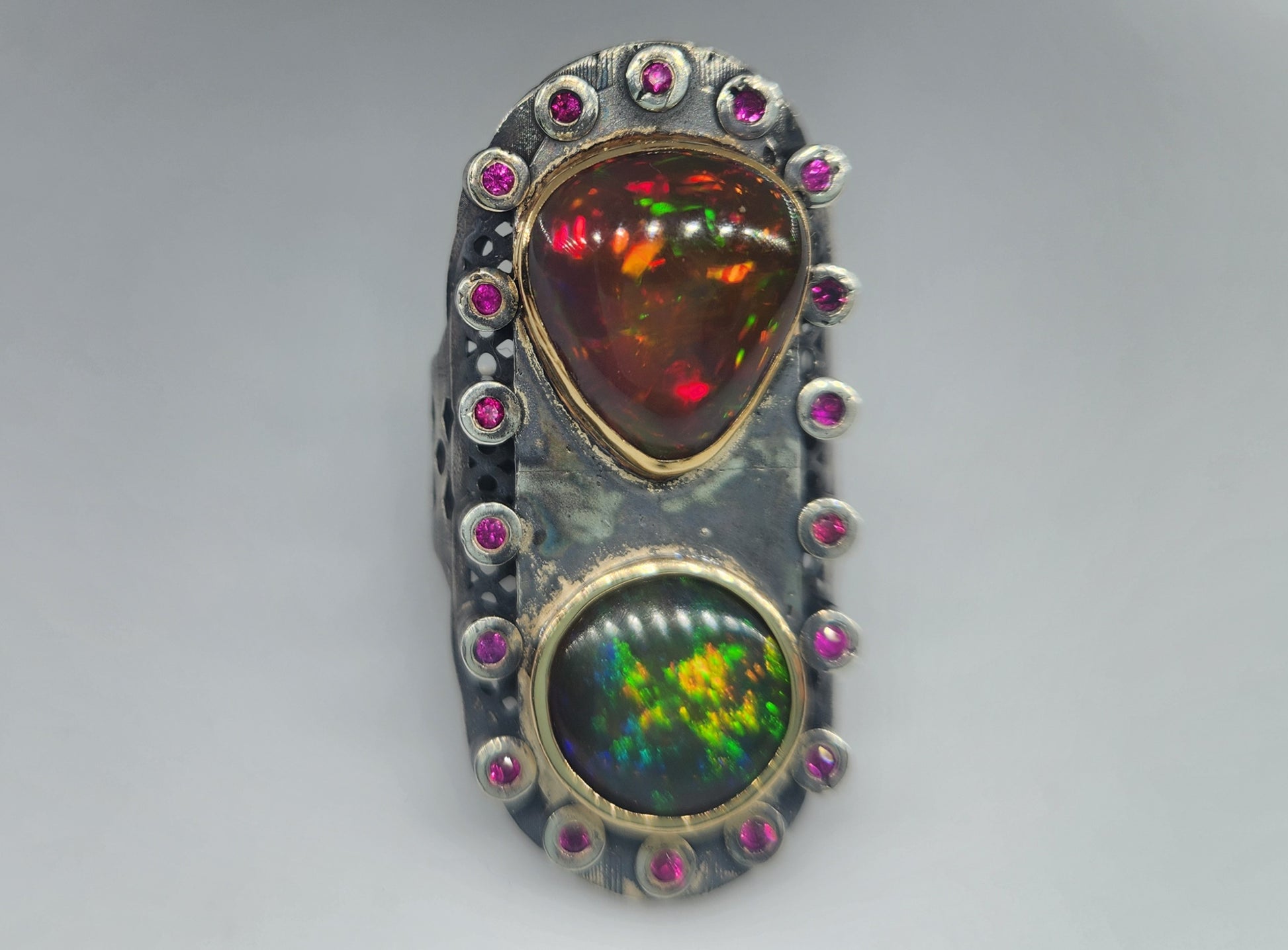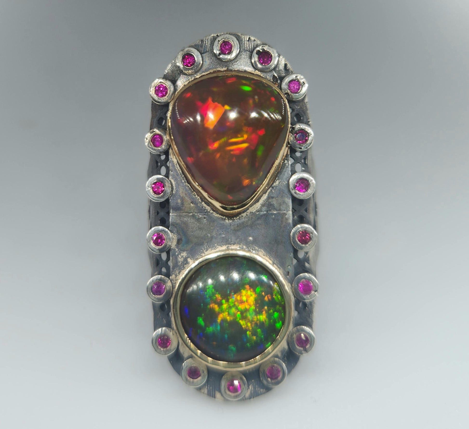 Two bright and colorful Ethiopian opals , set in a Sterling Silver ring with 14k gold bezels. The opals are surrounded by ruby accent stones.