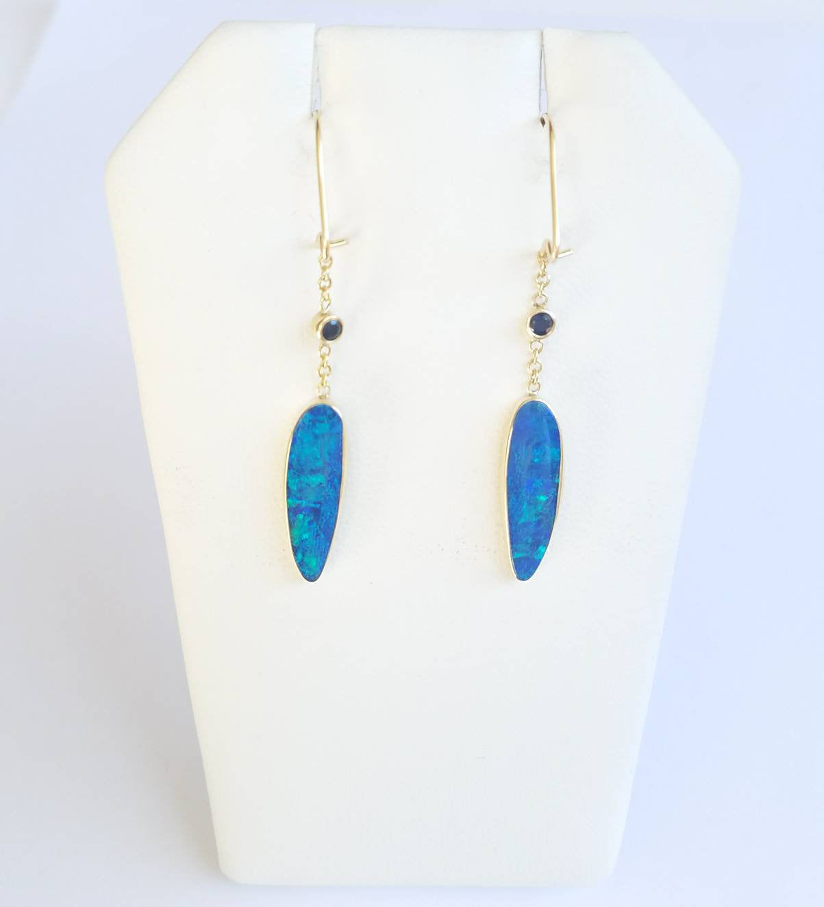 A fantastic pair of Australian blue opal doublet set into 14k Gold Earrings, with sapphire accent stones. The earrings have a secure hook backing. The opals have vibrant blue and green fire colors.