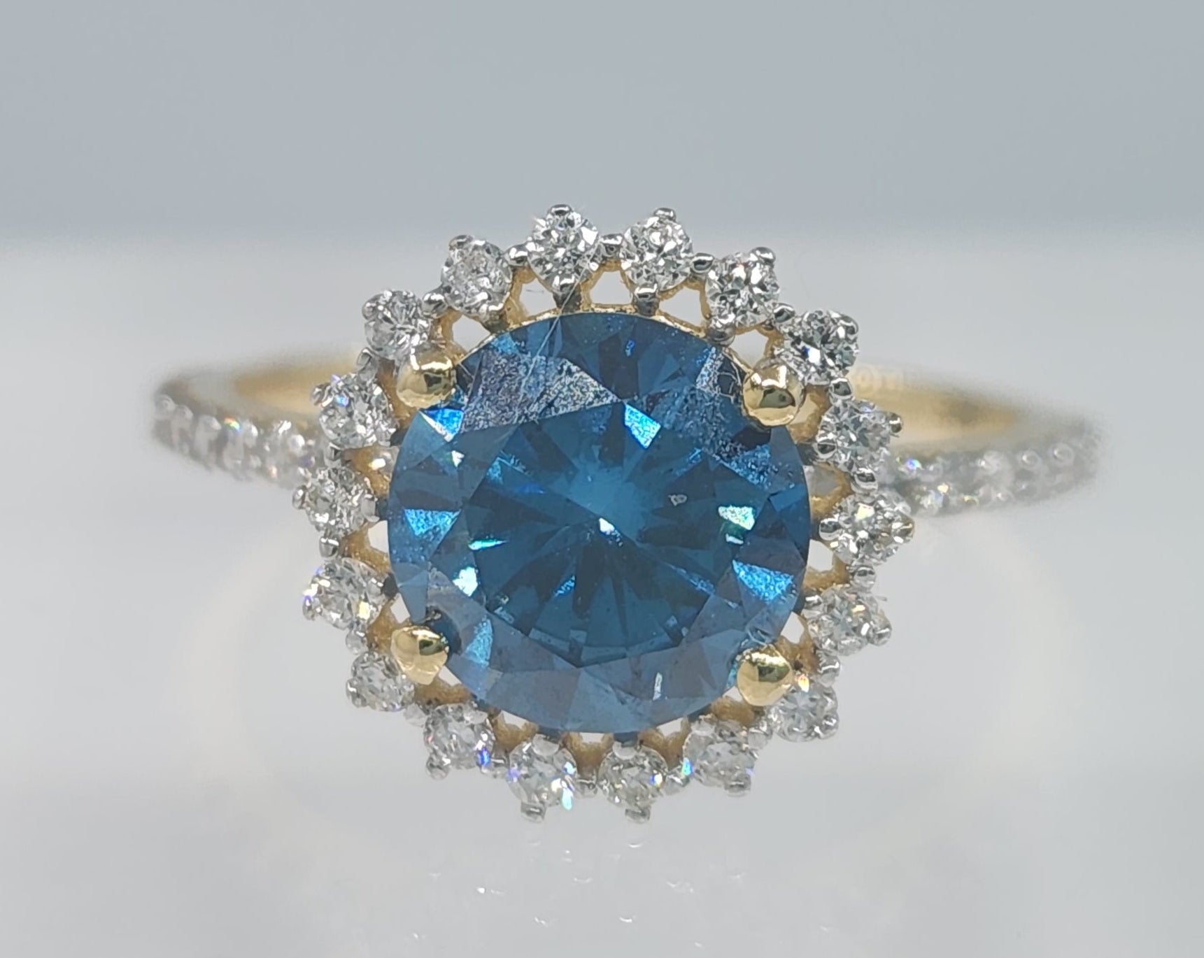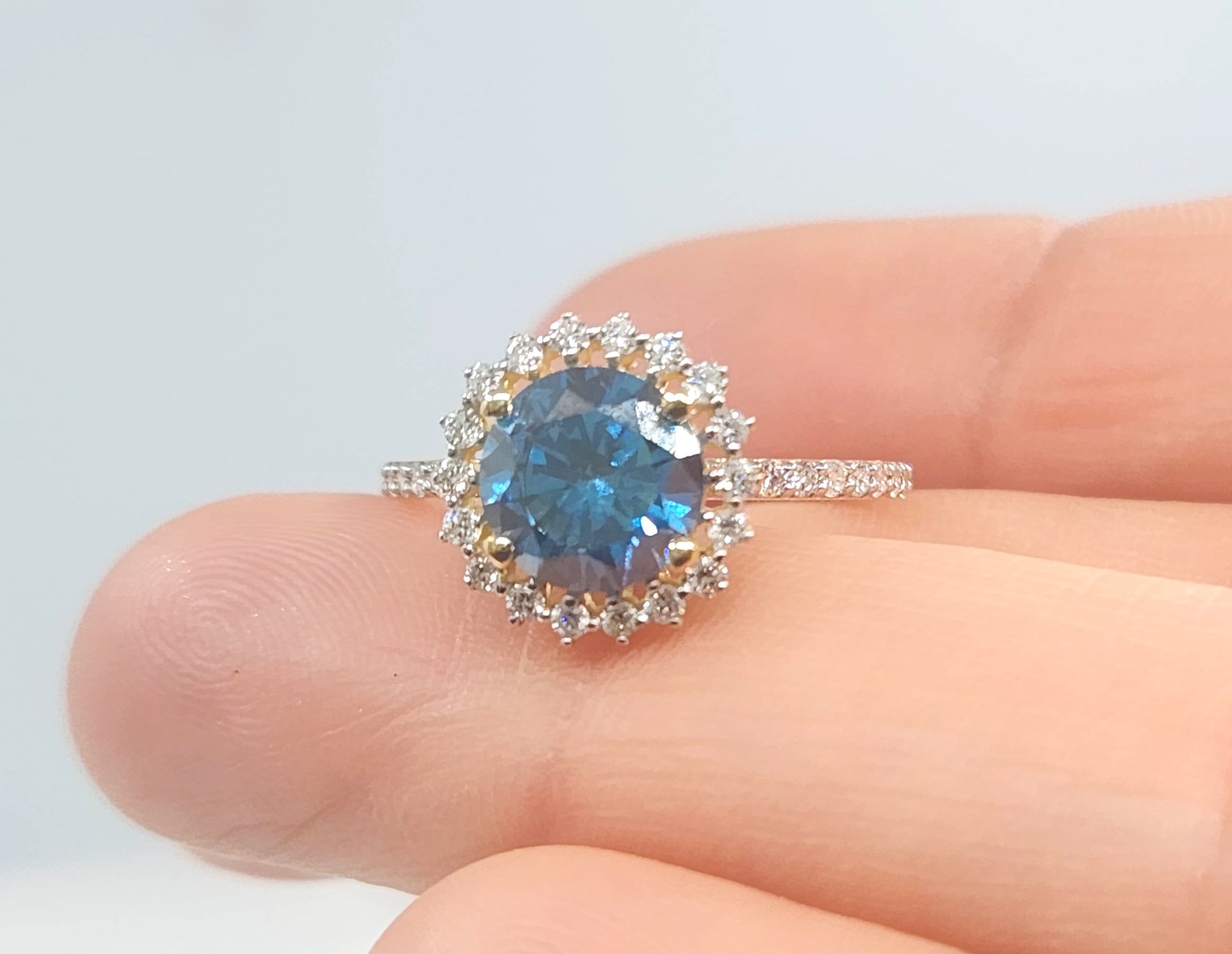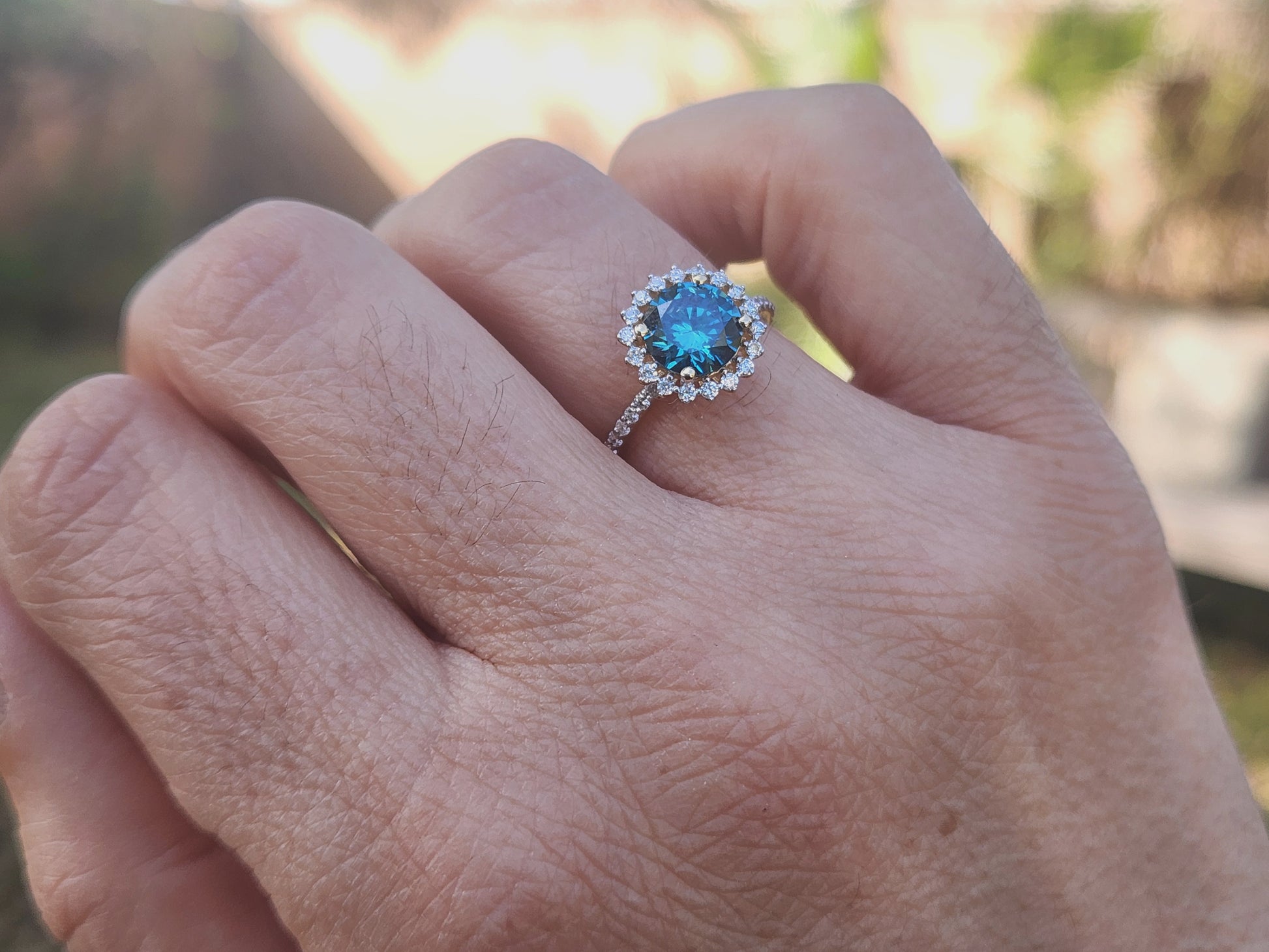 Center Stones: 6mm CVD Lab Grown blue diamond, 1.22 carat
