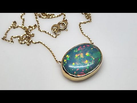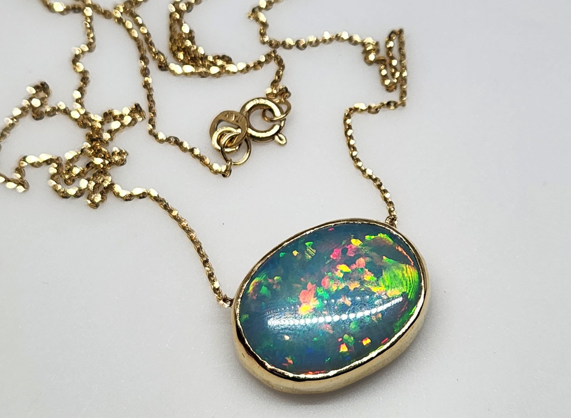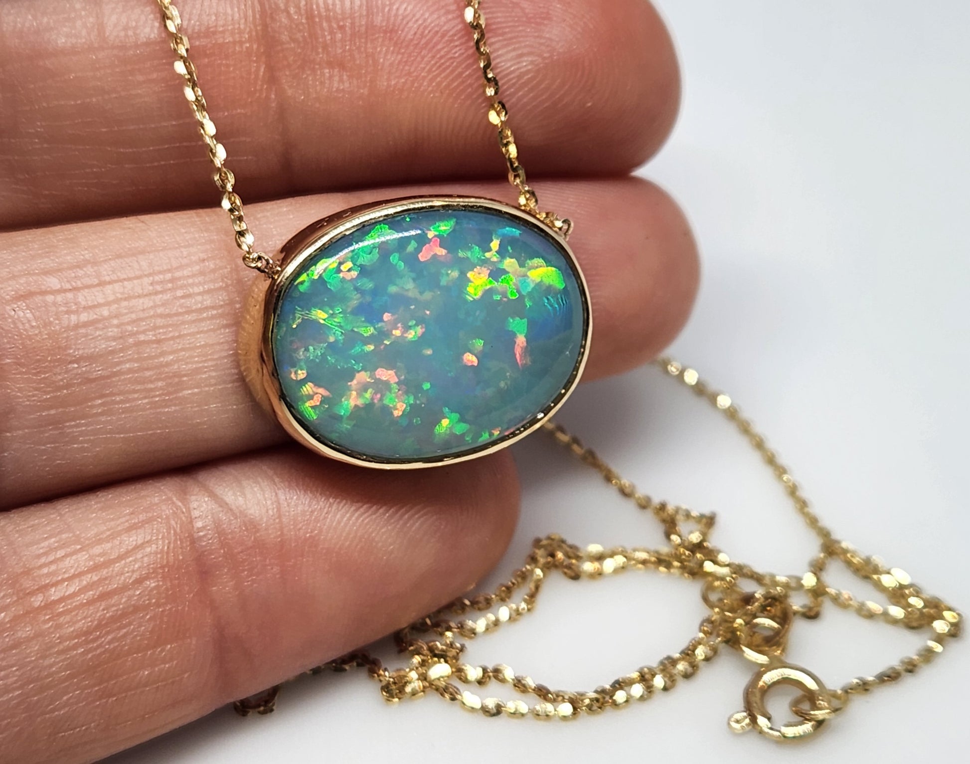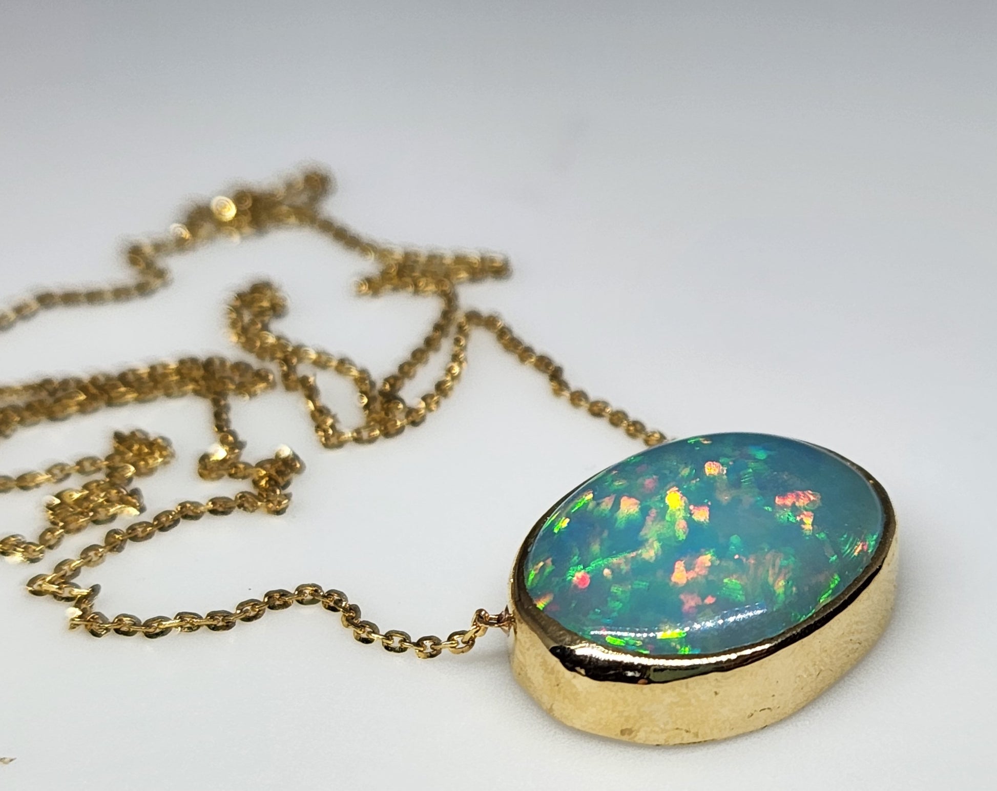 A bright oval shaped cabochon opal with bright and colorful blue, green and bold red fire, set in 14k yellow gold with a split chain.