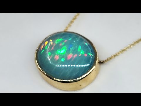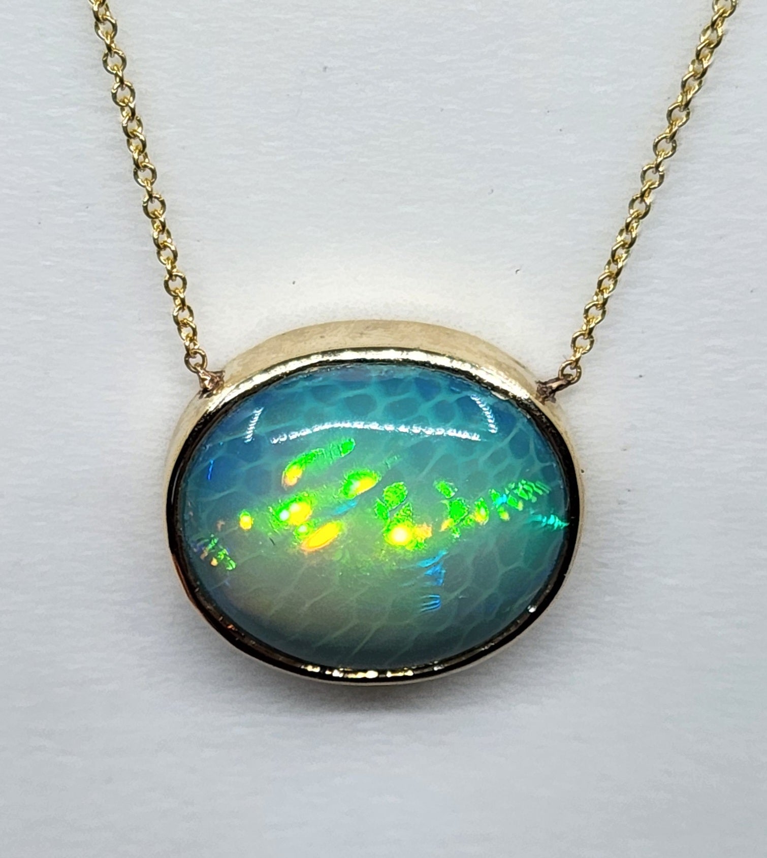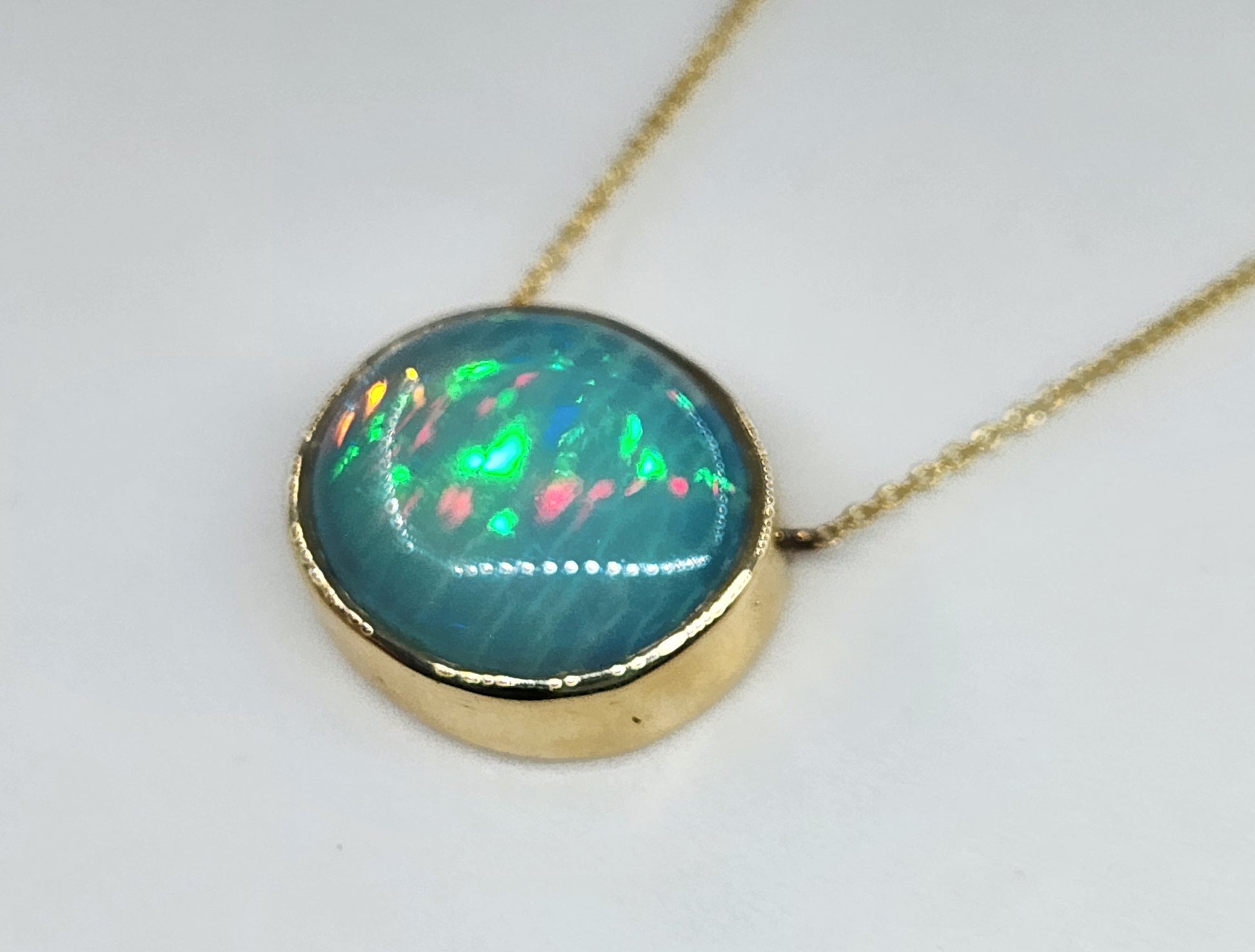 A colorful opal with blue, green and red fire color, set in 14k yellow gold with a 14k gold split chain. The opal is a natural opal made into a doublet (solid gem with backing).