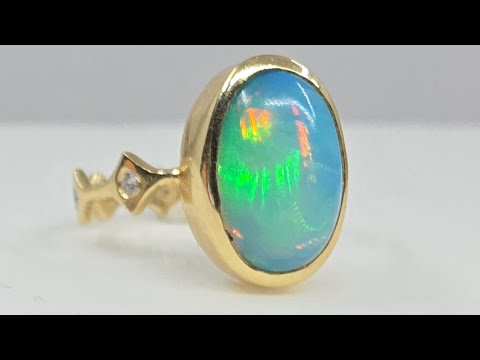 A bright blue/green opal set in a 14k solid gold band, with moissanite accent stones. Two solid gold stacking bands are available to add to this single ring (see available options)