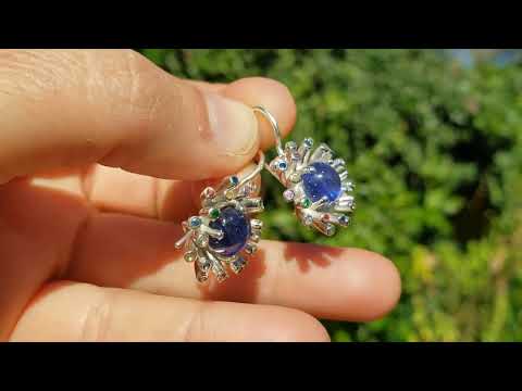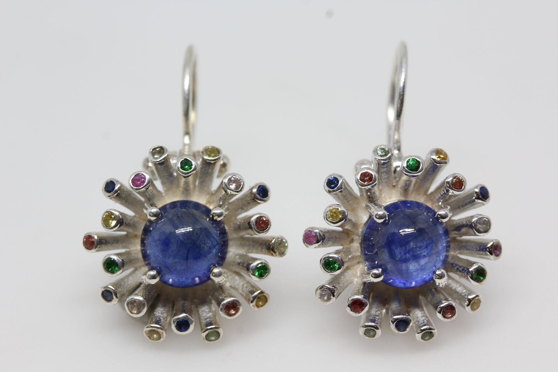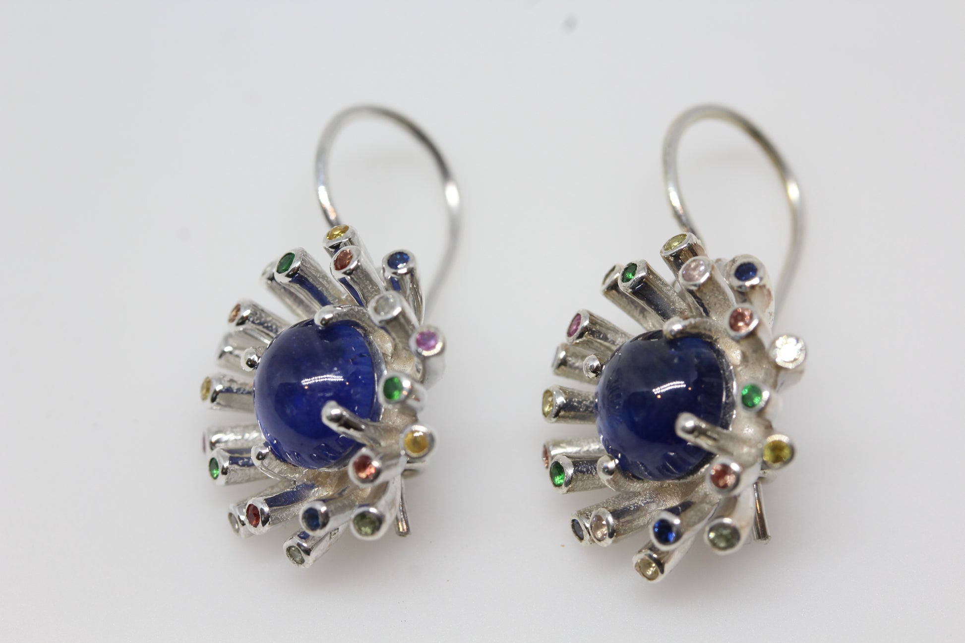 A pair of sterling silver earrings set with a 8mm round sapphire gemstone, and a collection of tourmaline, tsavorite garnet, and blue sapphire accent stones.