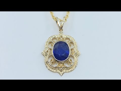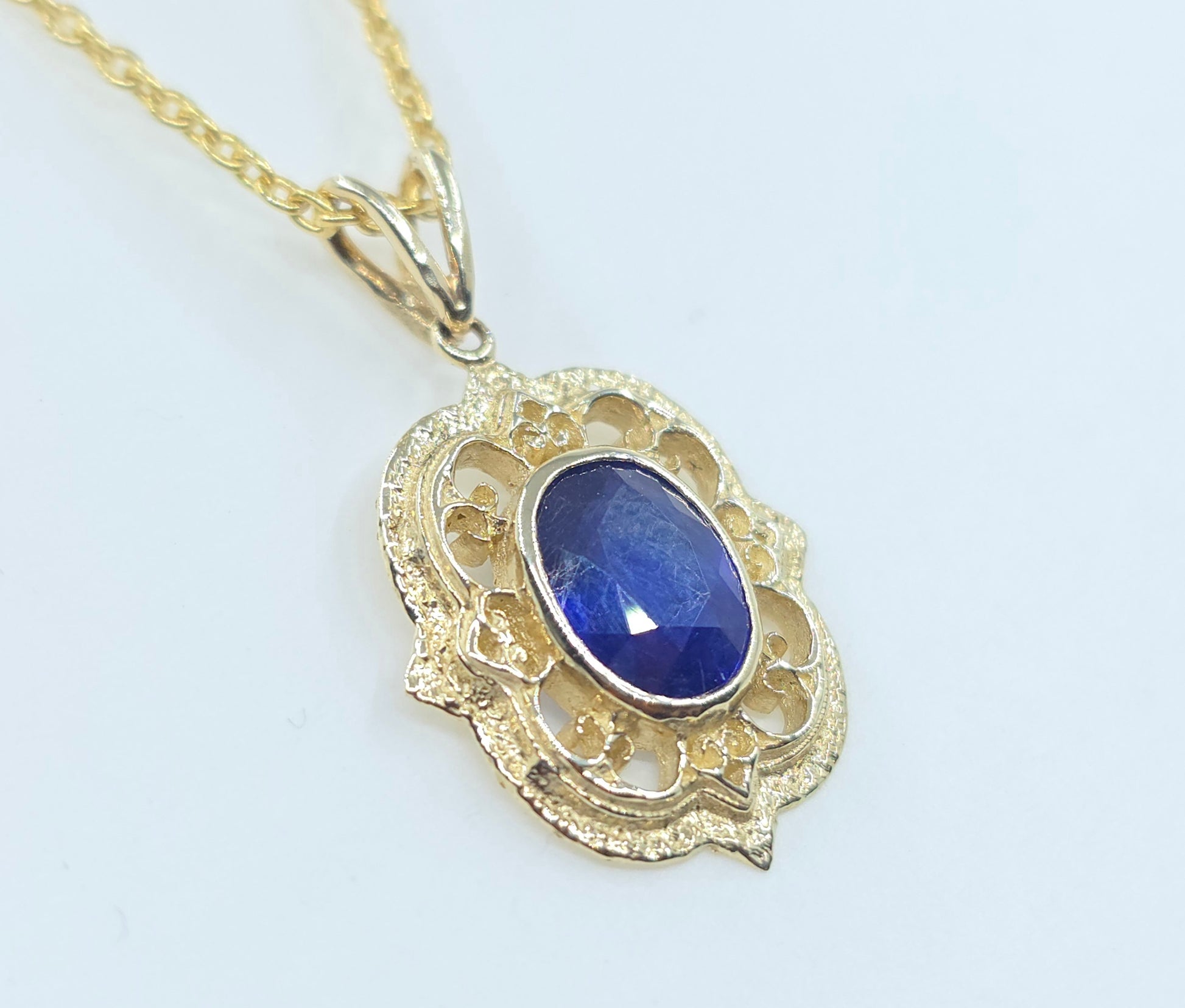 A 14k gold pendant set with a blue sapphire gemstone. The pendant comes with a 14k gold chain.