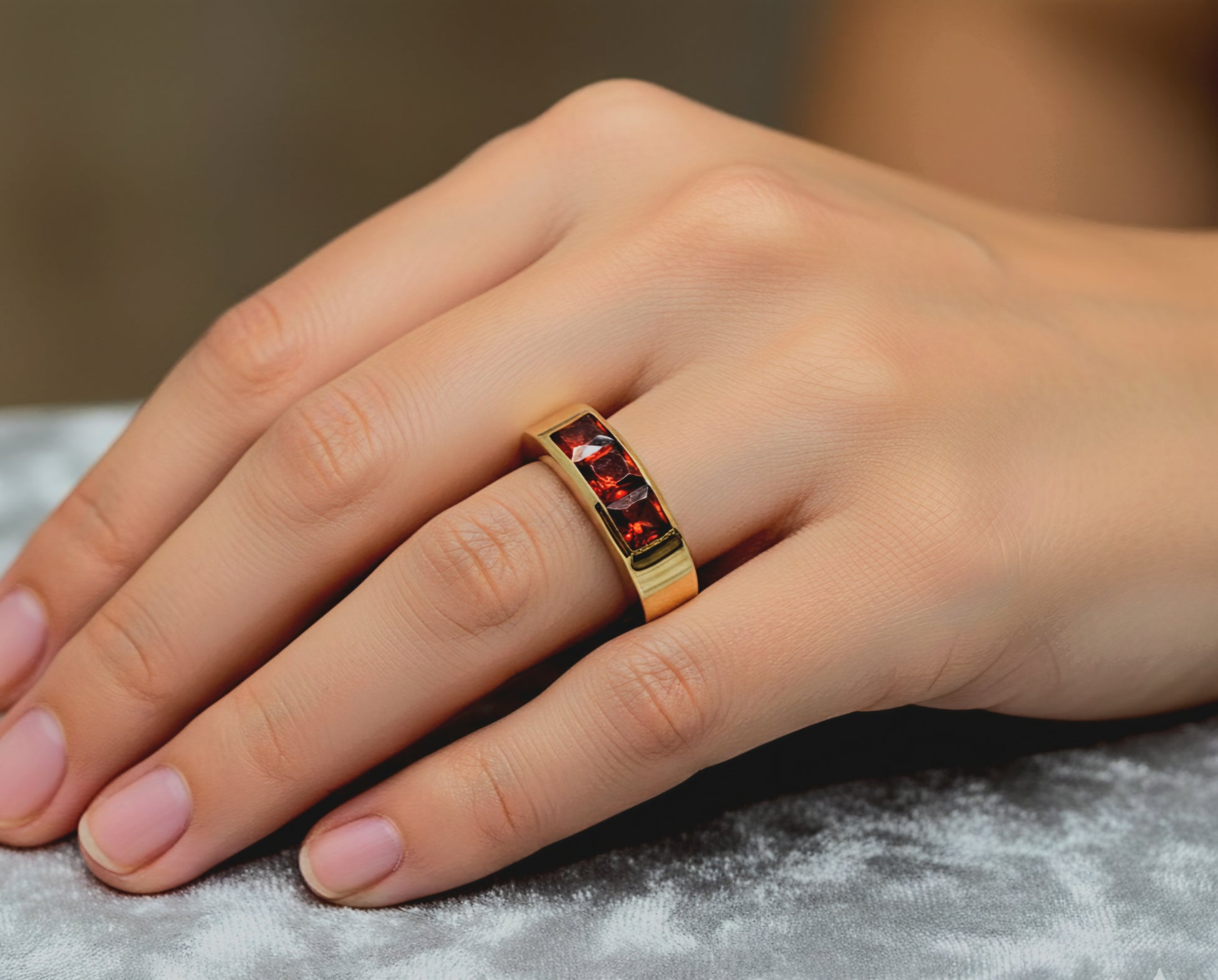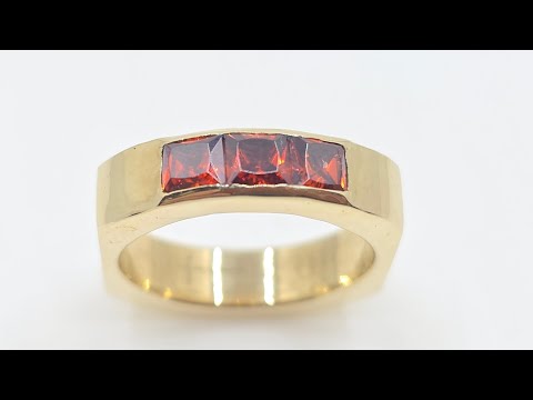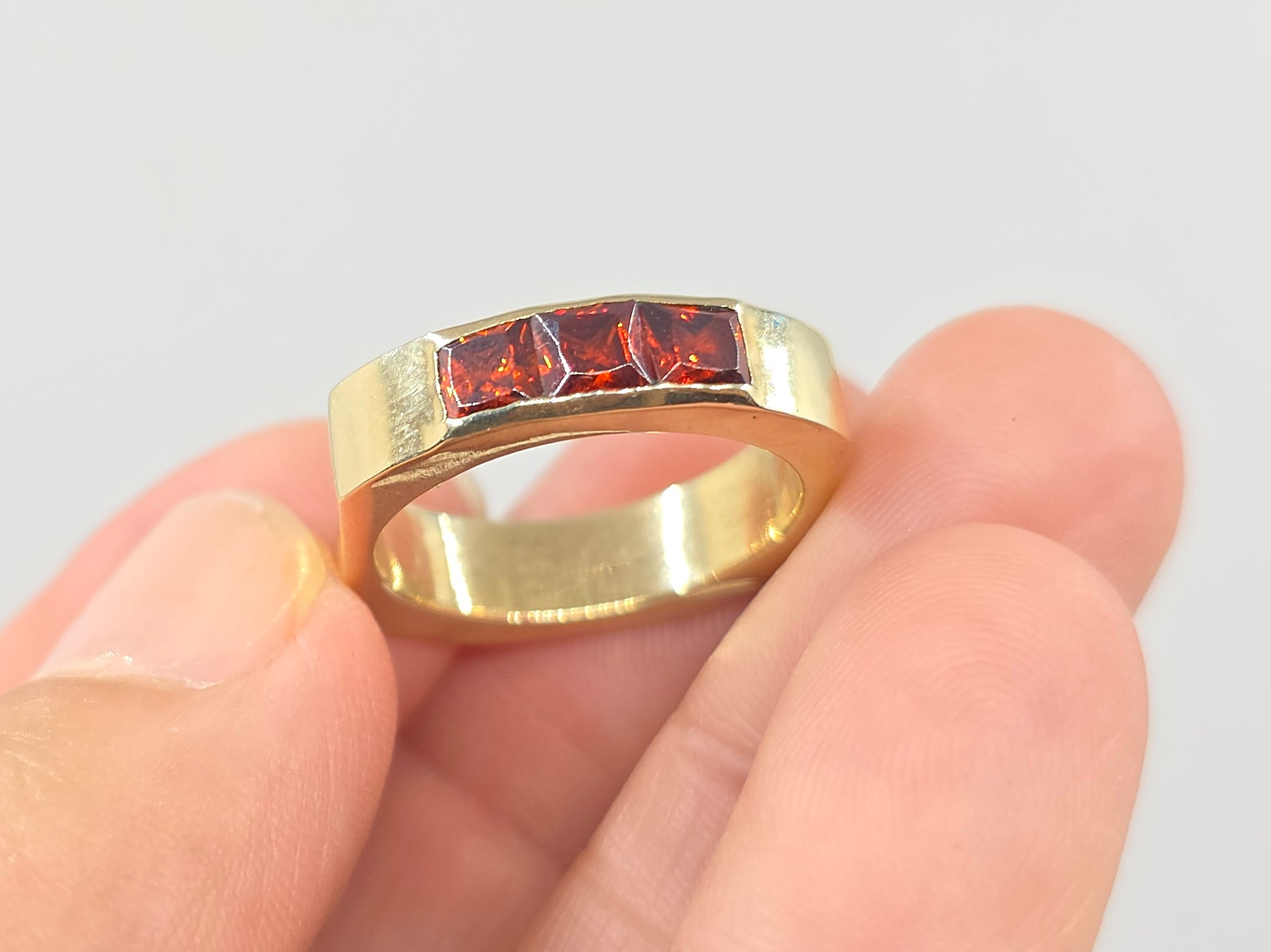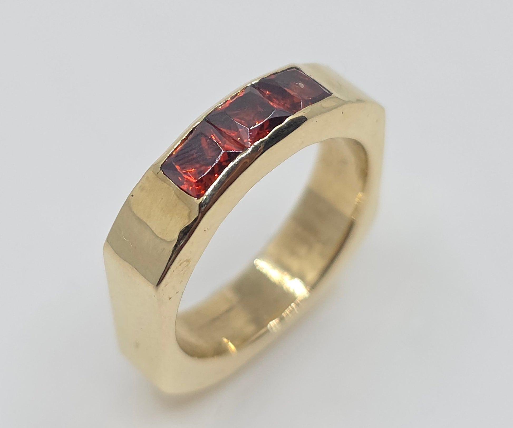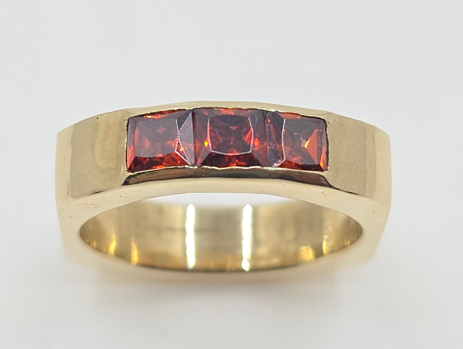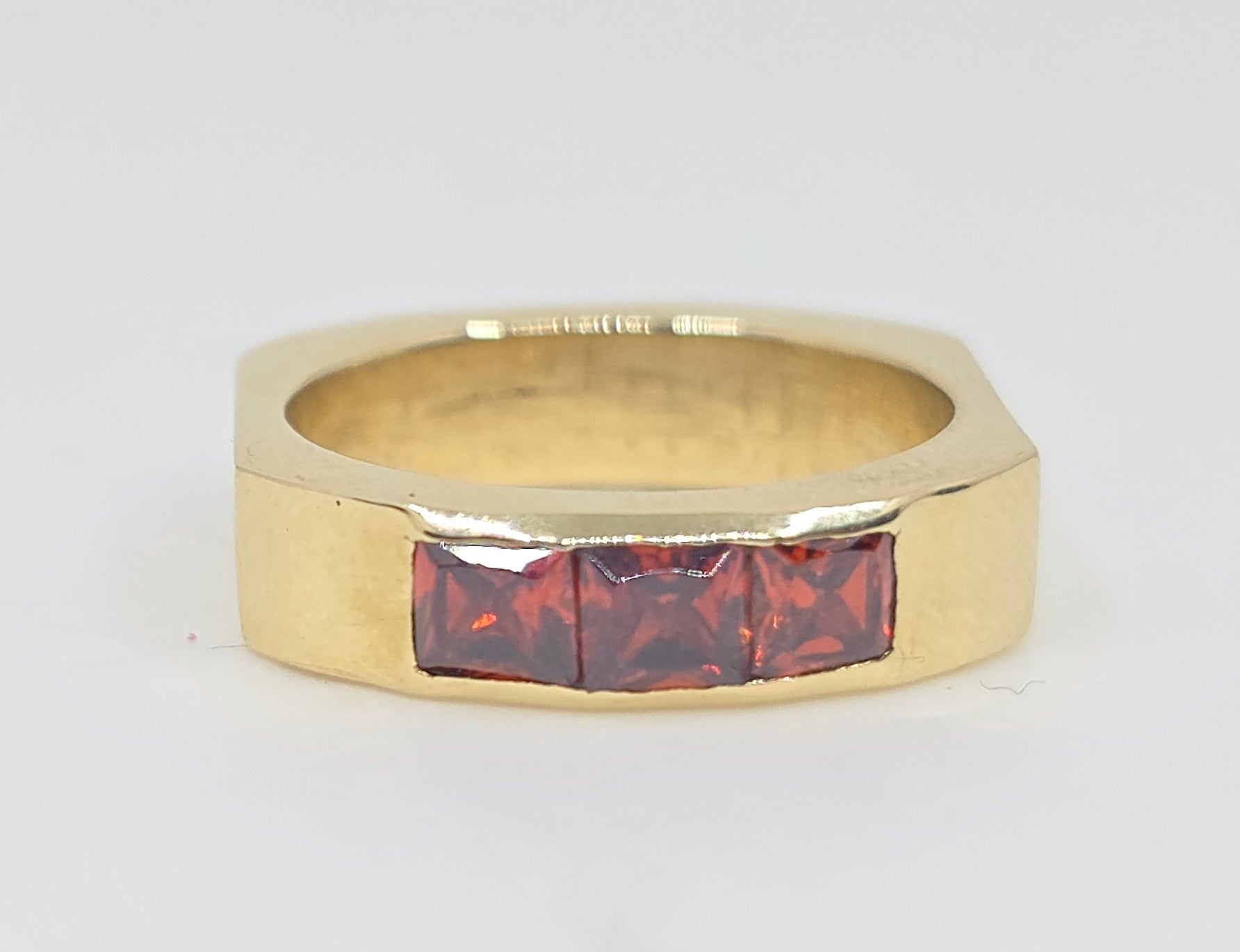 A solid brass ring set with 3 red garnet gemstones.