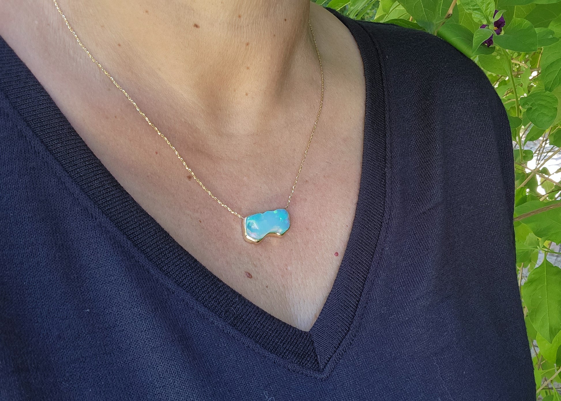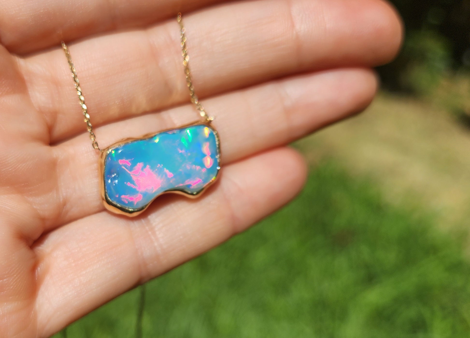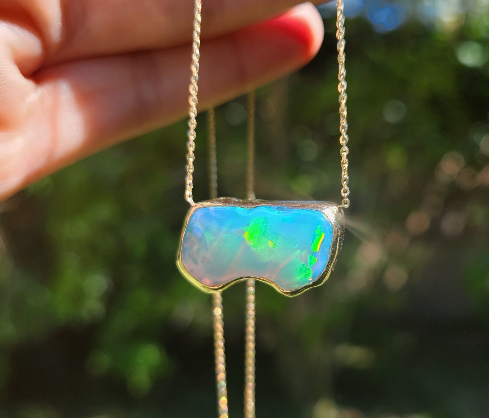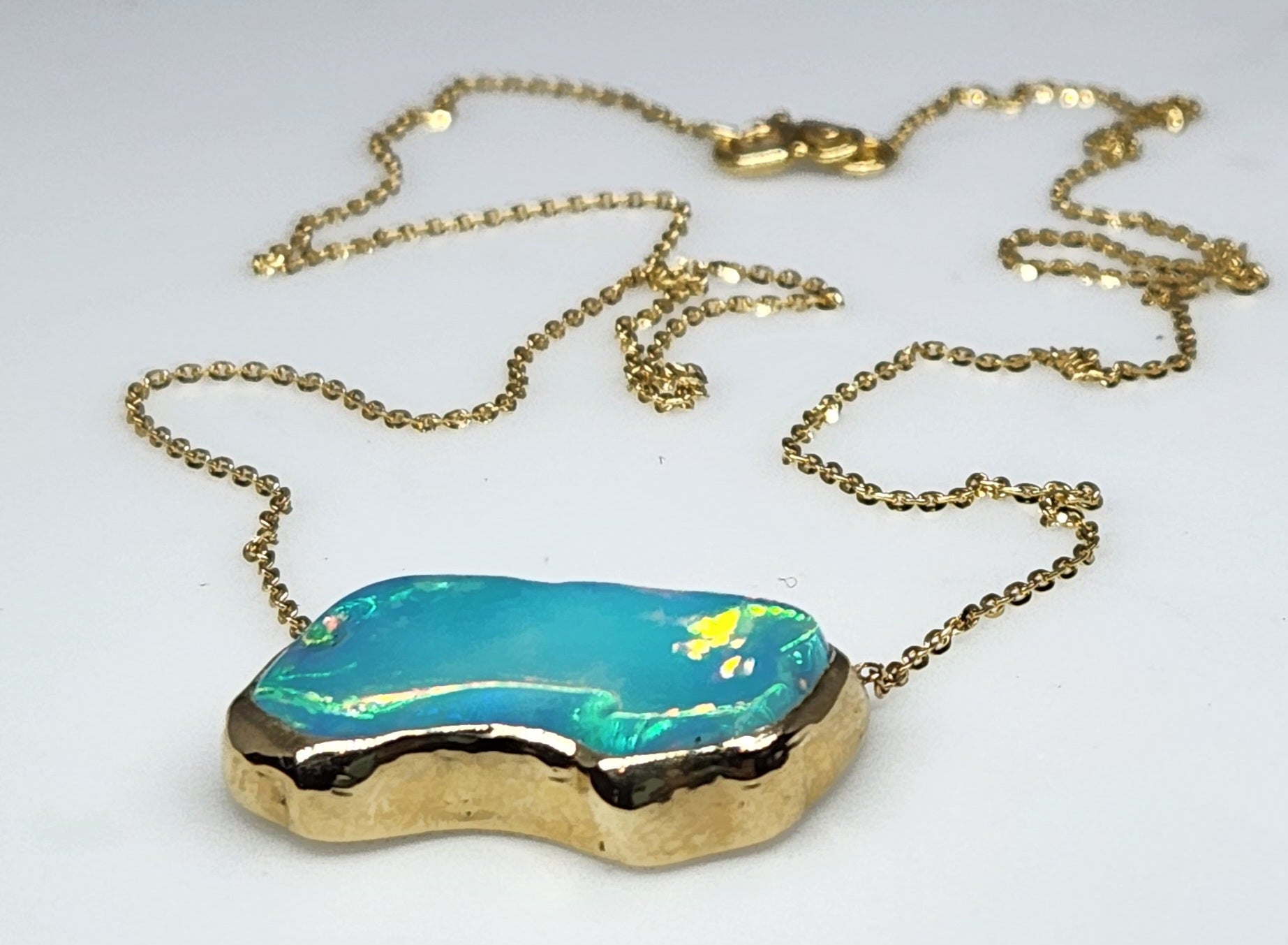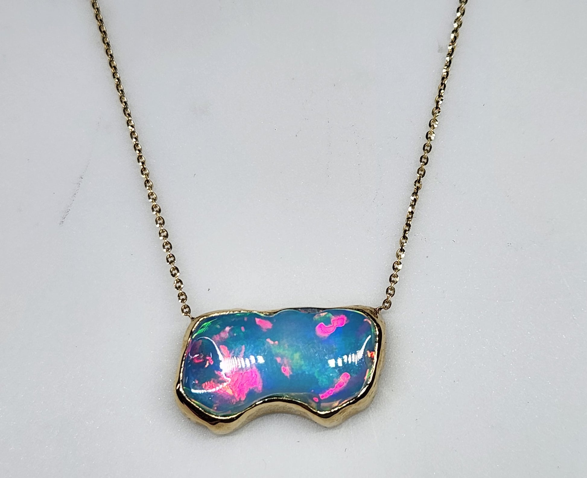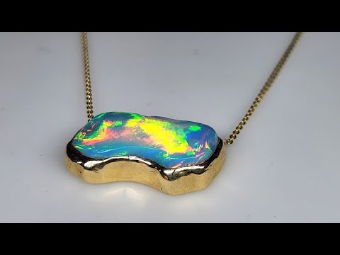 A hand carved free form opal set in a 14k Yellow Gold Pendant.