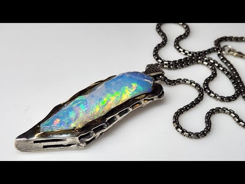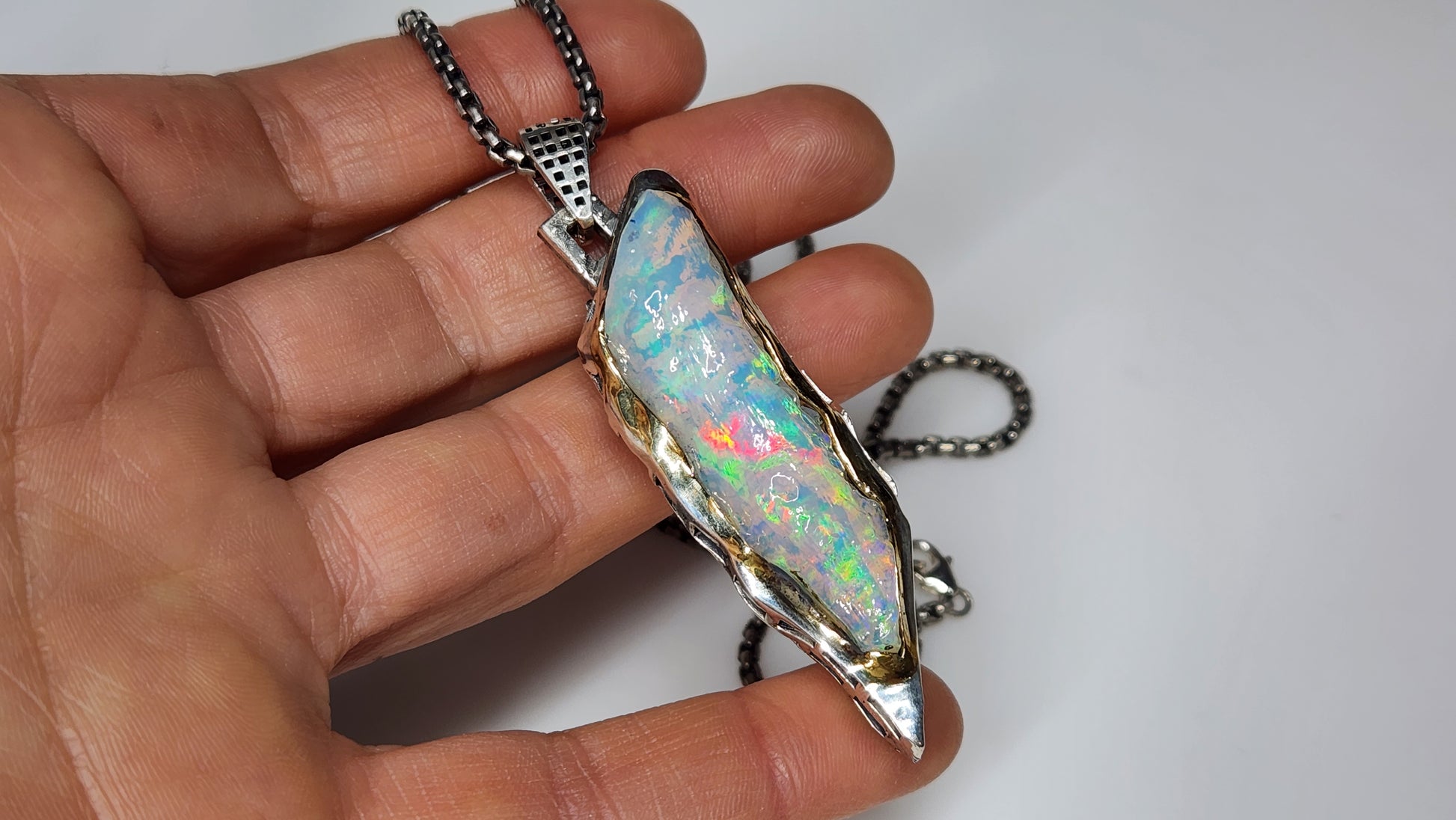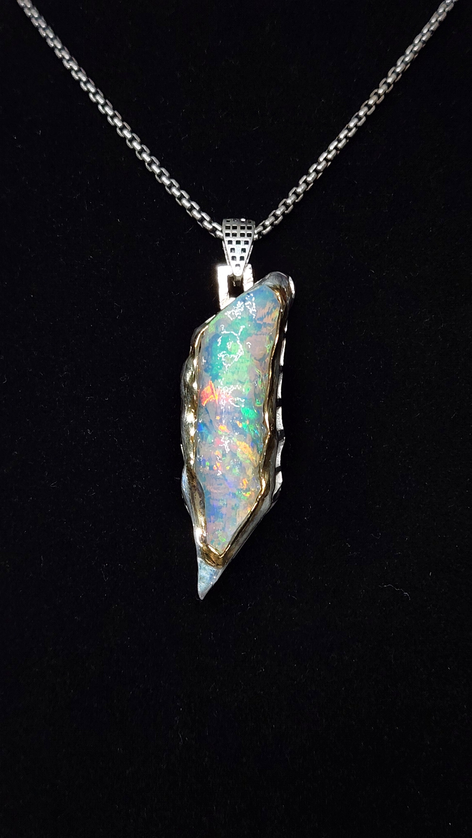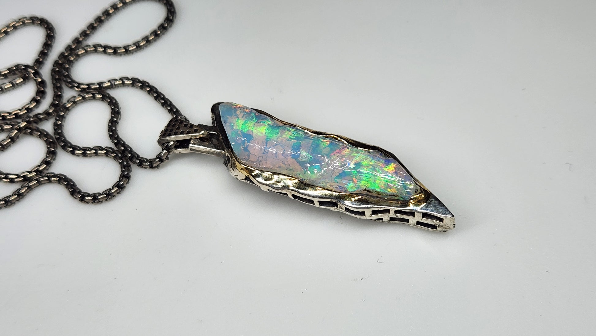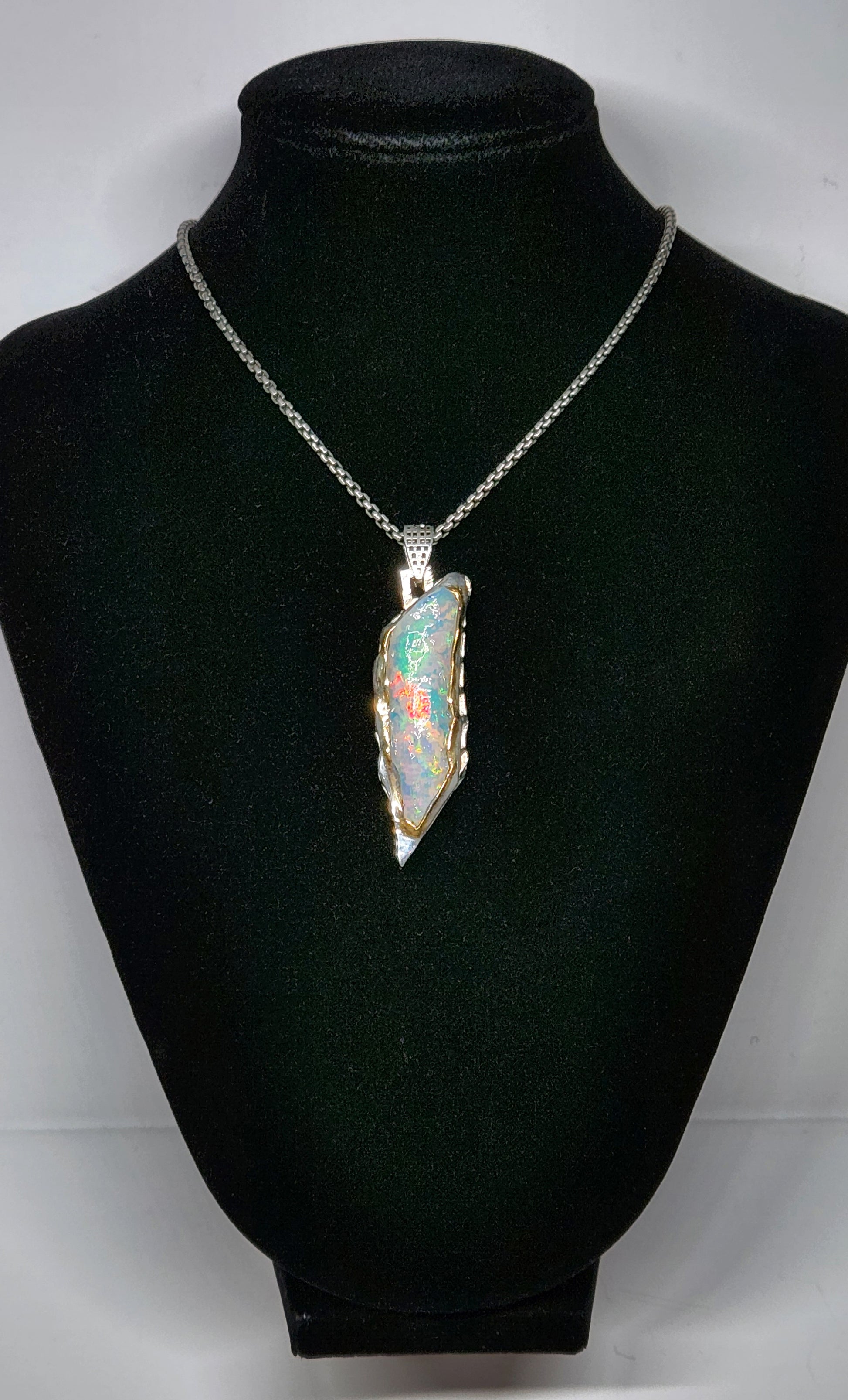 A carved opal with colorful flashes of red, green and blue fire colors, set in sterling silver with gold, on a sterling silver chain.