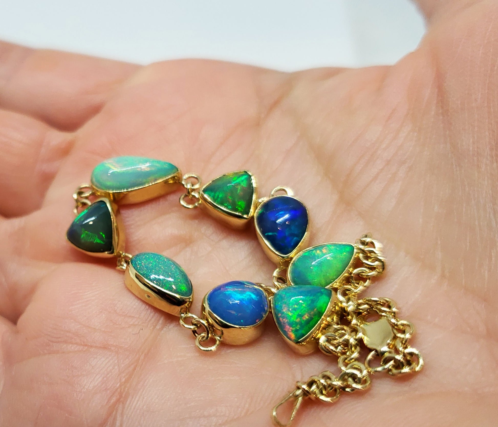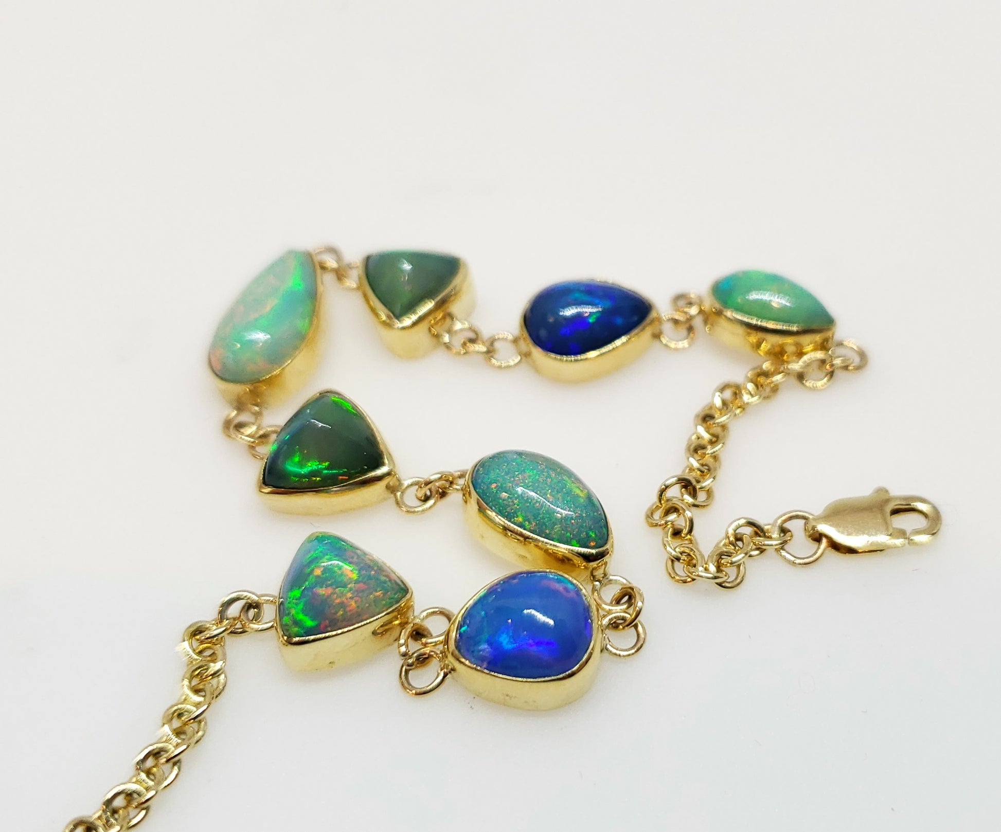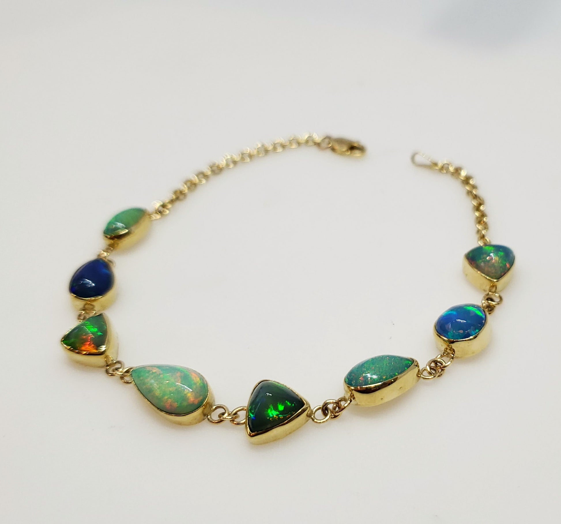 A collection of 8 Ethiopian Opal doublets set in a 14k Yellow Gold link bracelet. Barrel Clasp with Safety clasp.