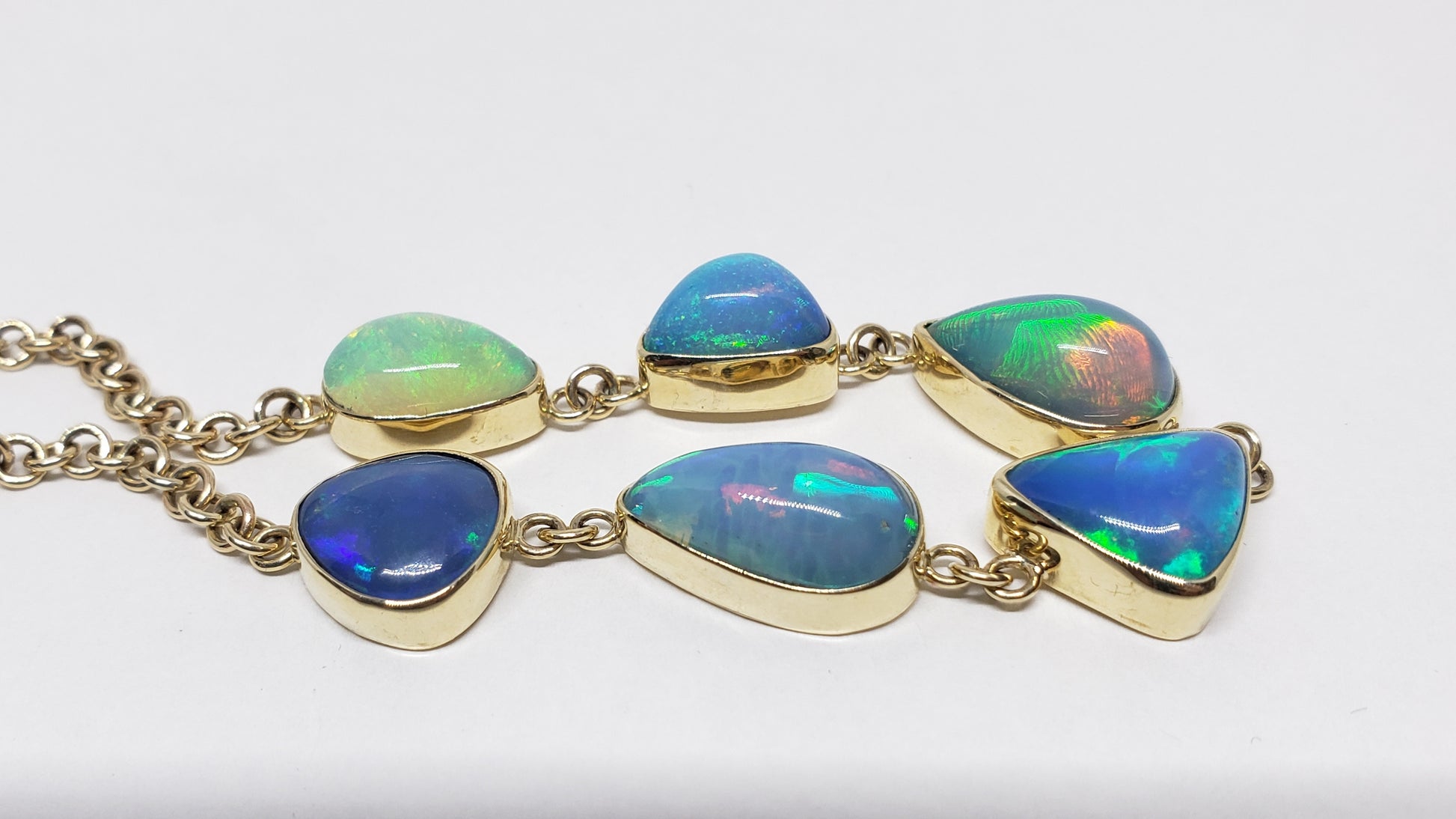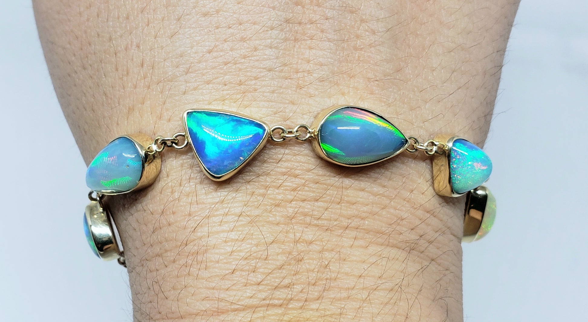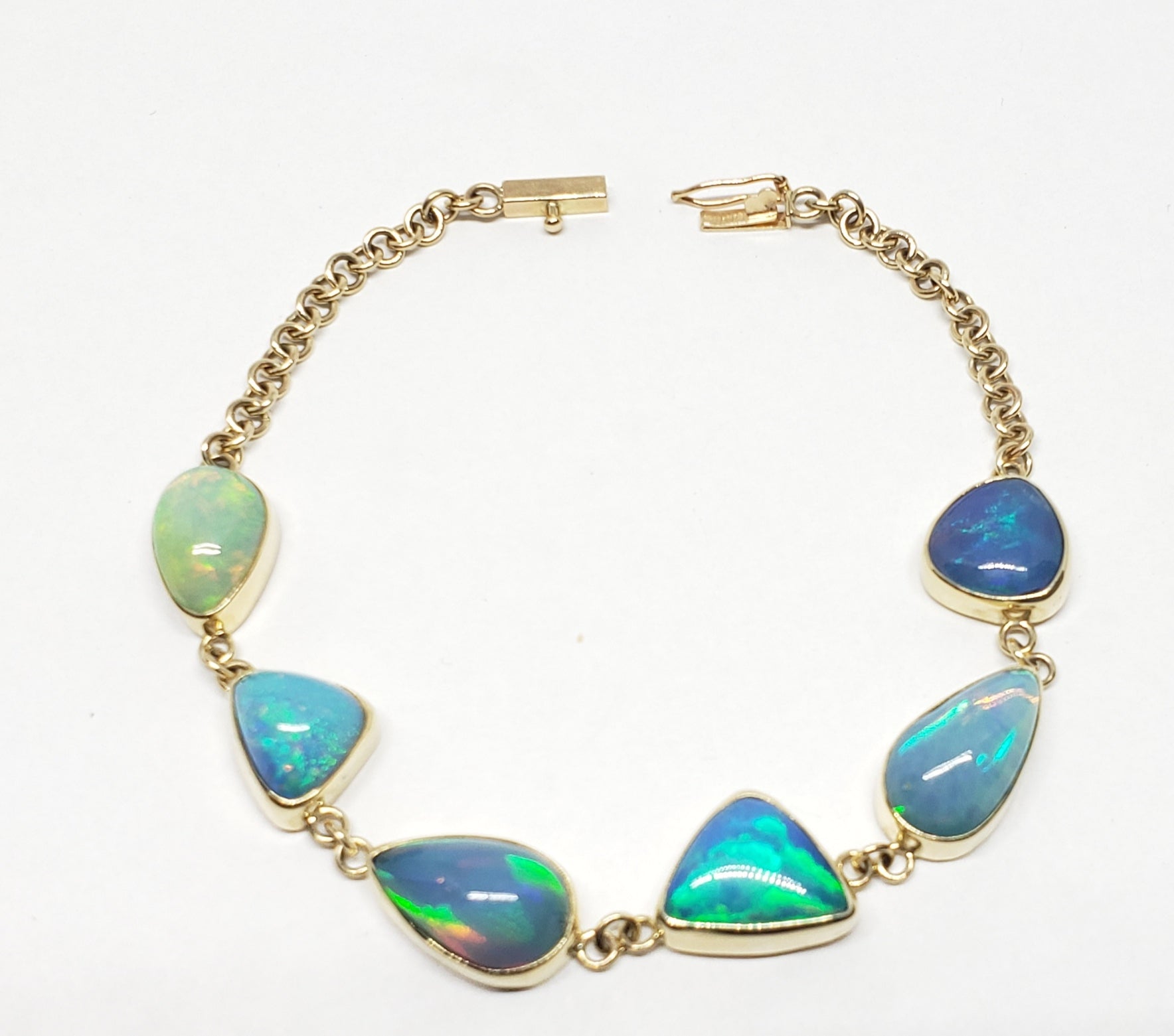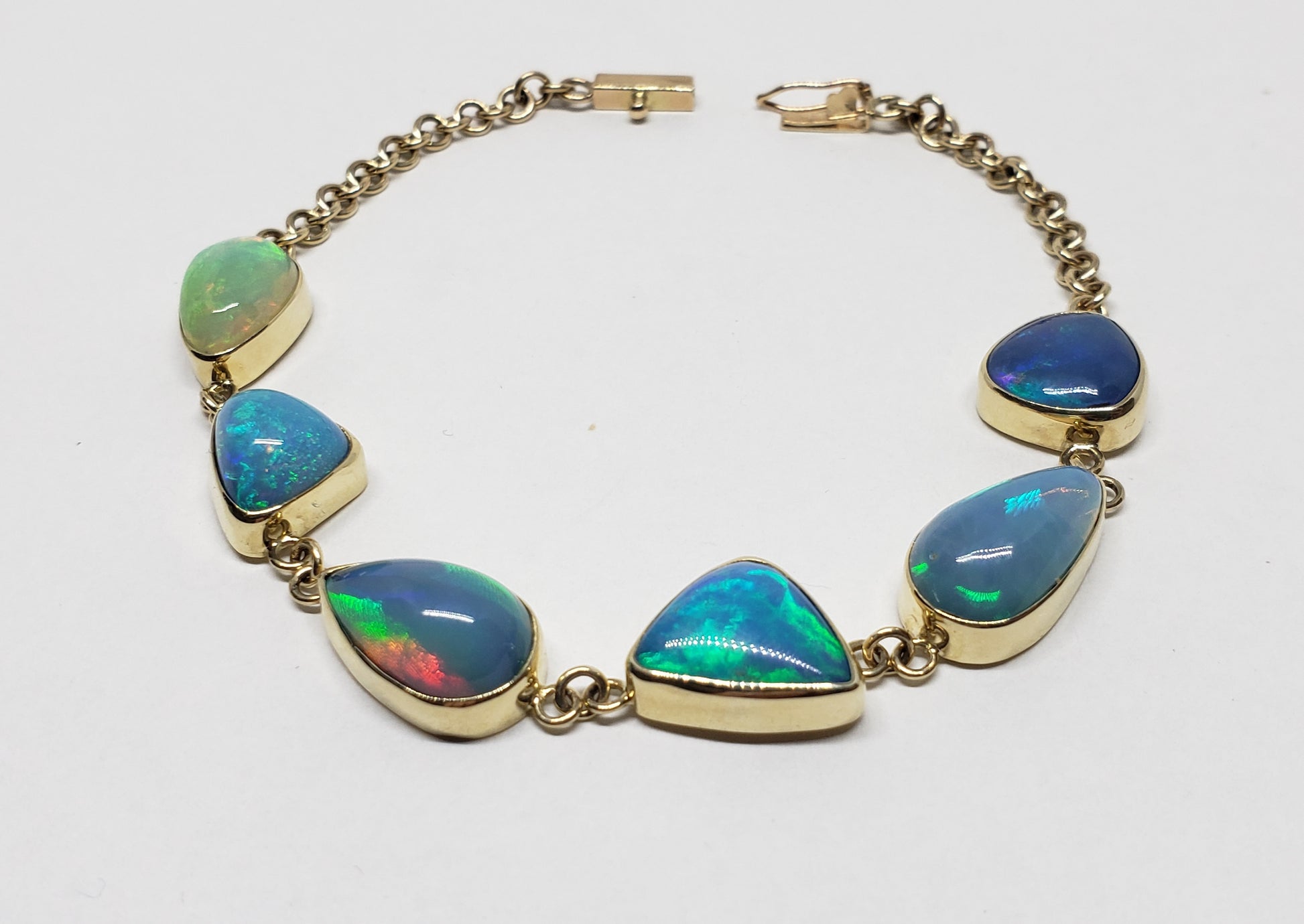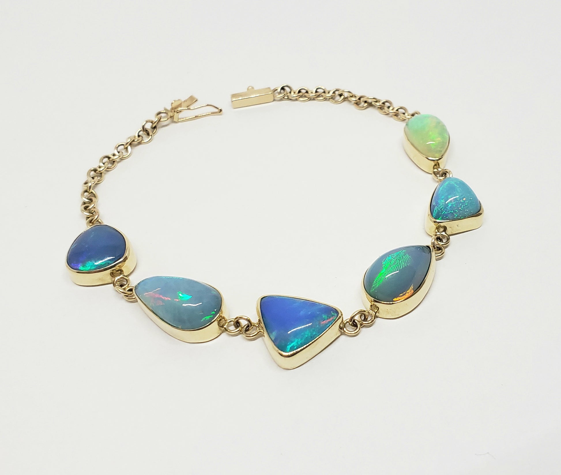 A collection of 6 Ethiopian Opal doublets set in a 14k Yellow Gold link bracelet. Barrel Clasp with Safety clasp.