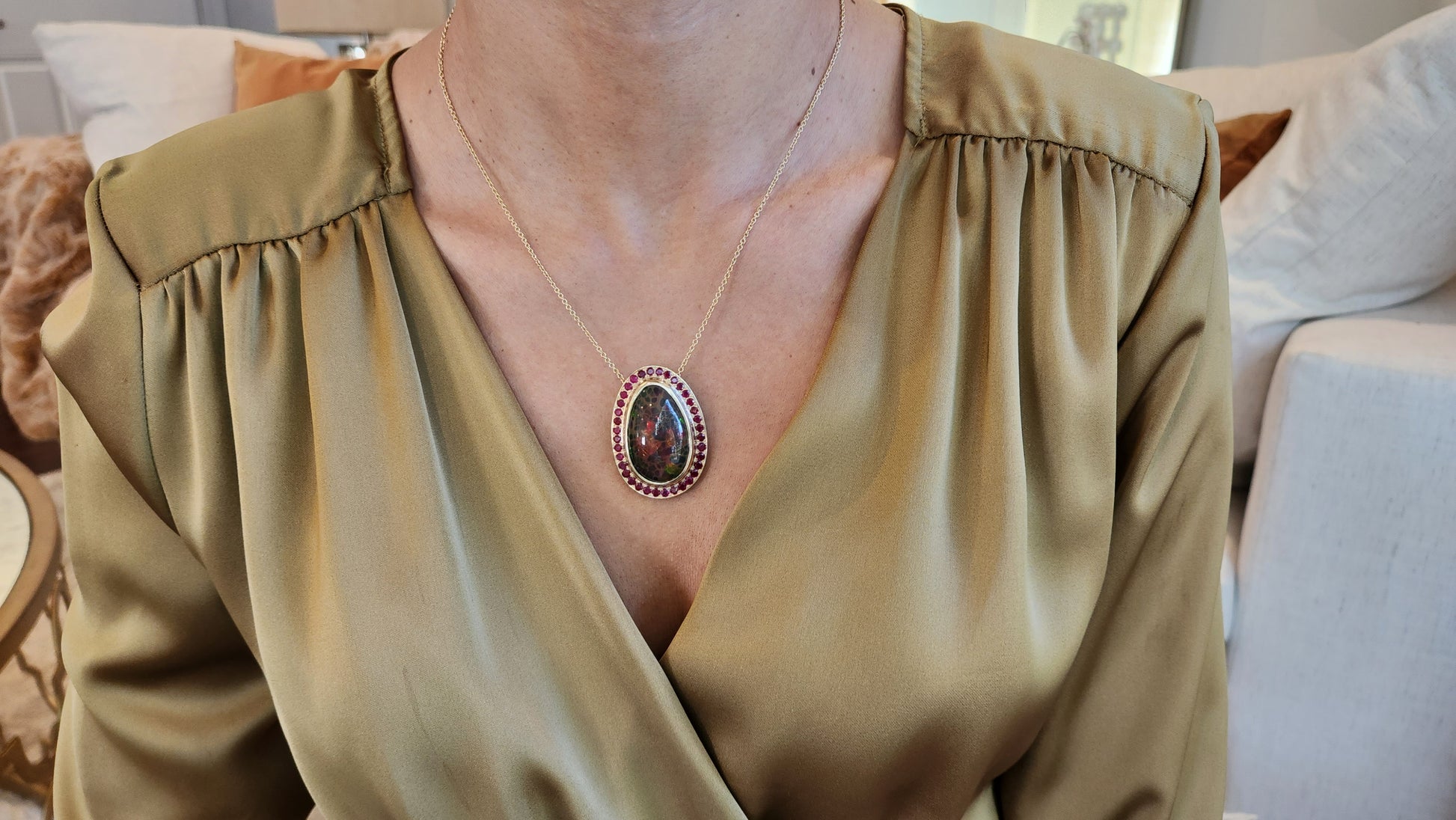 Natural Brown Opal & Ruby Pendant 14k Yellow Gold Necklace #367