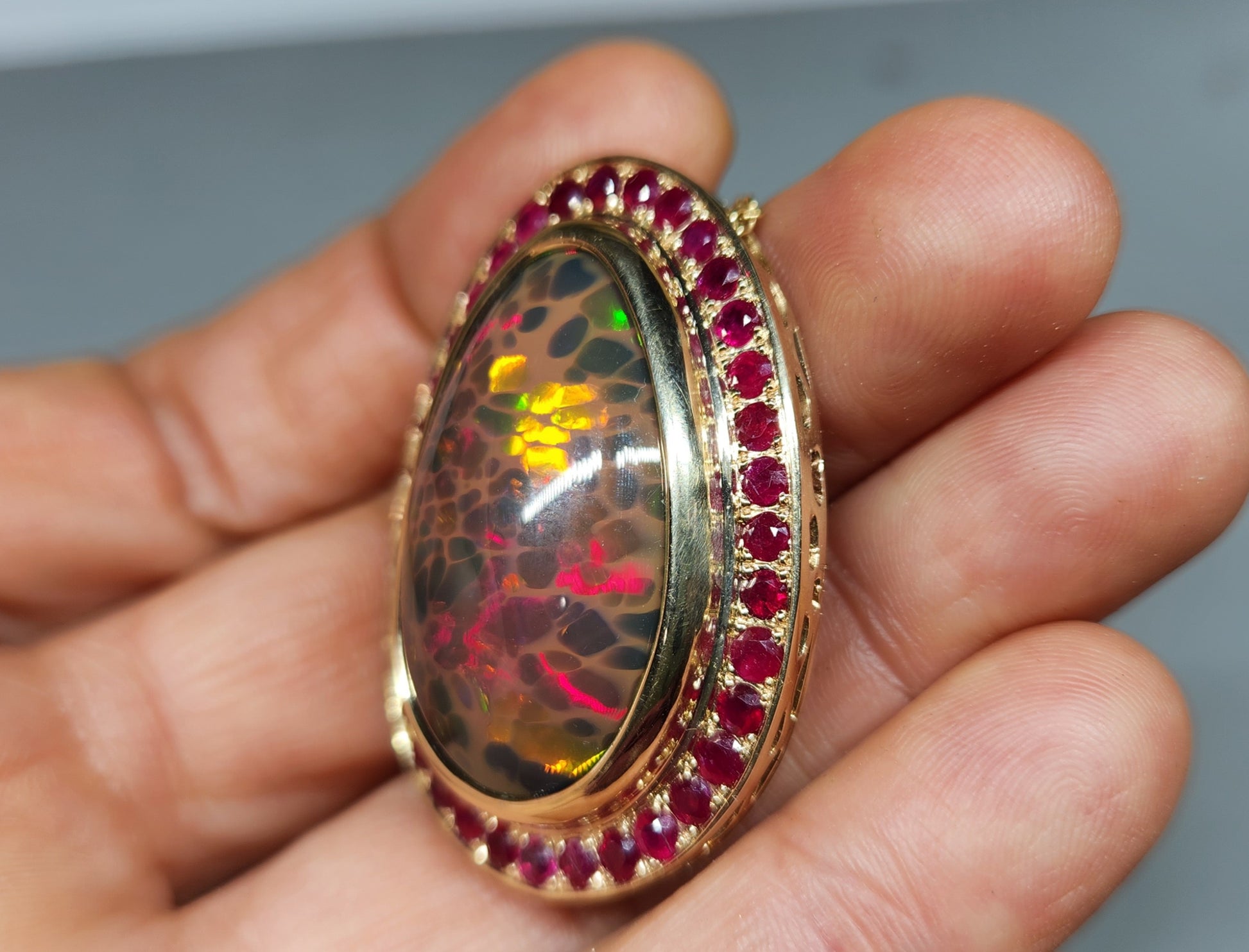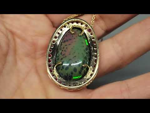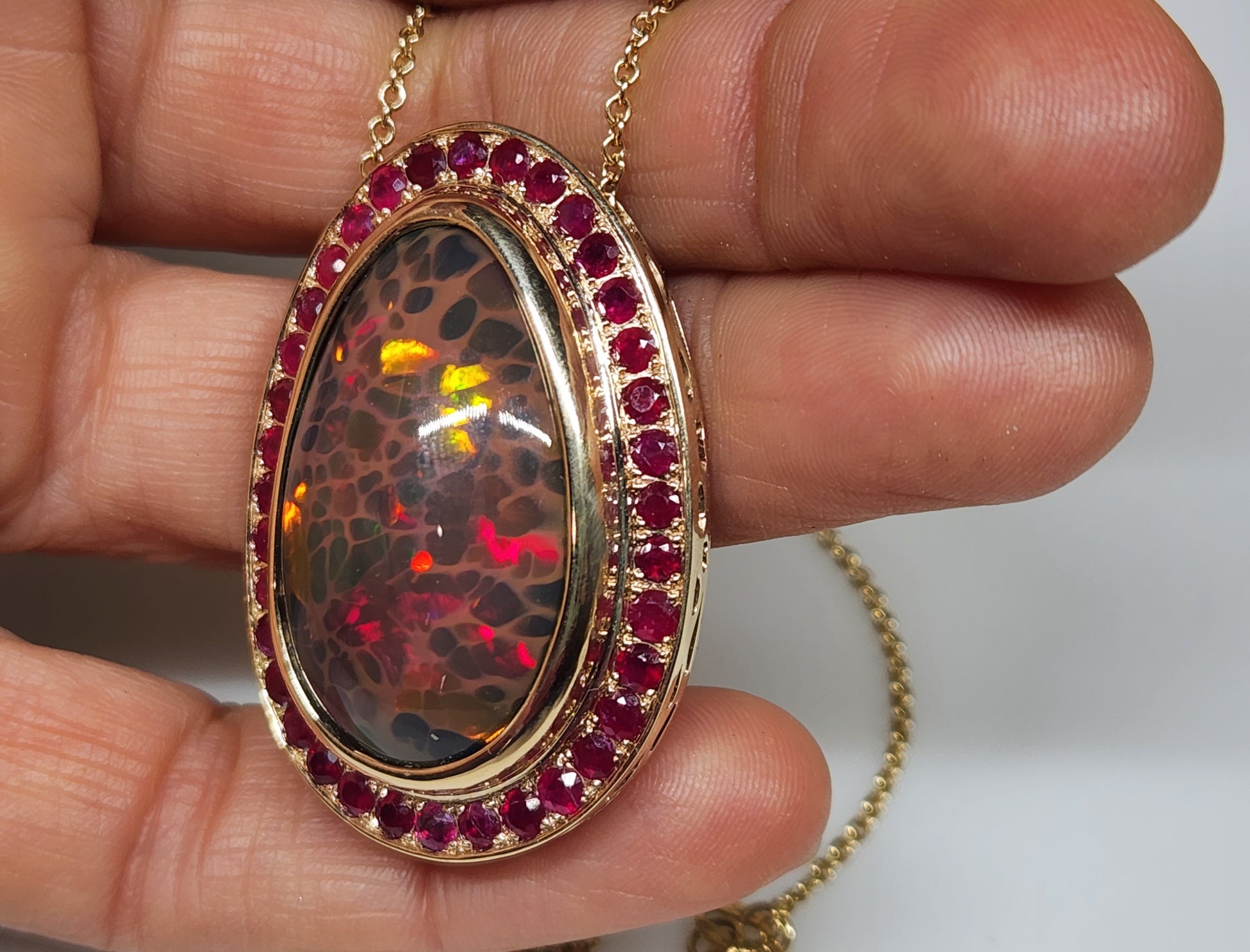 A natural brown harlequin opal with beautiful honeycomb patterns in red orange and green fire colors, set in 14k yellow gold with a gold chain.