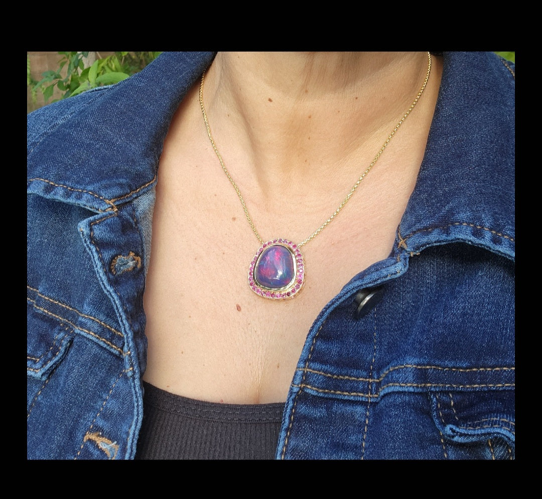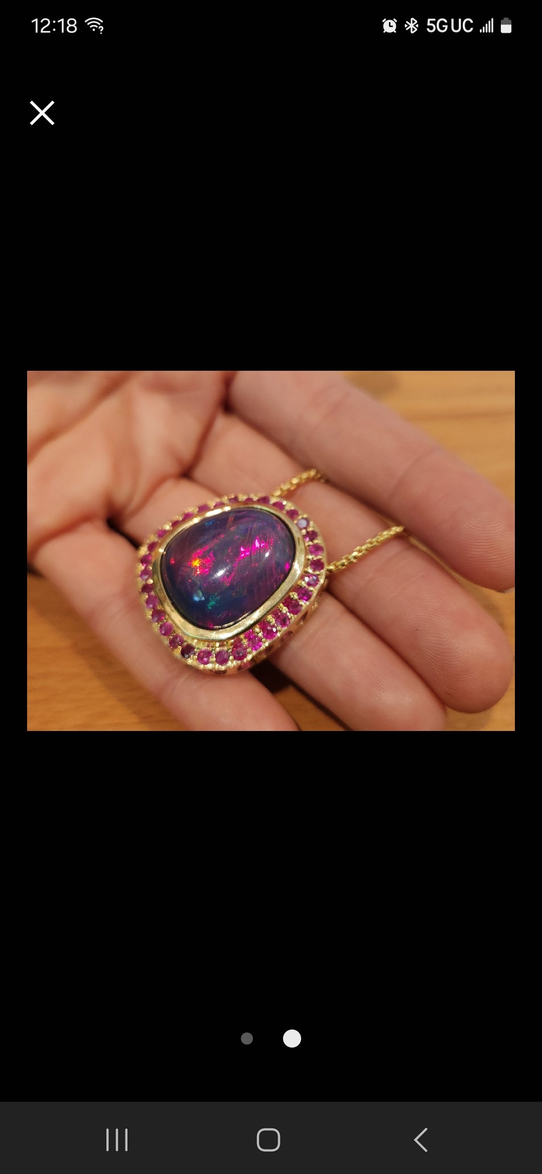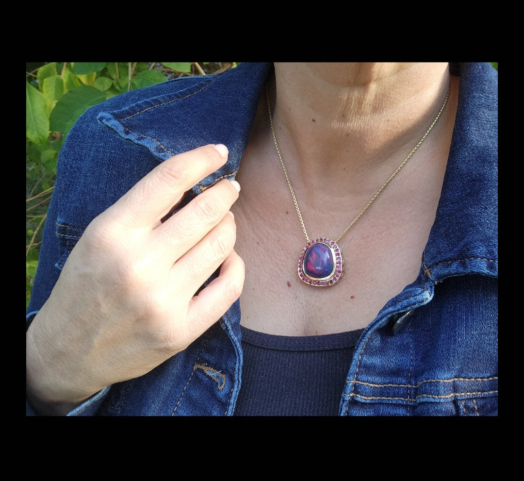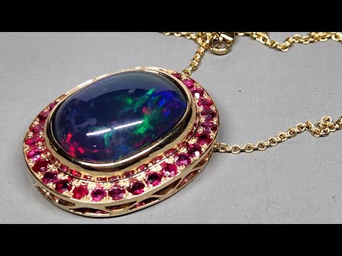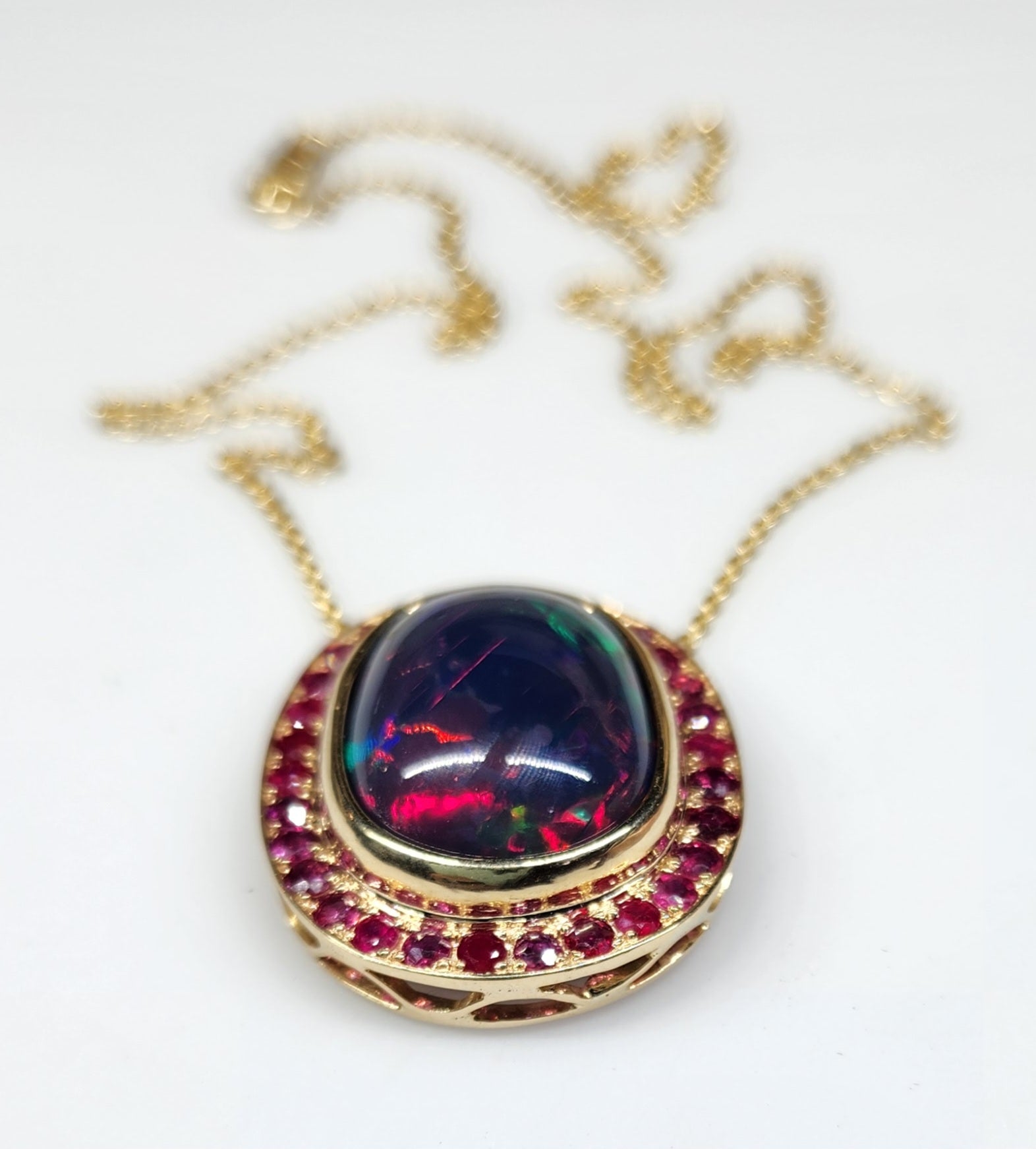 A large black opal with beautiful bold red fire colors, surrounded by rubies and set in 14k yellow gold with a gold chain.