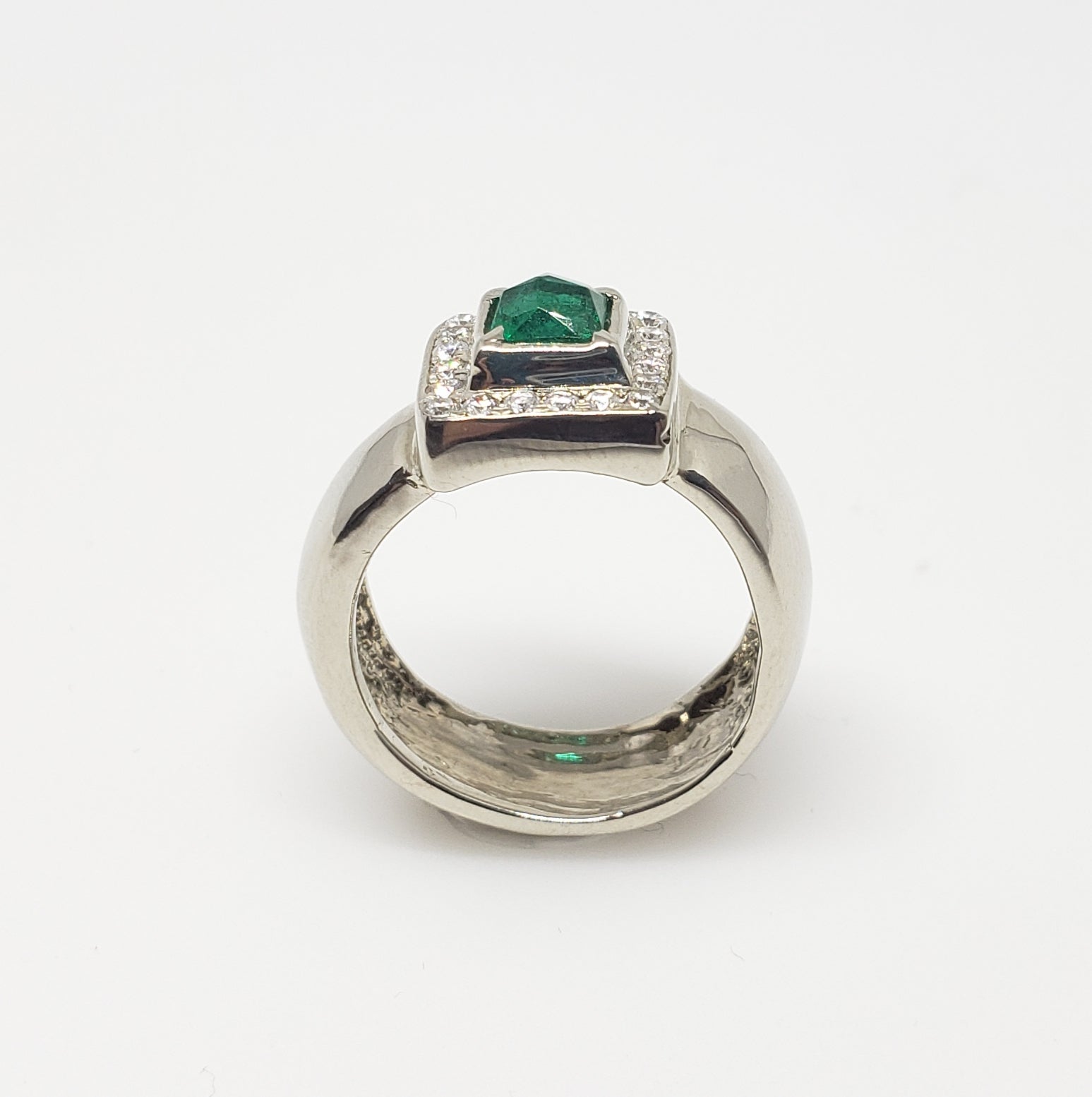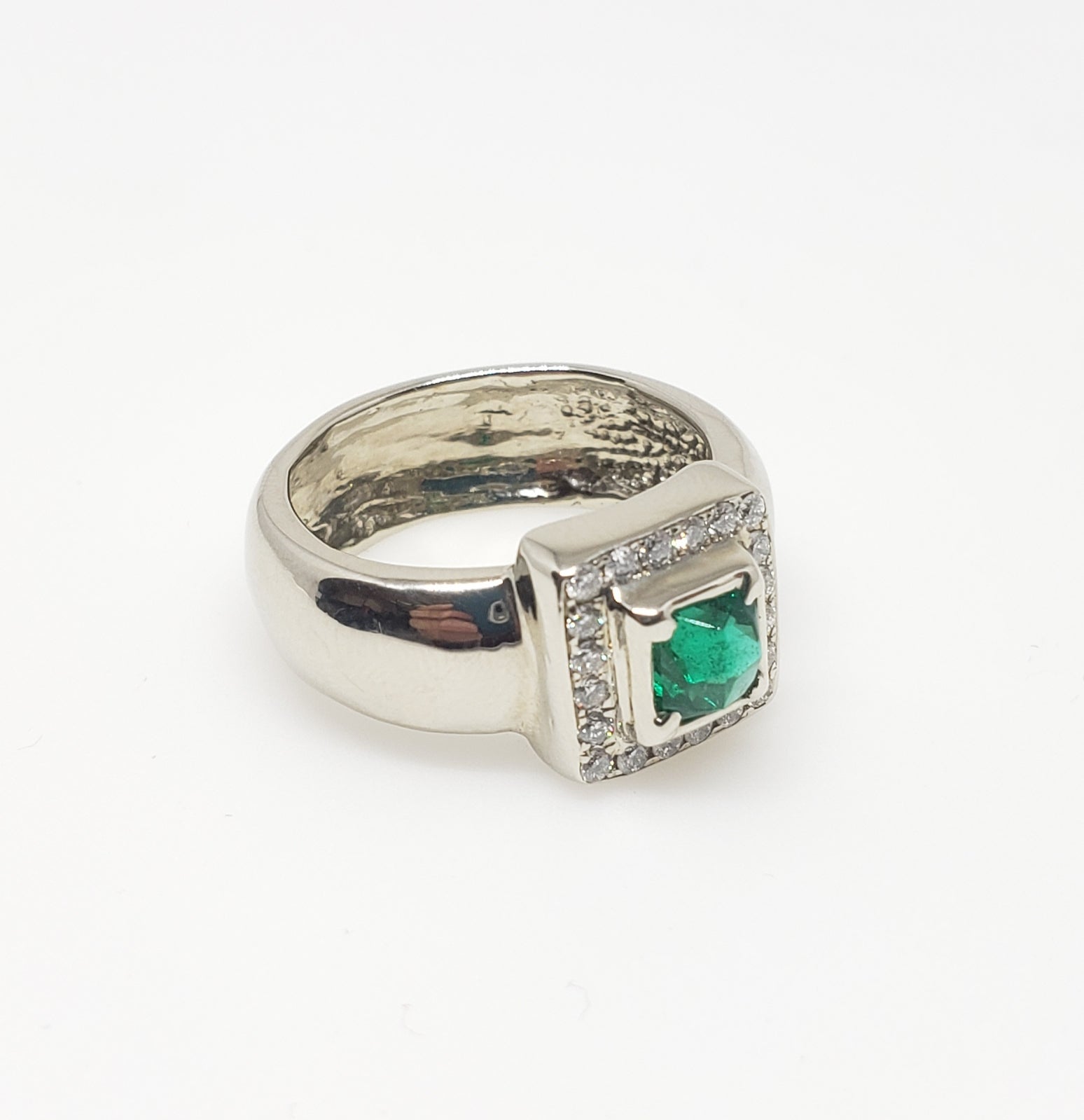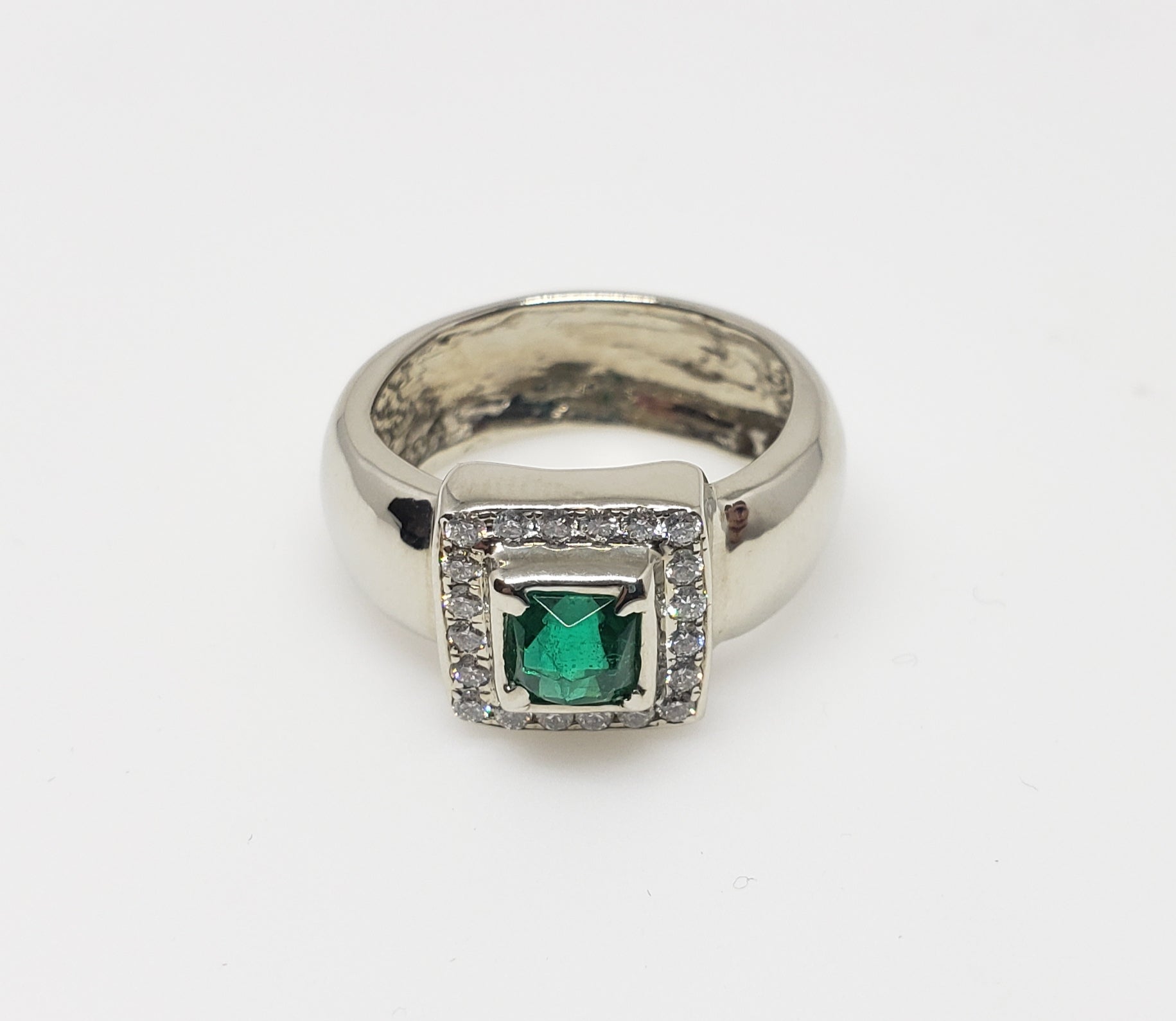 A solid 14k white gold ring set with a bright green emerald with diamonds accent stones