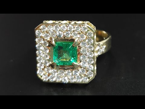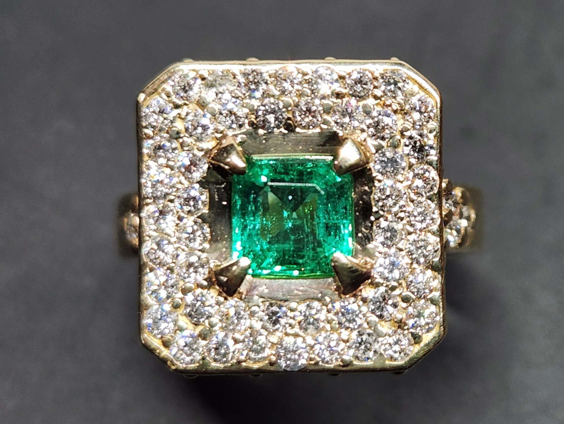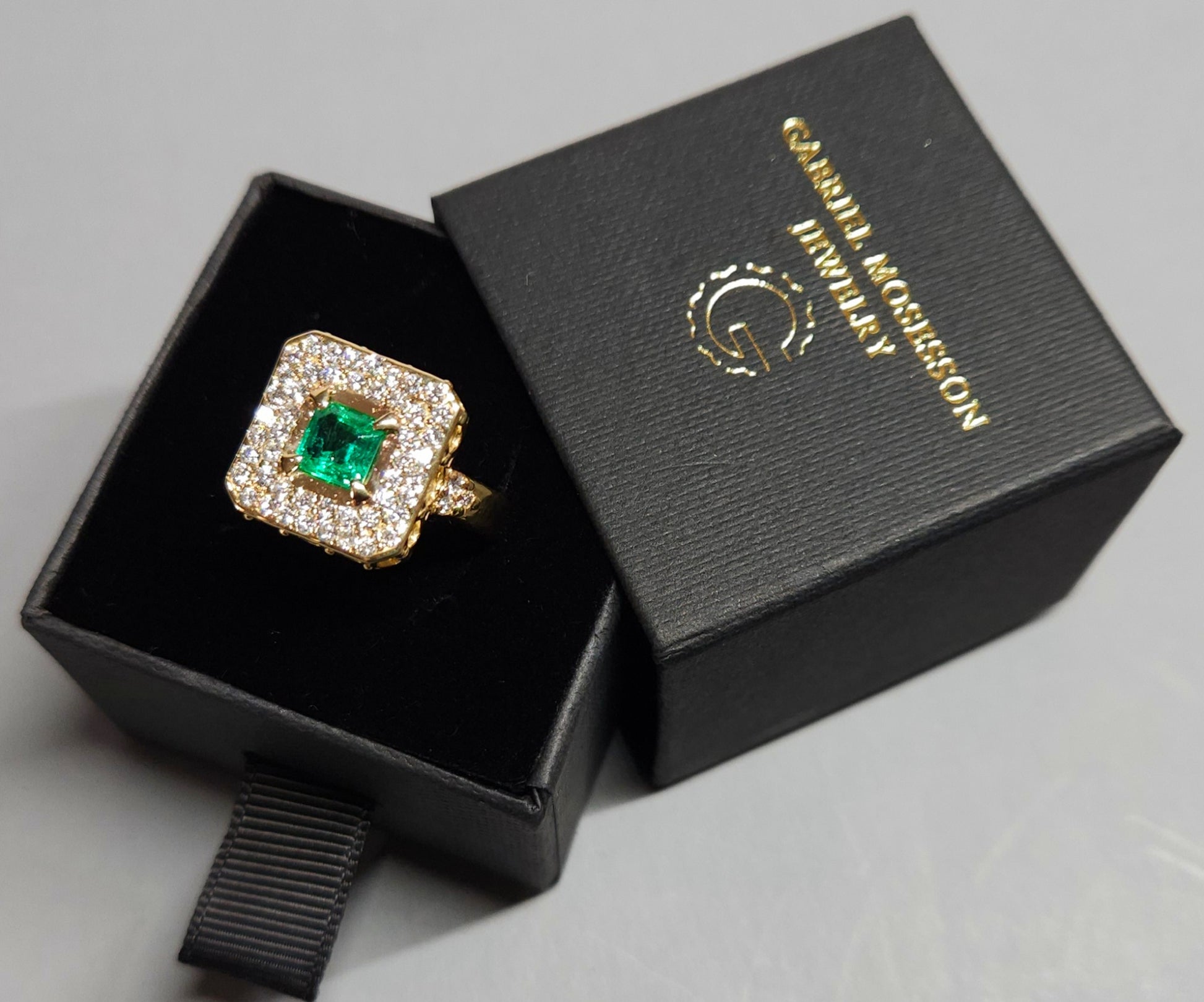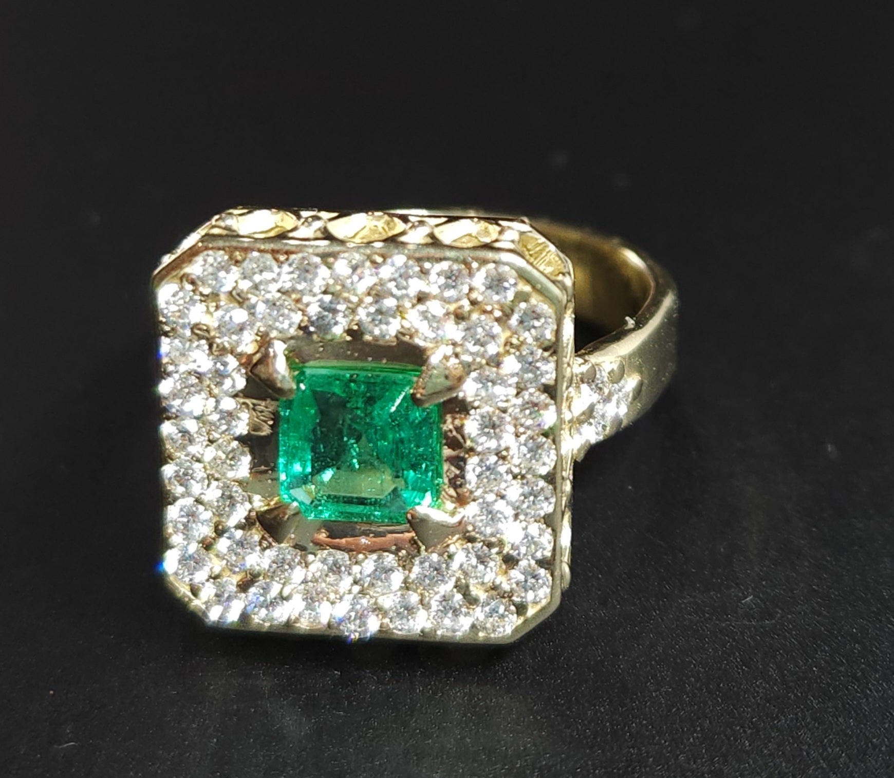 Emerald center stone set in solid 14k gold with CVD diamonds.