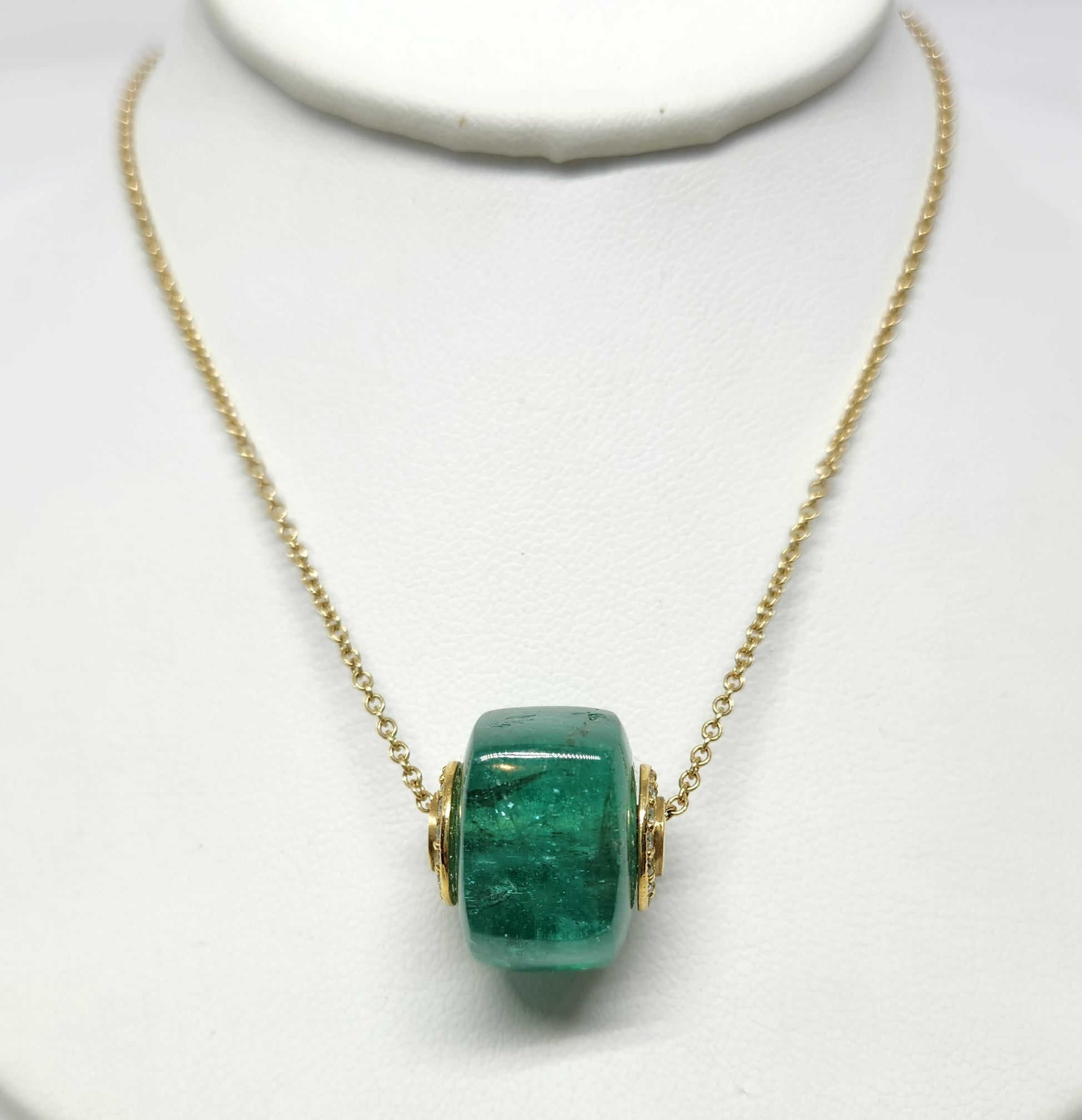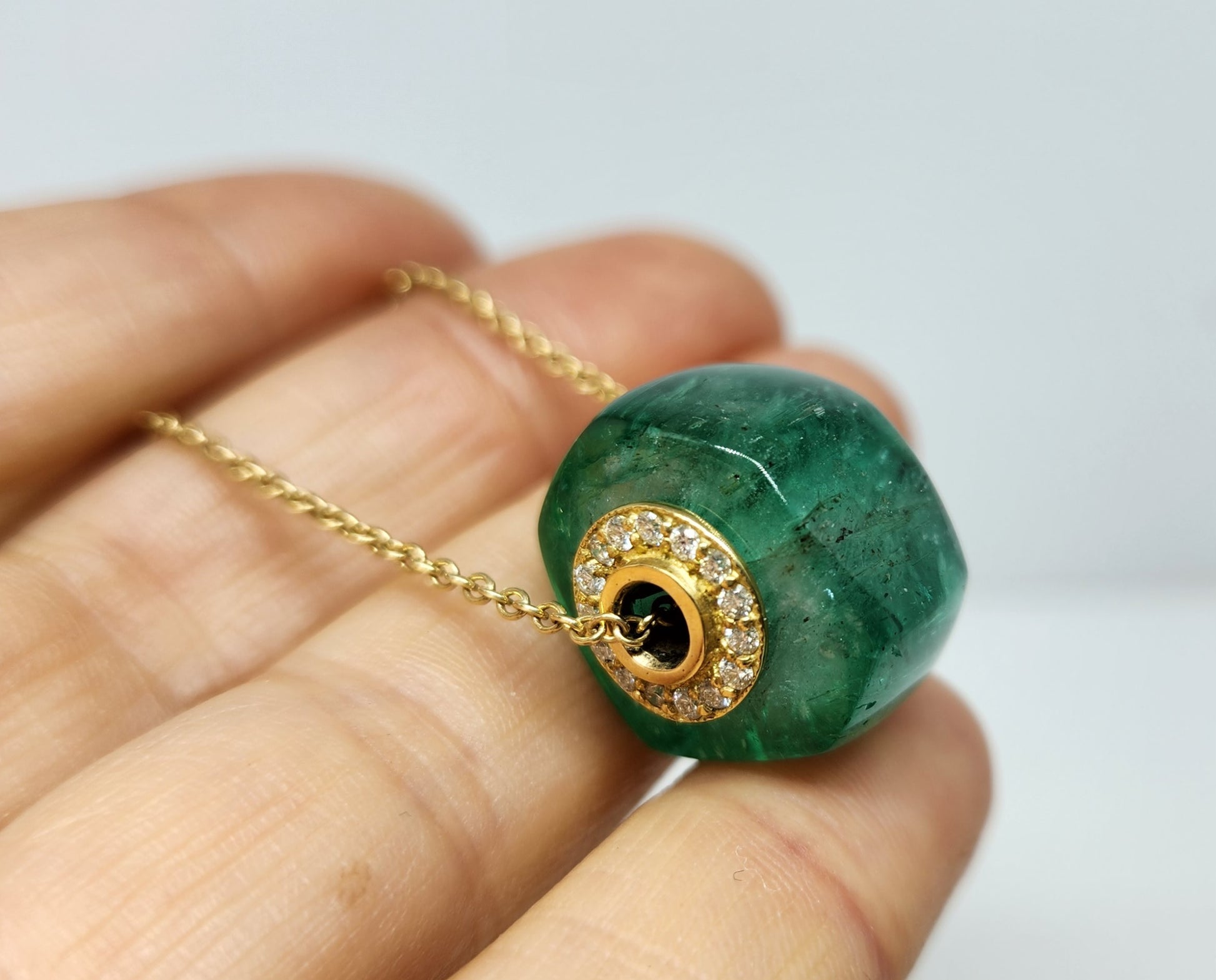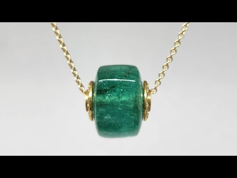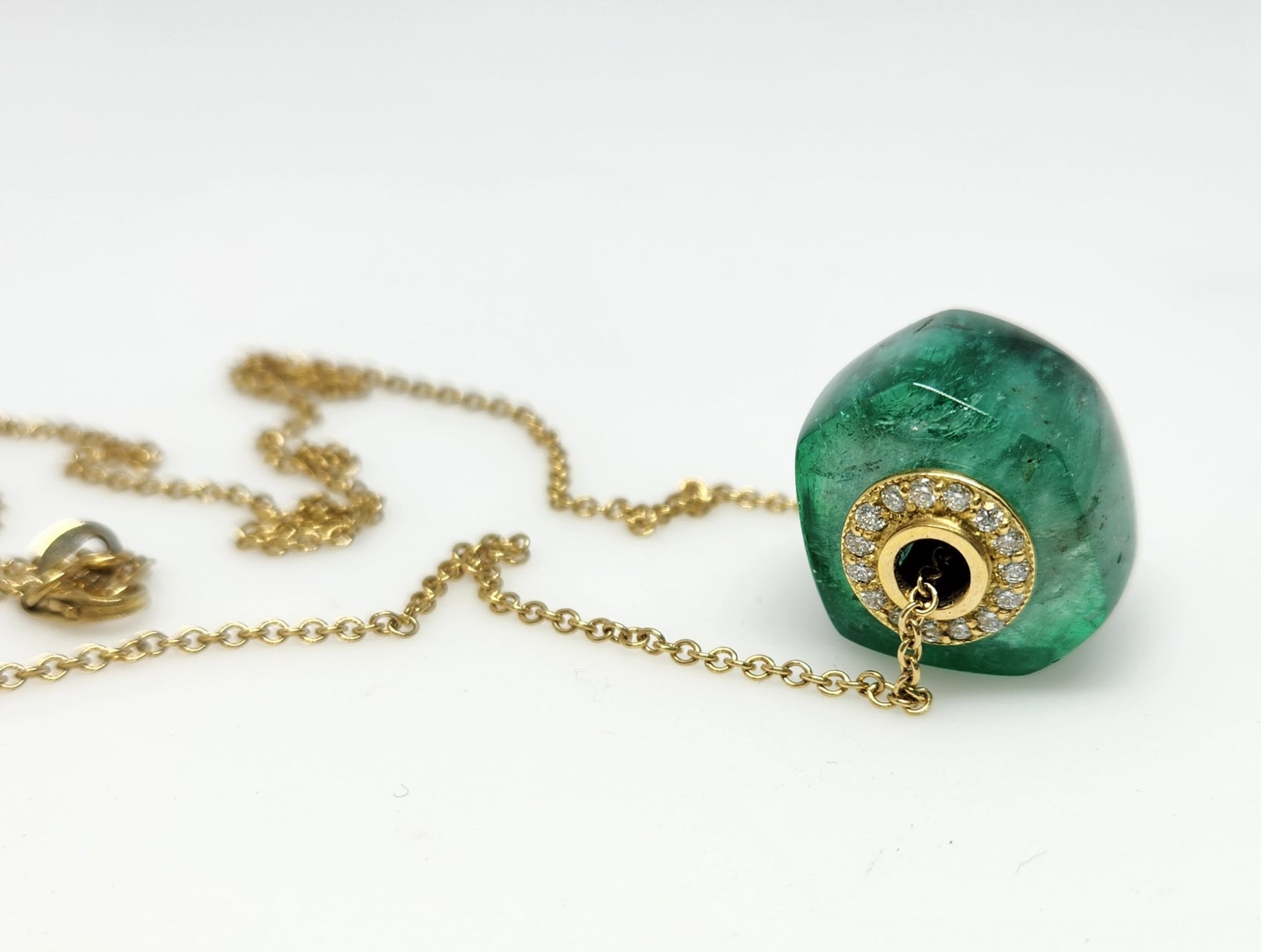 A unique emerald "wheel" set in a solid 14k Yellow Gold Pendant with diamond accents. The emerald hangs on a 18 inch solid gold chain.