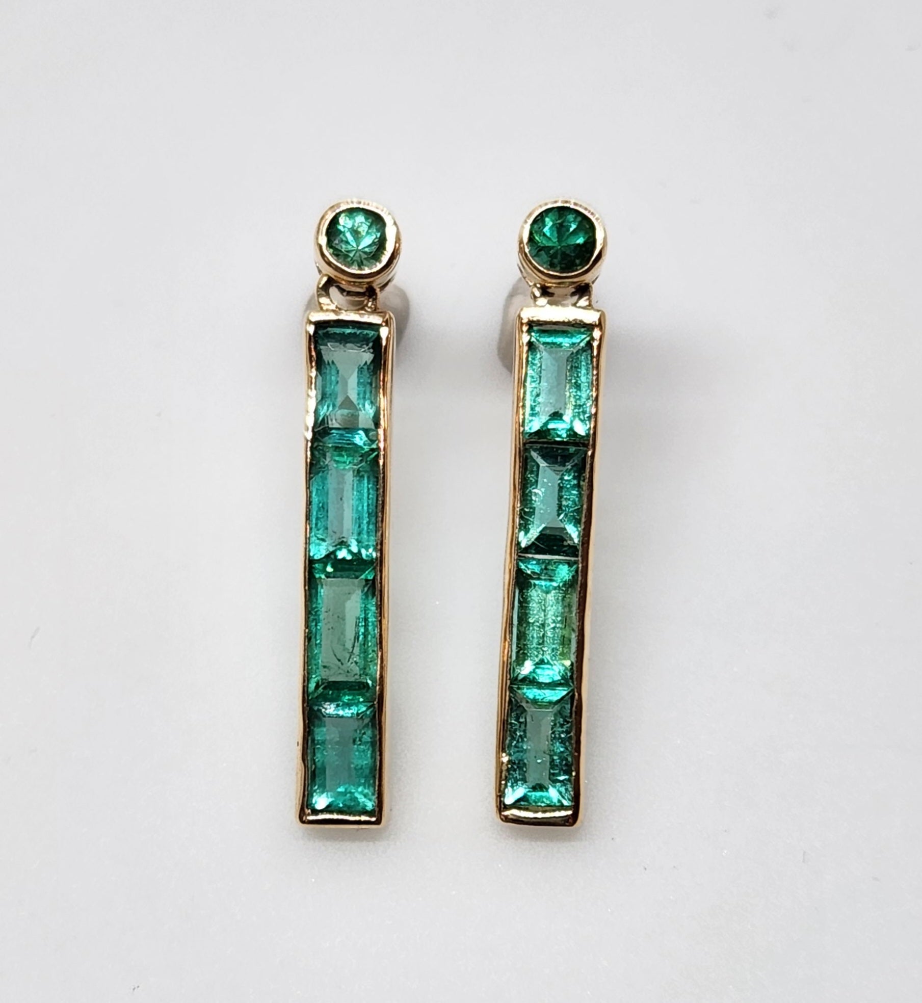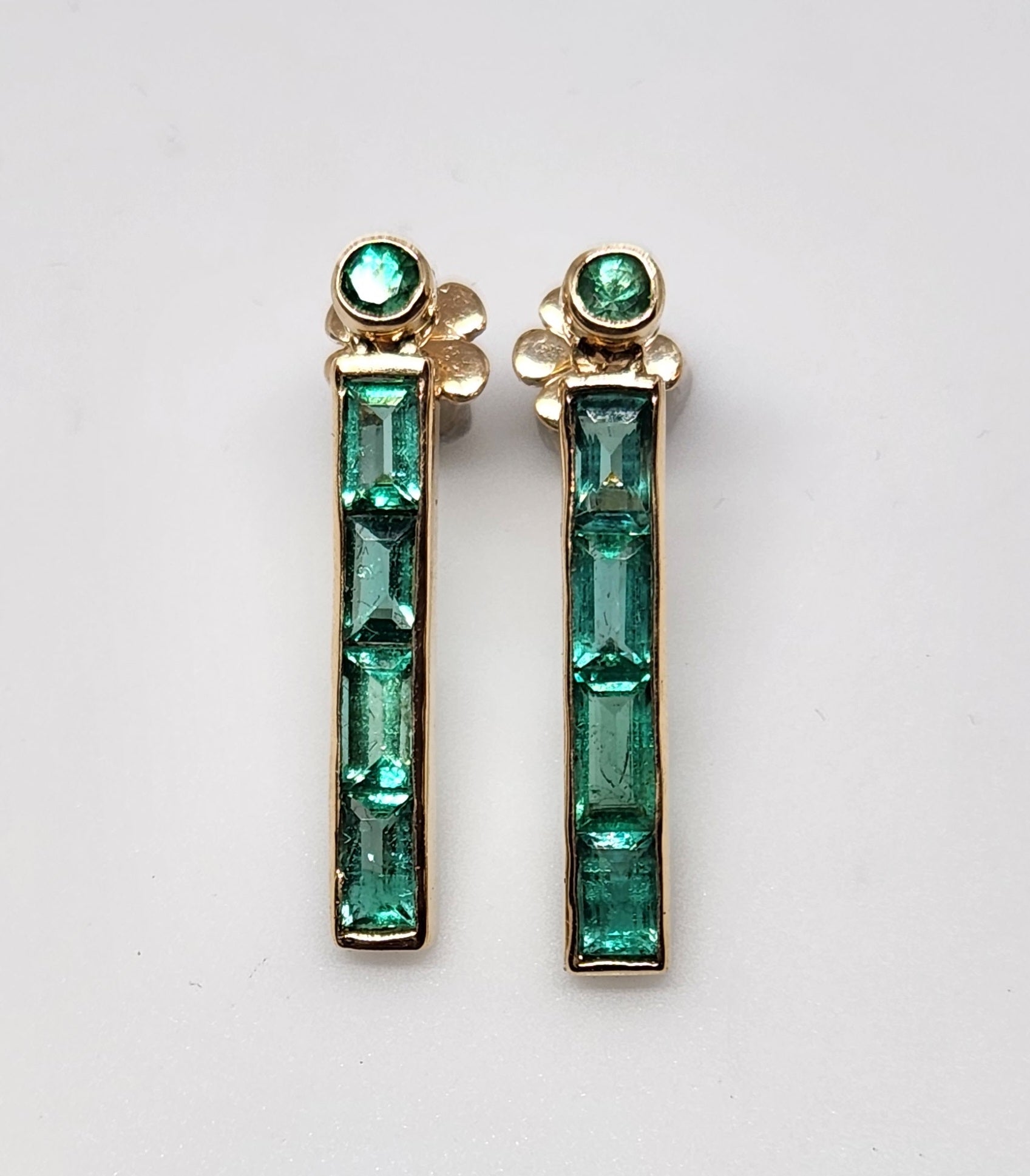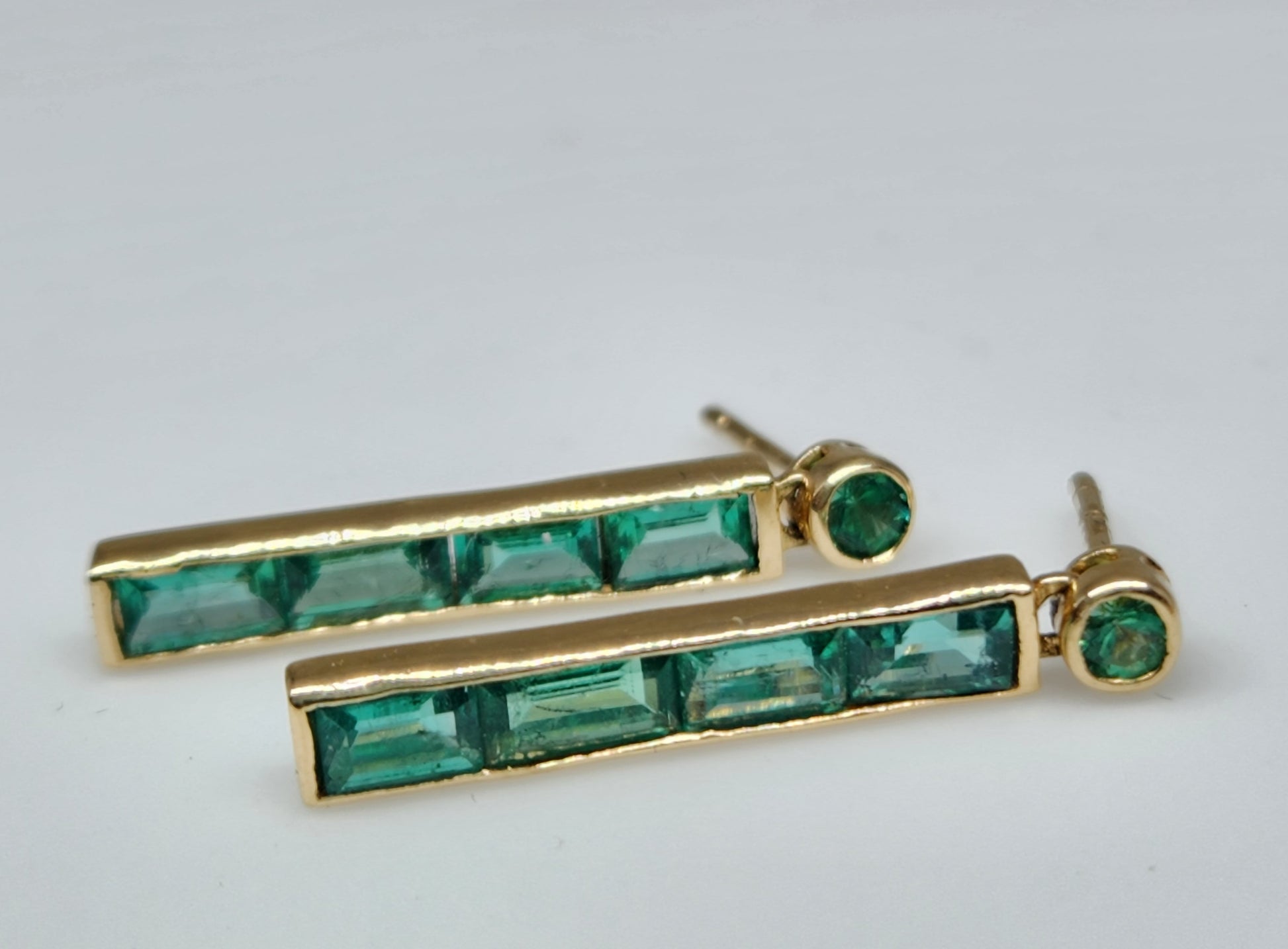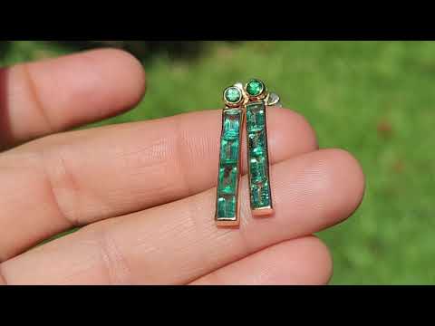 A pair of Emerald earrings, channel set in 14k Gold.