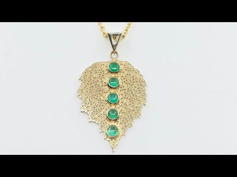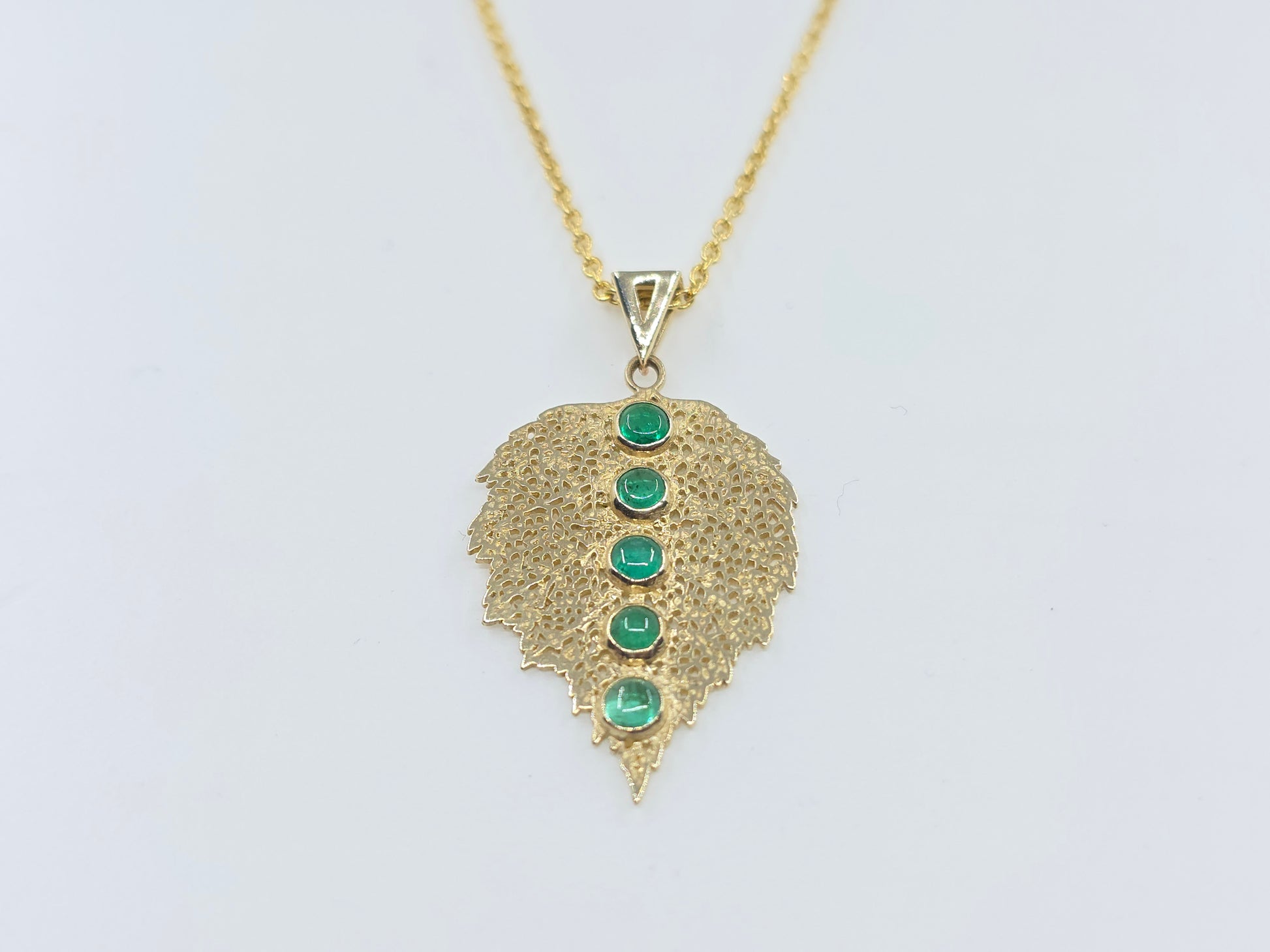A 14k yellow gold leaf pendant set with bright green emeralds.