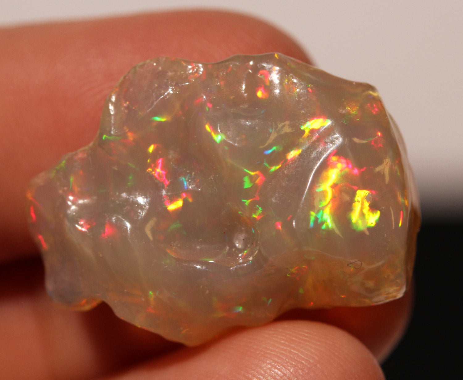 A semi-clear hand carved Ethiopian Opal, 100% Natural, with colorful fire patterns in red, orange and green.