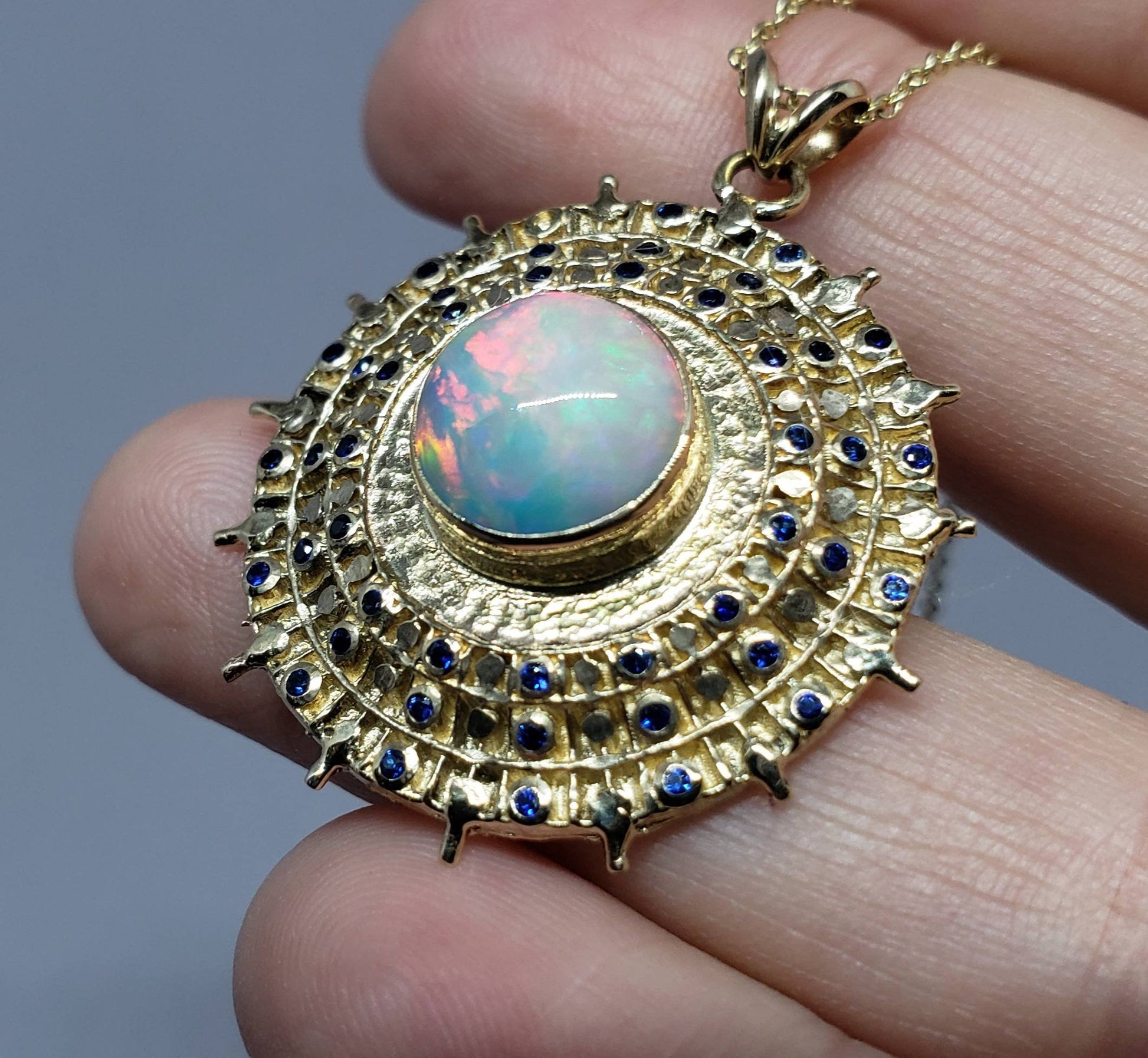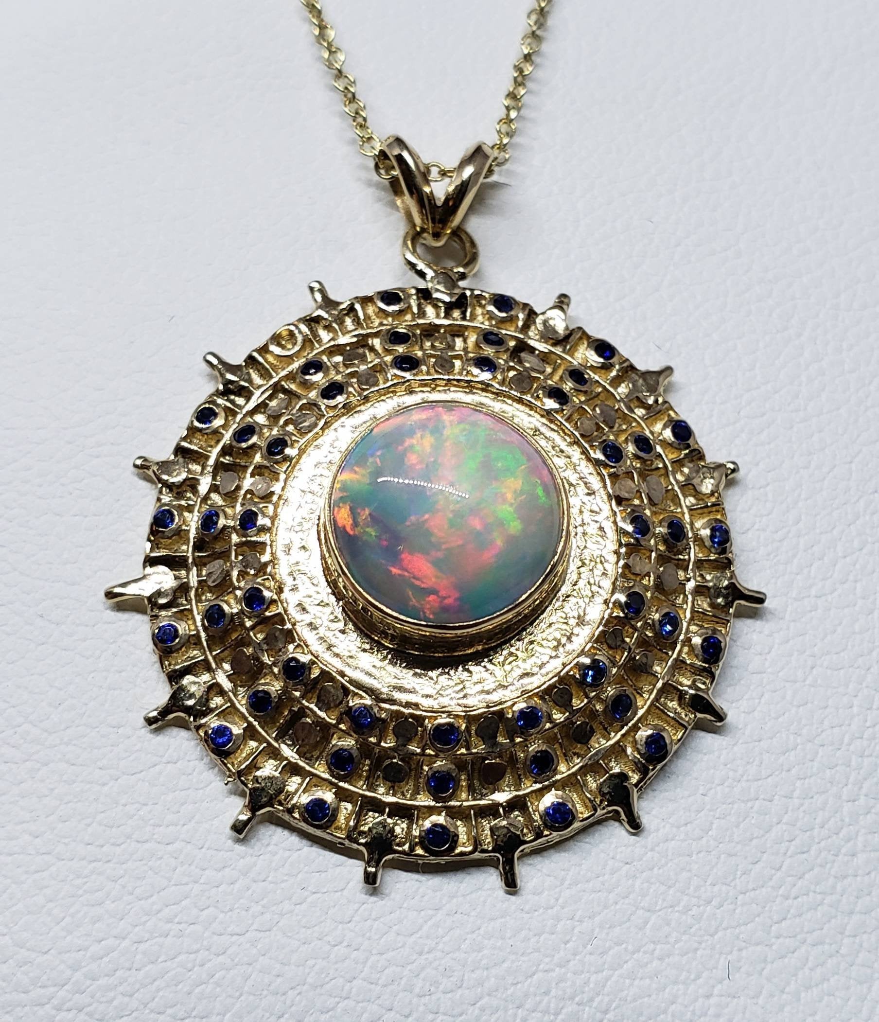 Chain: 18 Inch Gemstones: Ethiopian Opal, blue Sapphire accent stones Pendant Size: 17 X 17mm Metal: 14 karat Yellow Gold We offer custom jewelry designs. Let us create a one of a kind piece just for you! Please browse our collection of loose Natural Opals, and contact us for more details.
