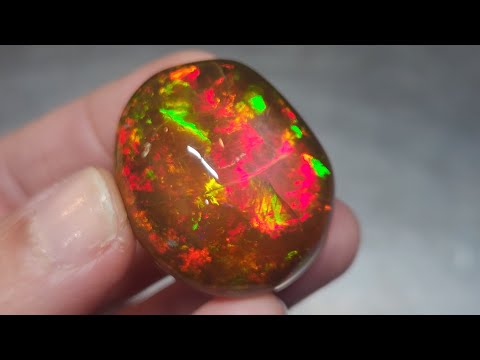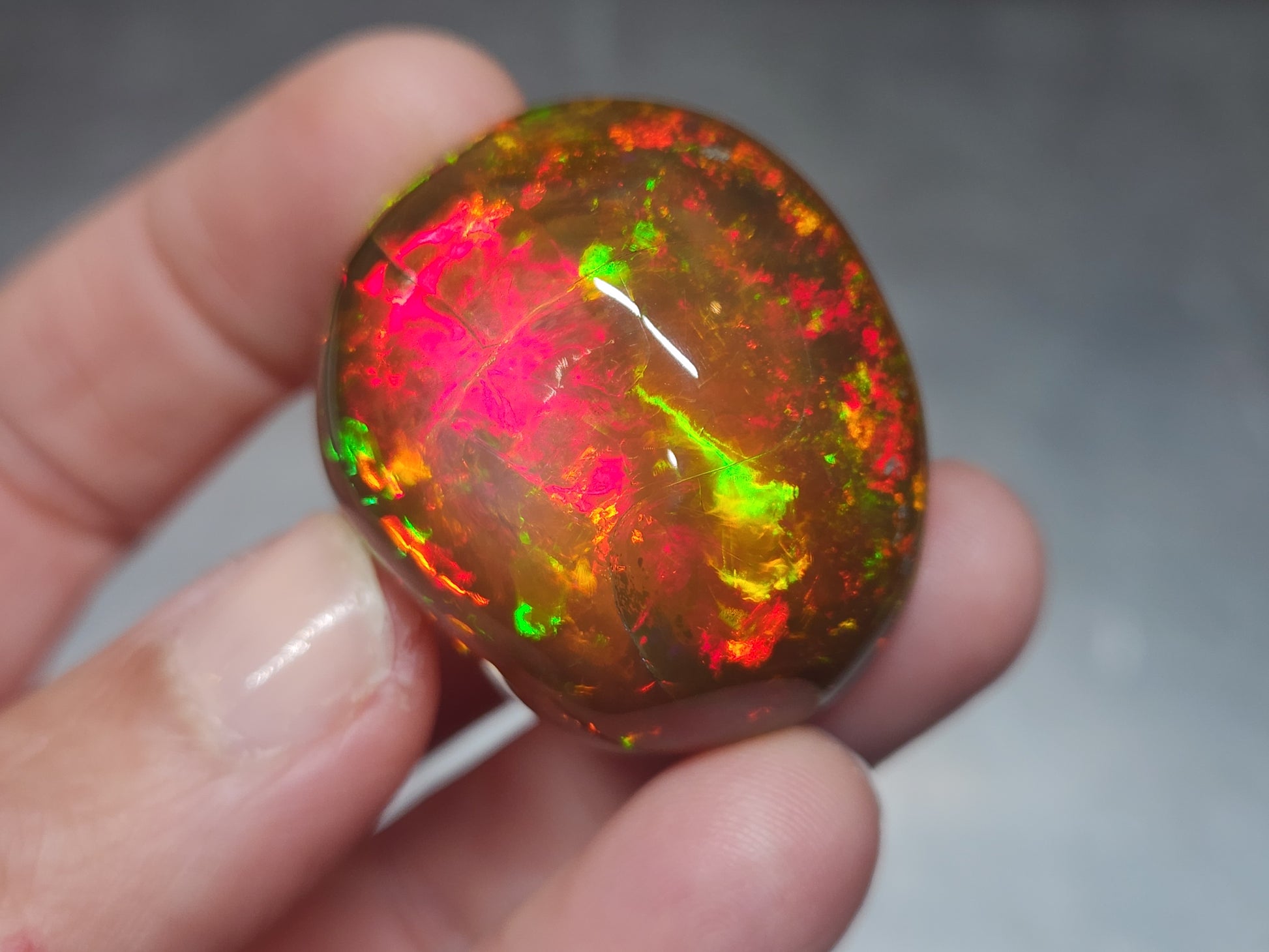 This large Ethiopian opal specimen has been cut and polished with intense ultra-bright fire pattern in flashes of red, green, and gold colors.