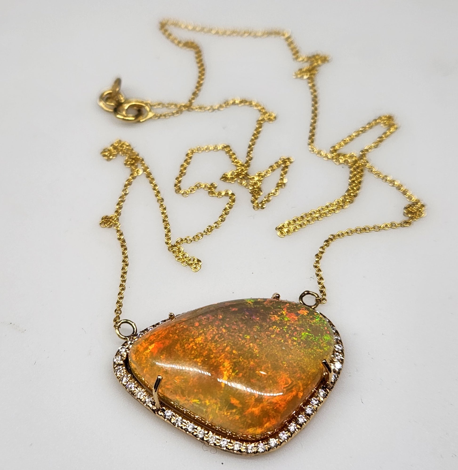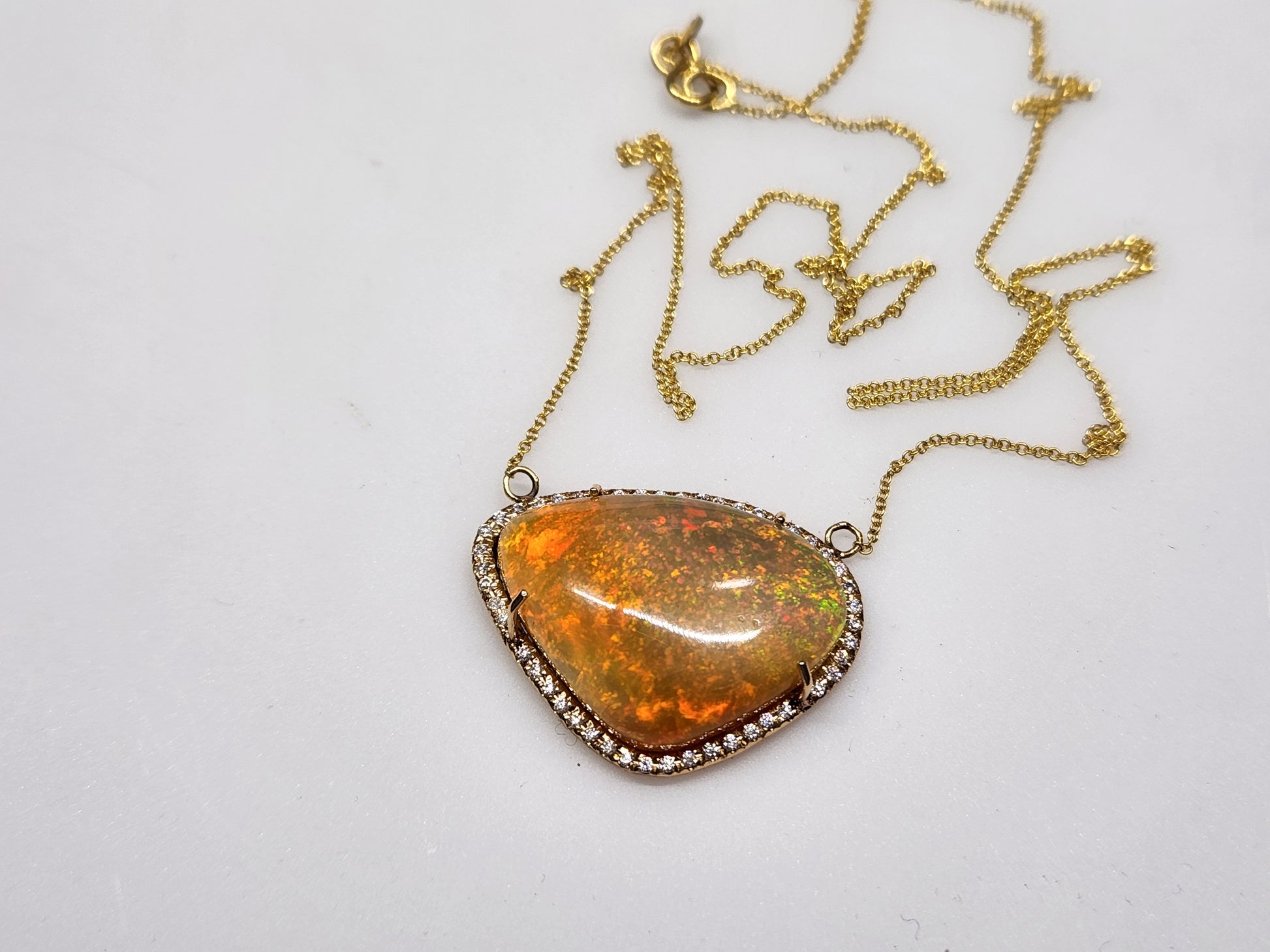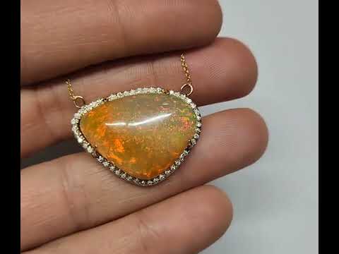 A colorful orange fire opal, with red, green and yellow fire colors, set in 14k yellow gold and white moissanite accent stones, with a solid 14k gold chain.