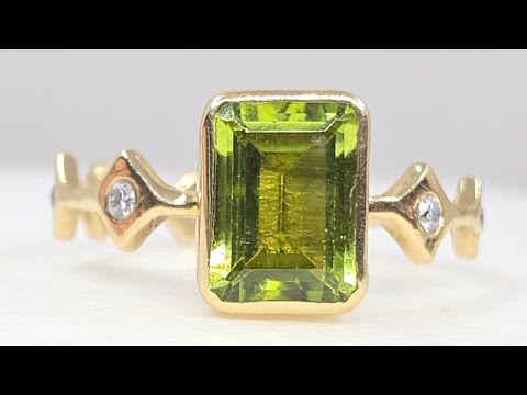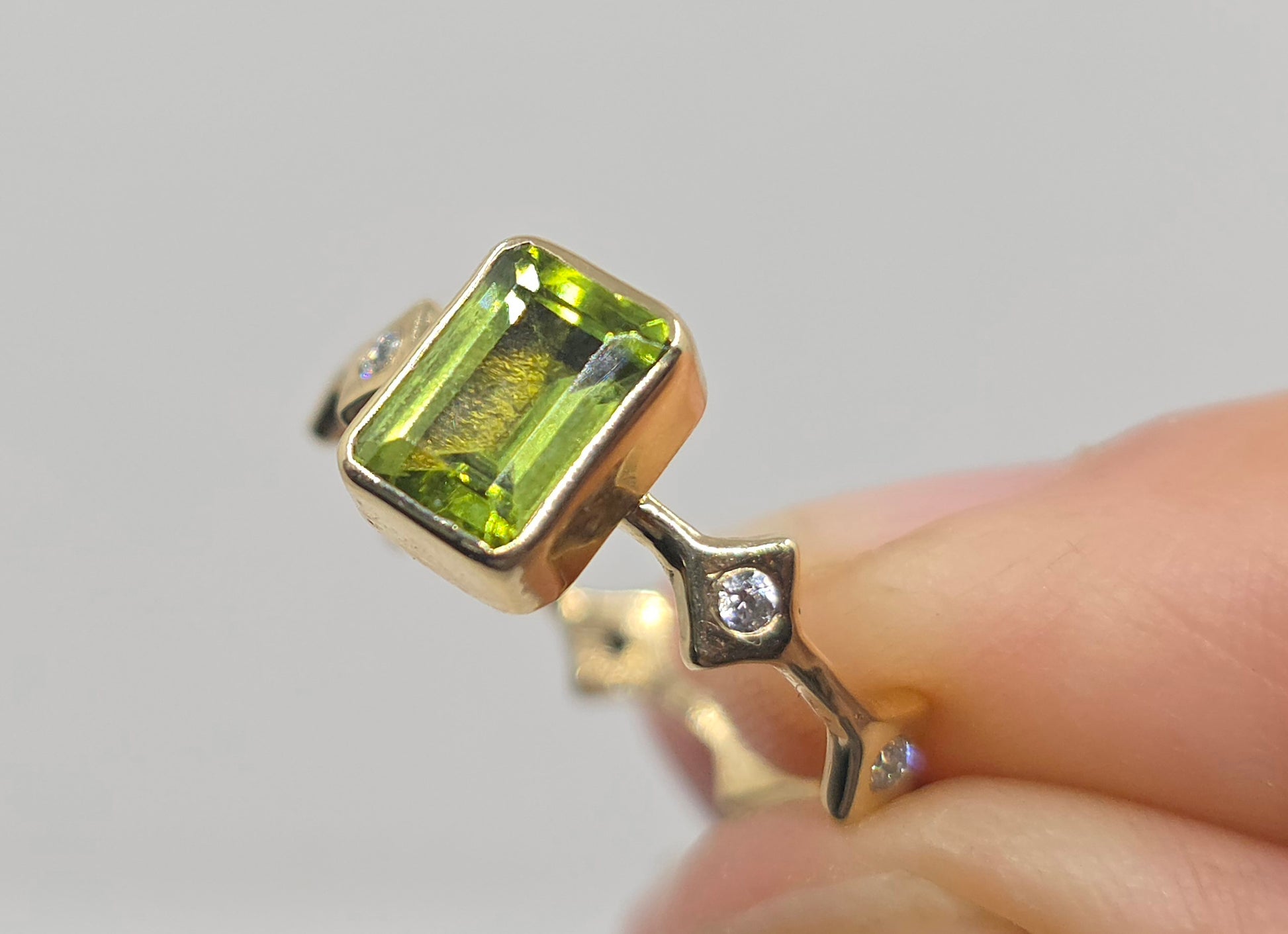 A green peridot set in a 14k solid gold band, with moissanite accent stones. Two solid gold stacking bands are available to add to this single ring (see available options)