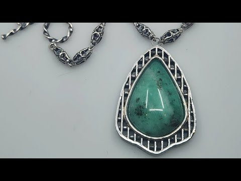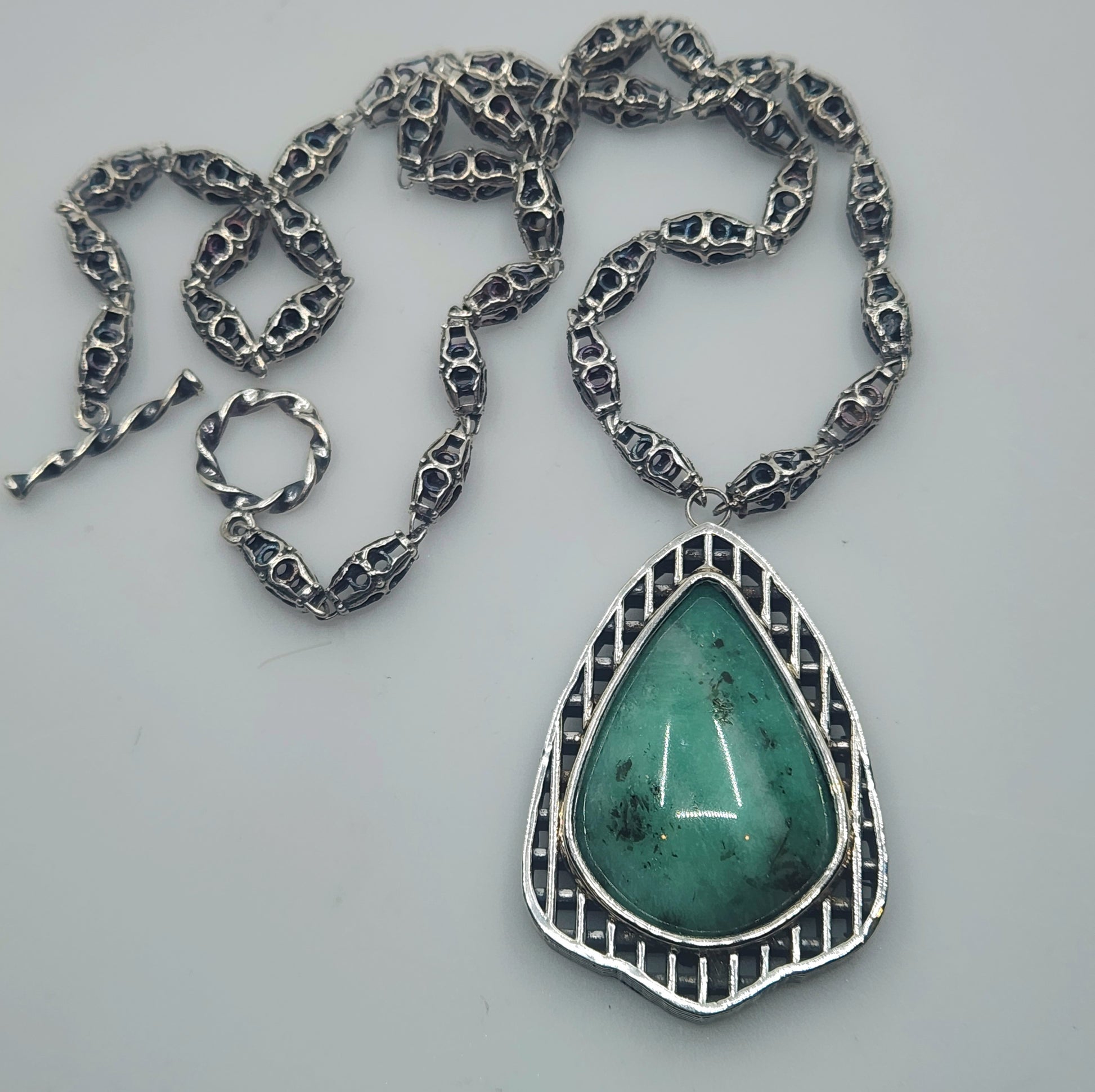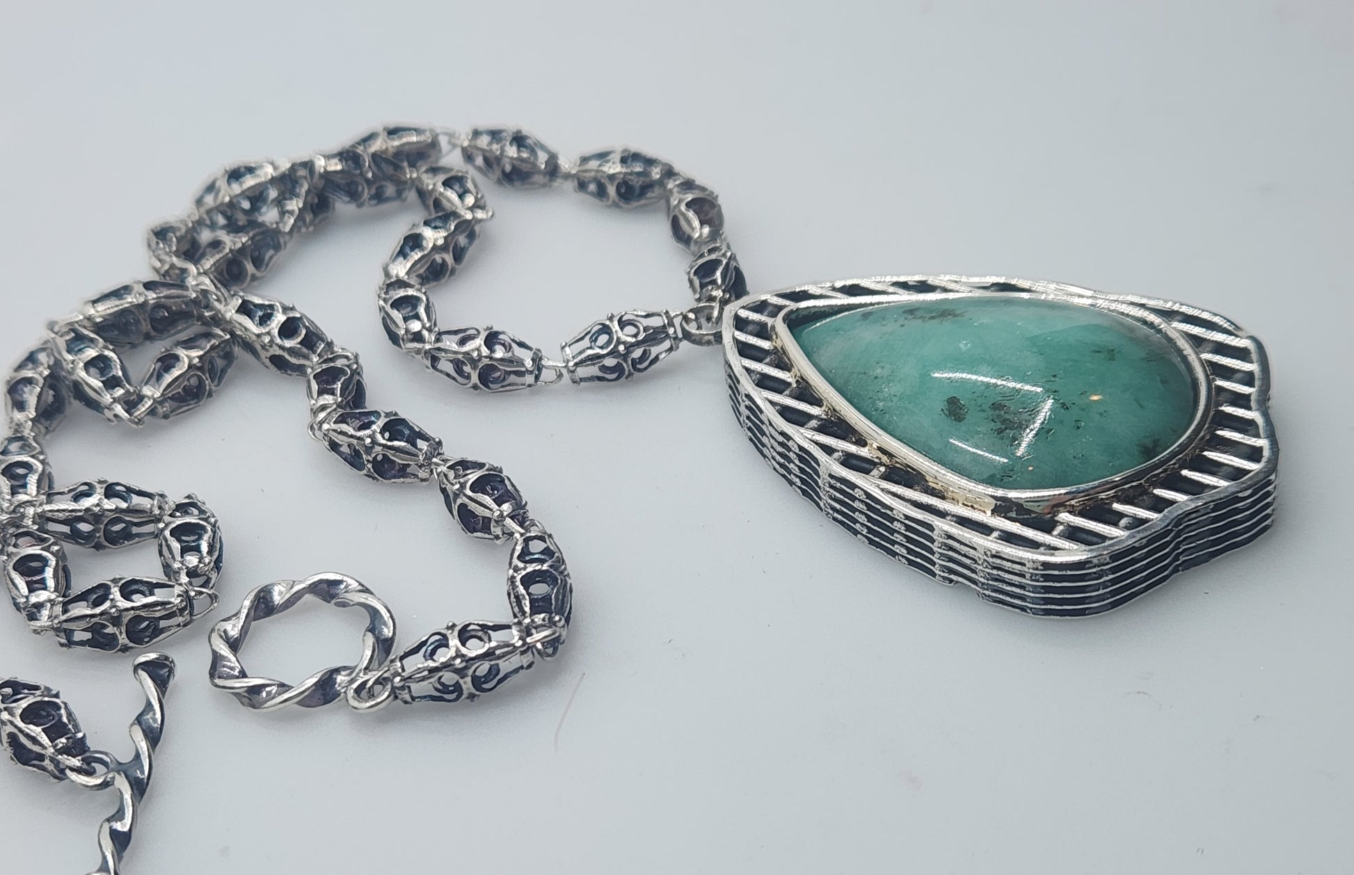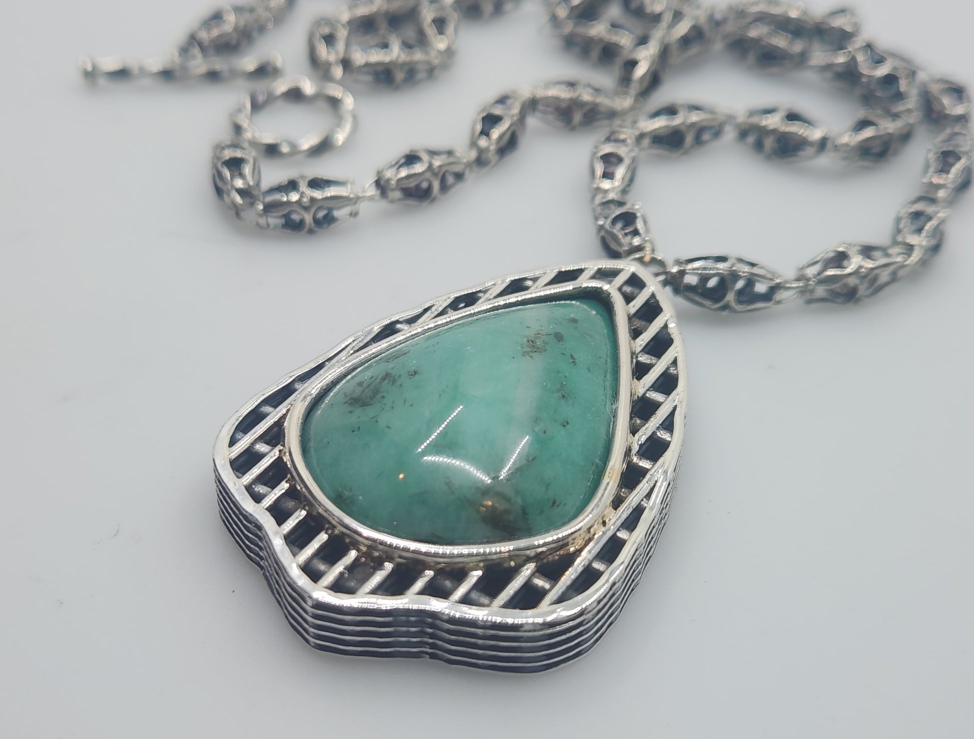 A large, natural carved and polished emerald set in a sterling silver pendant, on a custom made sterling silver link chain.