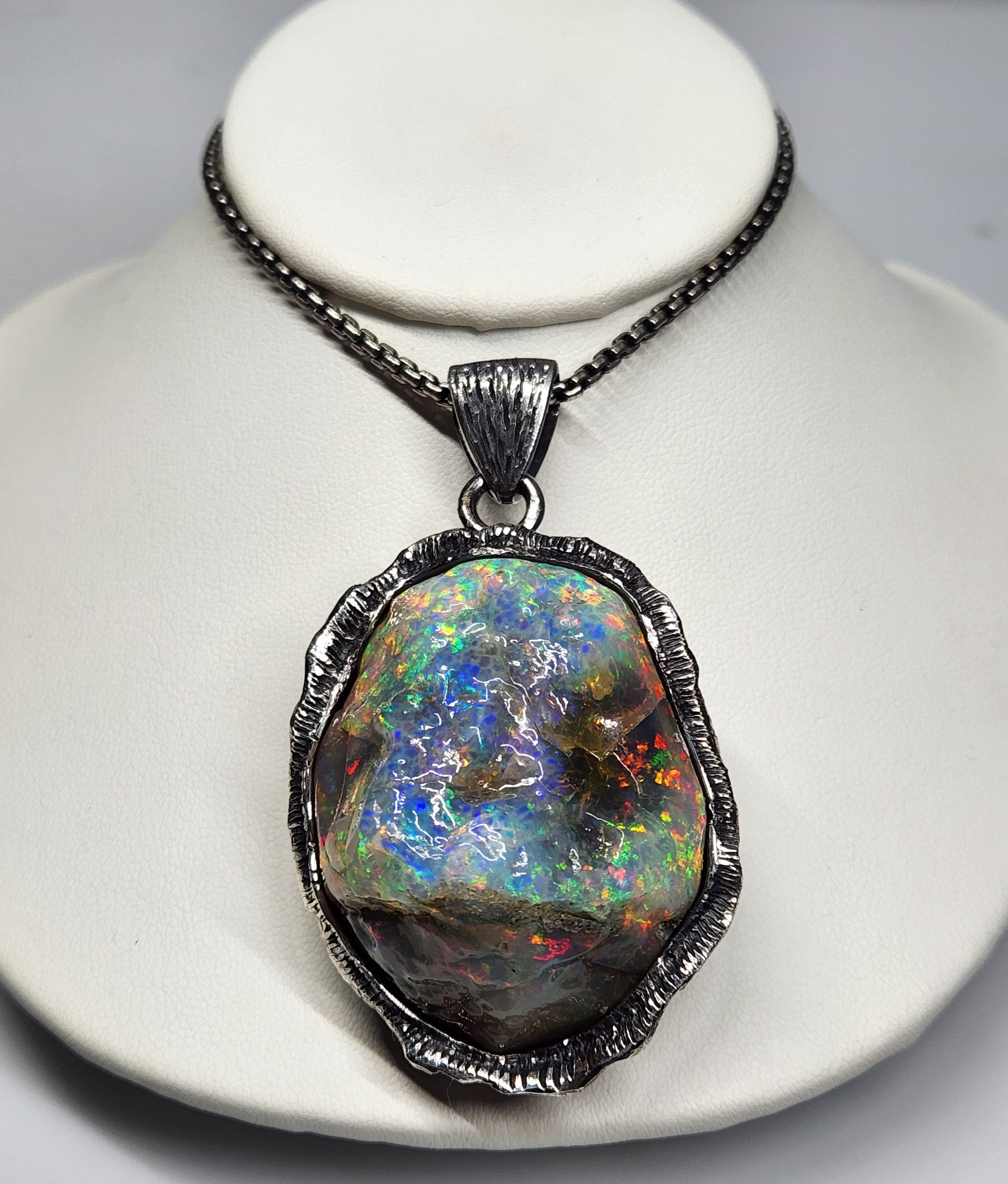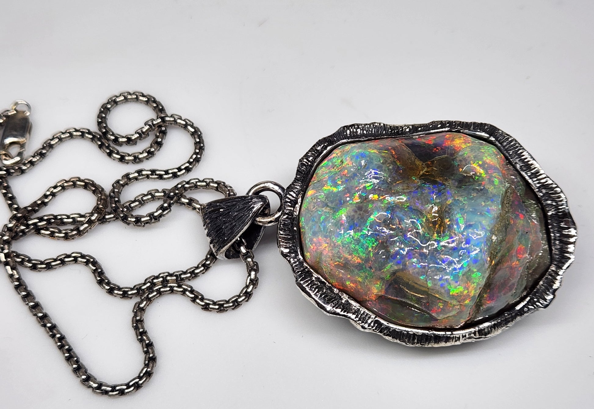 A huge, natural carved opal specimen with bright flashes of color, set in a sterling silver pendant, on a 20inch sterling silver chain.