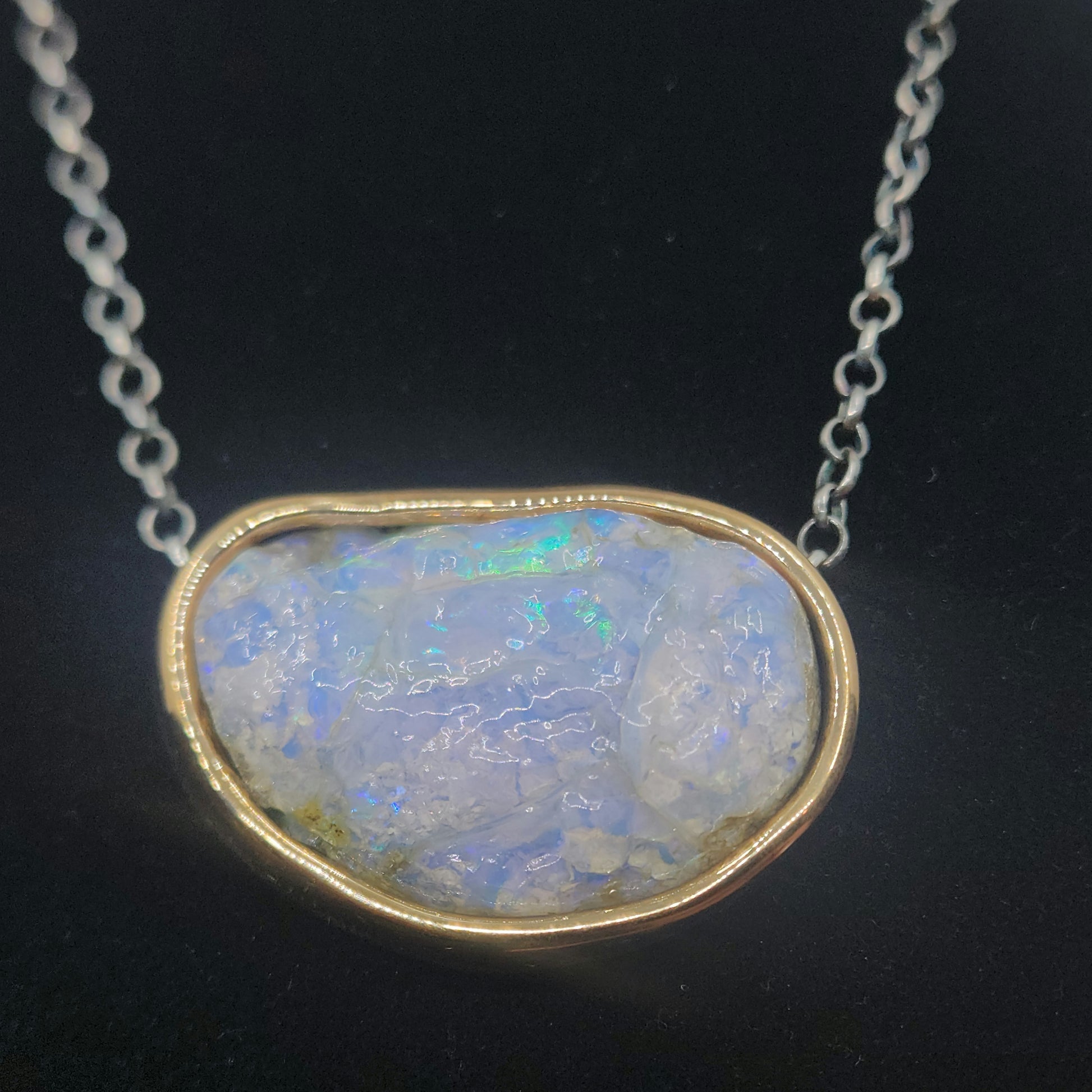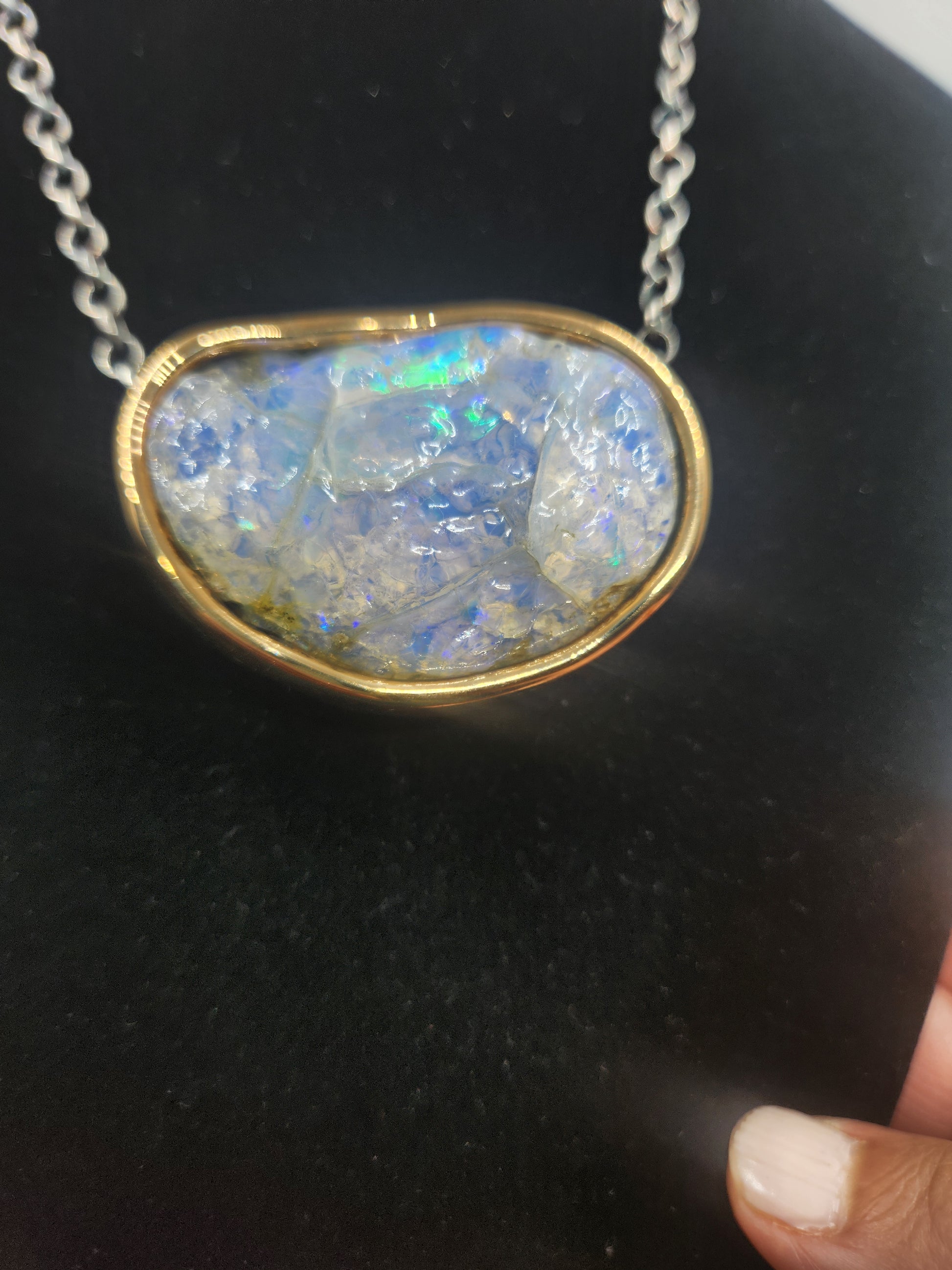 A large, natural carved opal specimen with bright flashes of color, set in a sterling silver pendant, on a 20inch sterling silver chain.