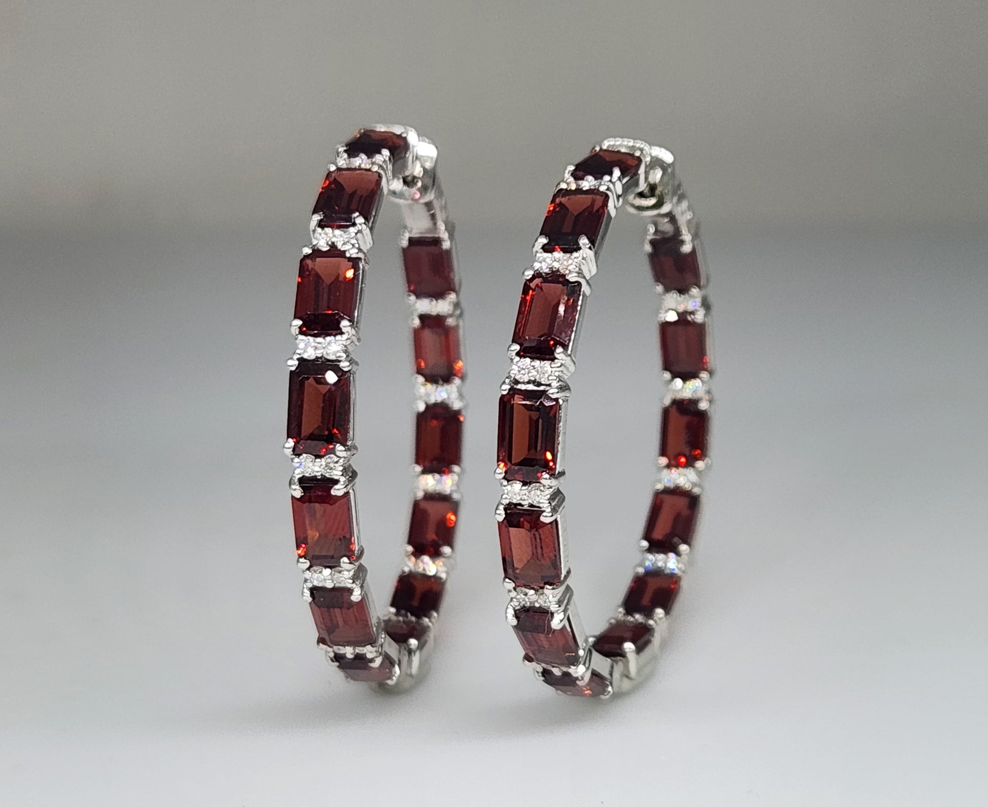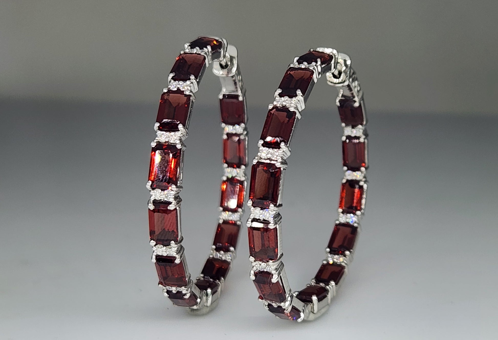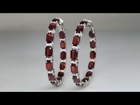 A pair of red garnet gemstone sterling silver hoop earrings.