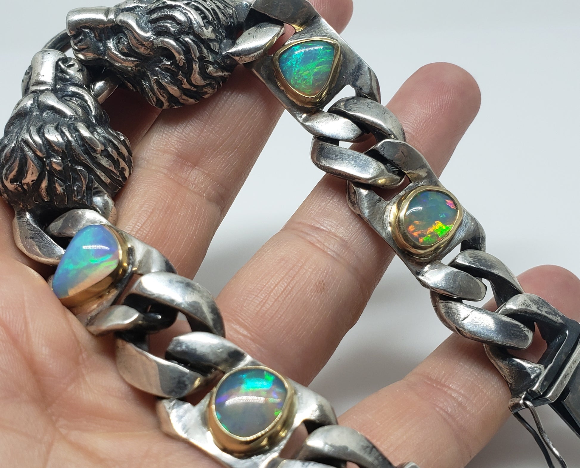 This Sterling Silver and 14k Gold link bracelet has 4 colorful opals. The lion heads have diamond eyes.