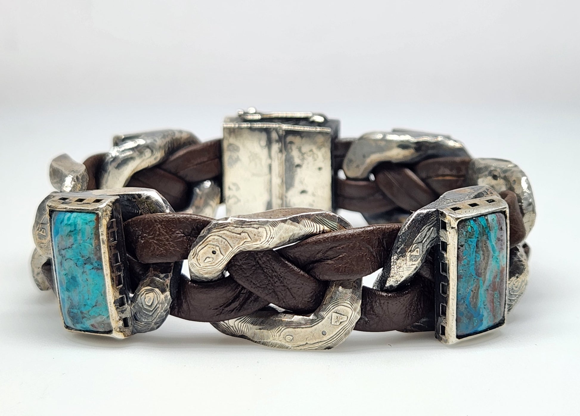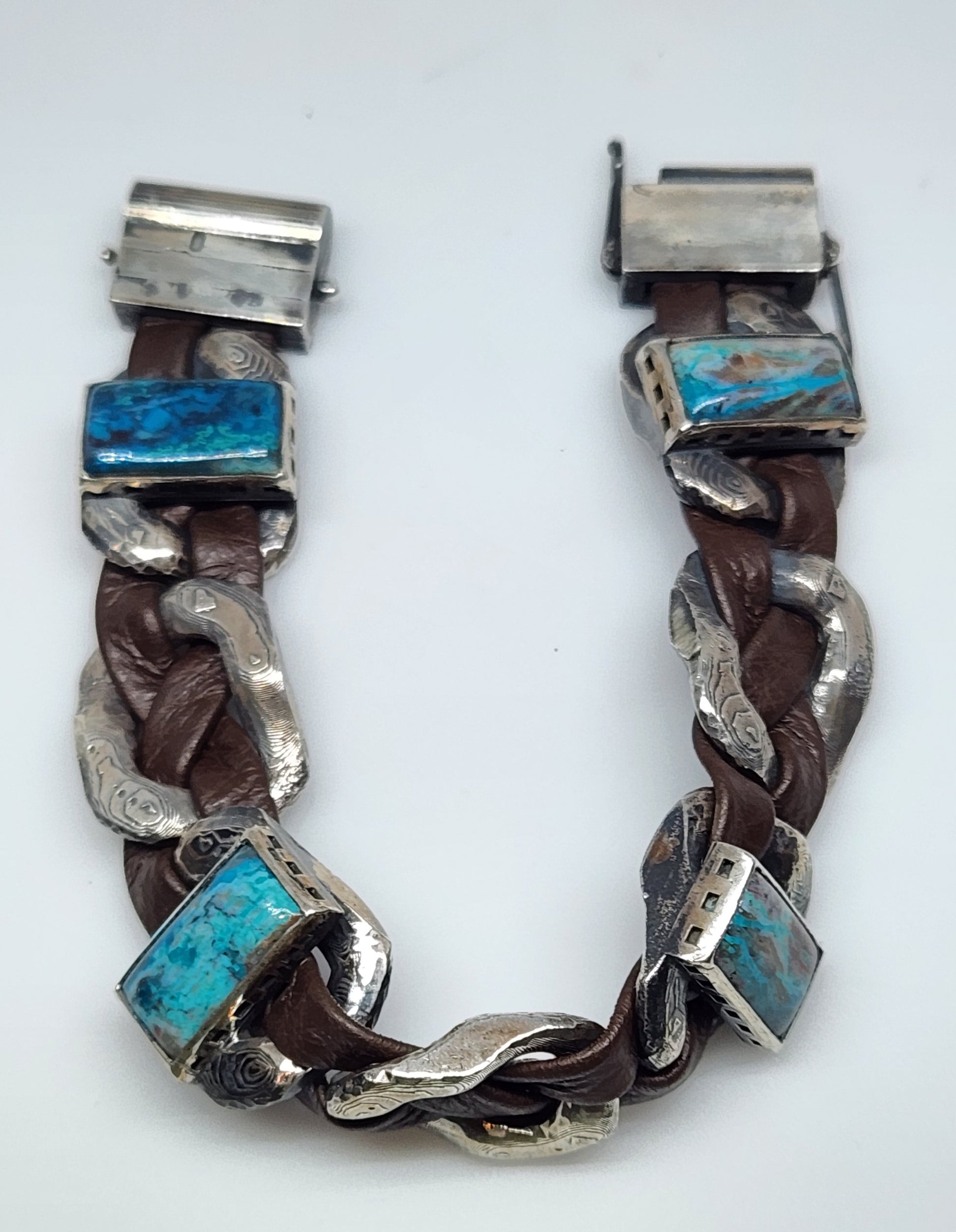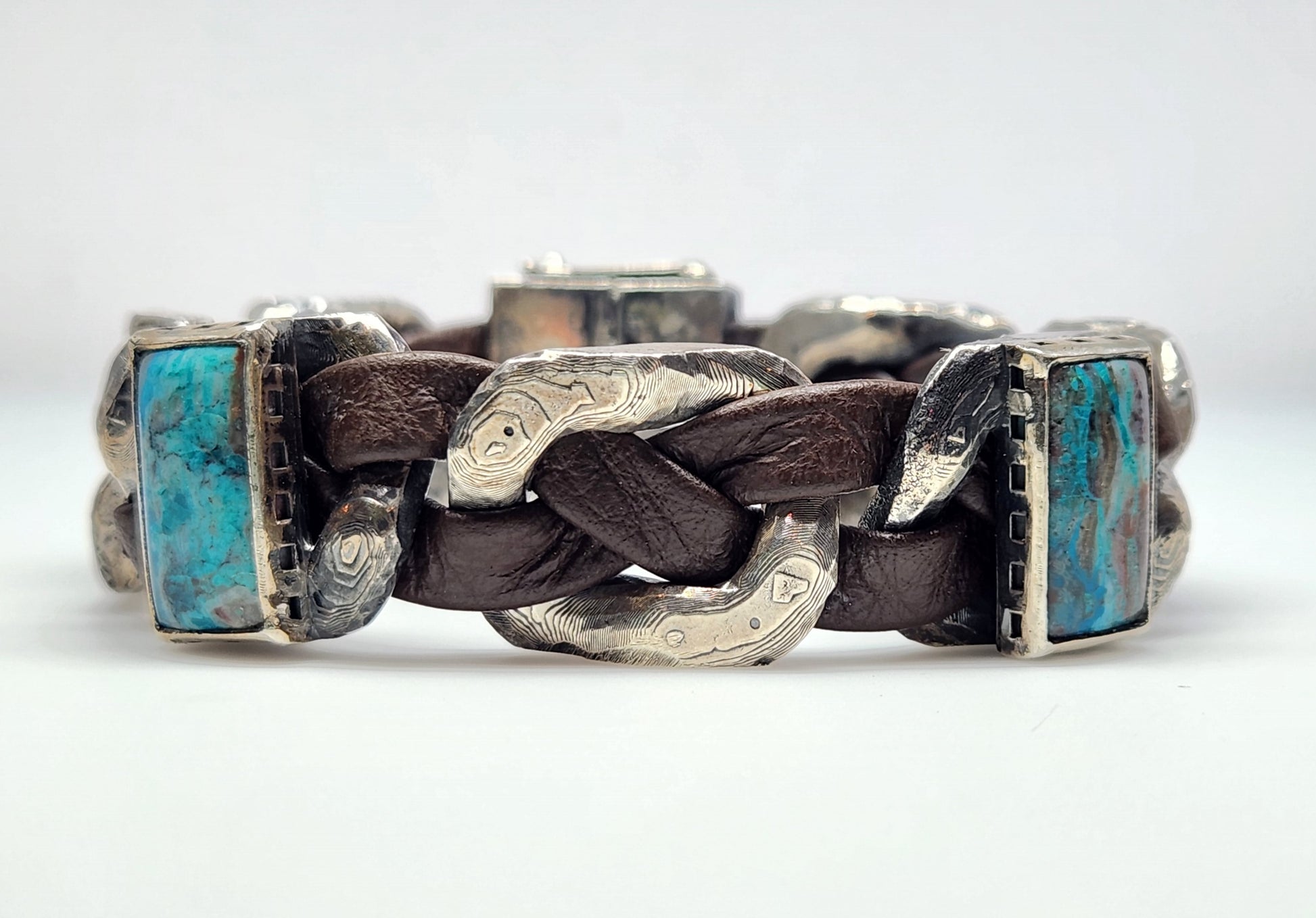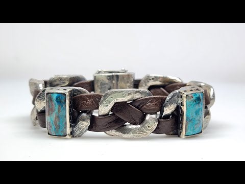 MADE TO ORDER - Men's Rustic Silver & Leather Blue Chrysocolla Gemstone Link Bracelet